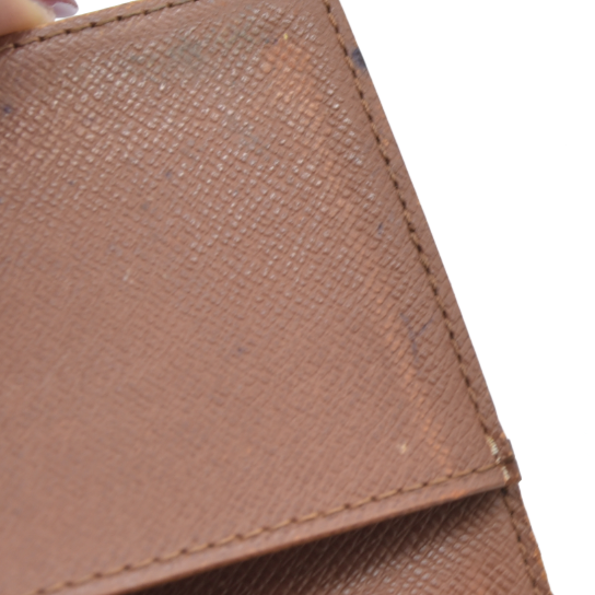 The exterior is rubbed with scratches. There are loose stitches around the folding area. There are rubbed marks on the inside. There are stains on the inside. The inside of pocket is peeled.