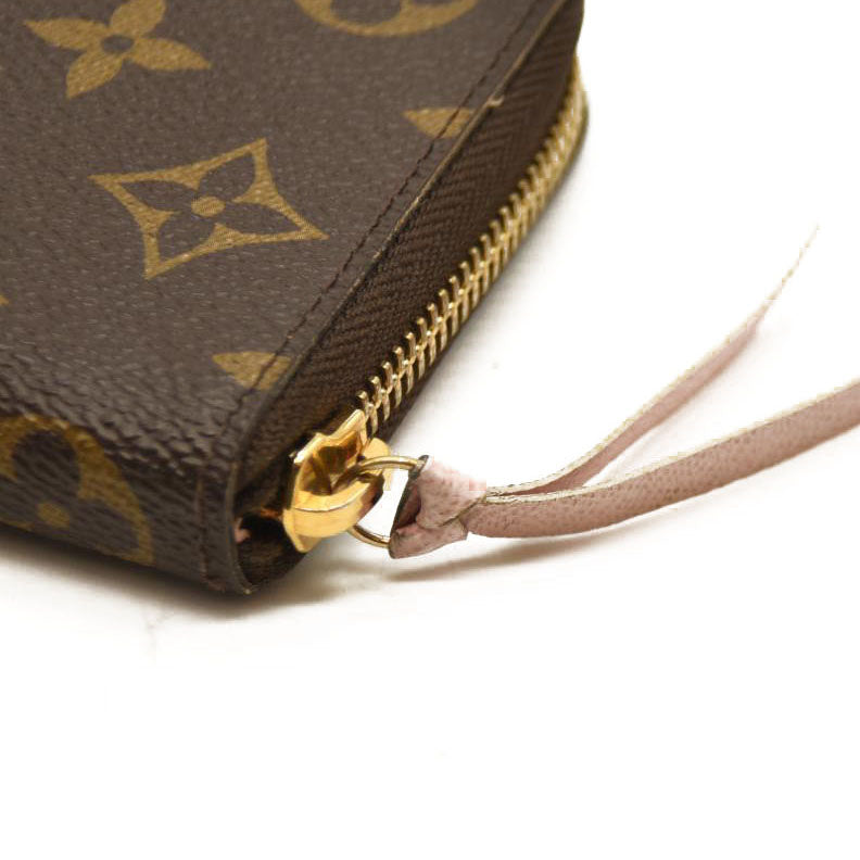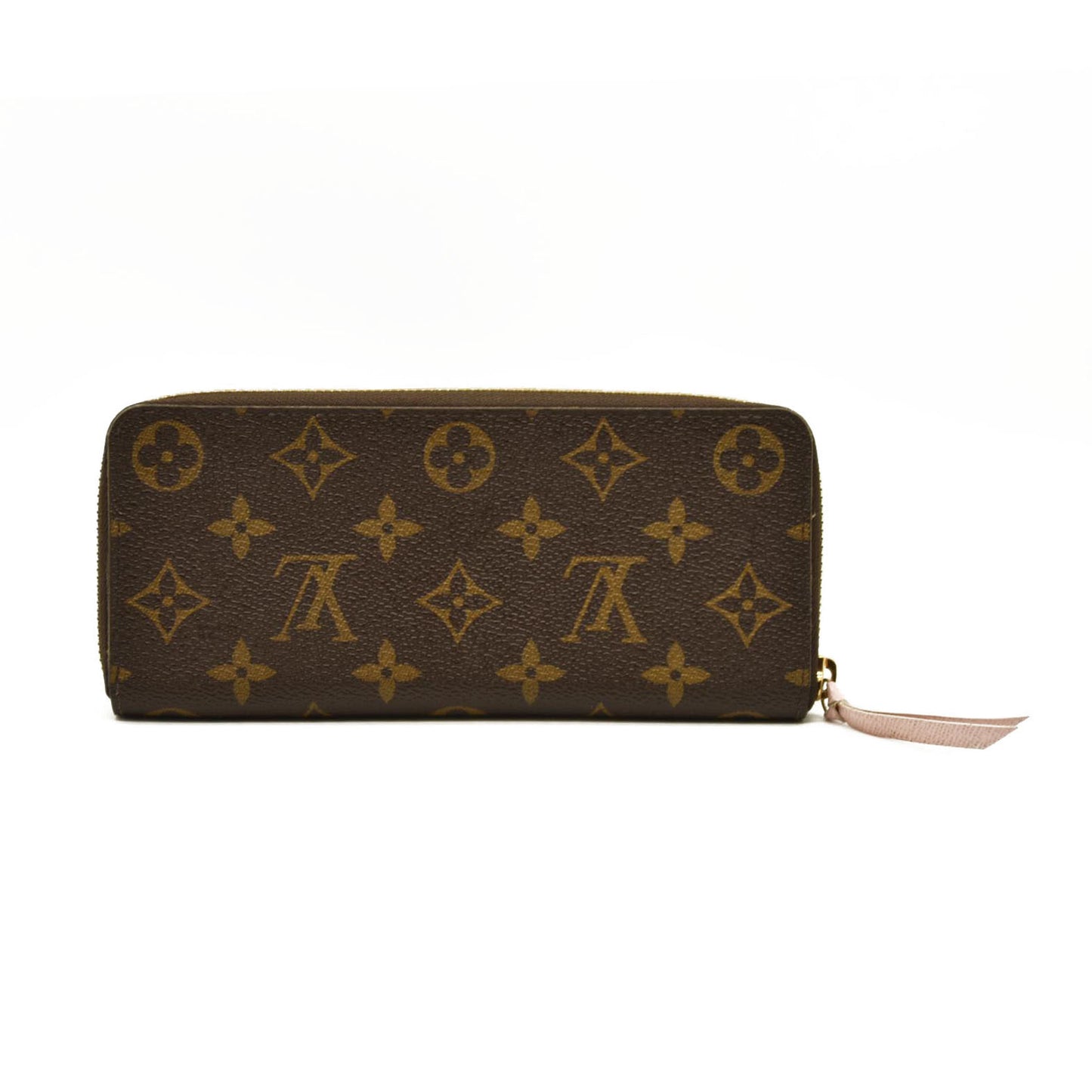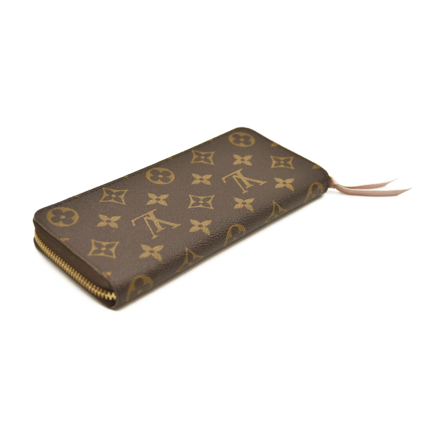 This is an authentic LOUIS VUITTON Monogram Clemence Wallet in Rose Ballerine. The wallet is crafted of traditional monogram toile canvas. The wallet opens with a polished brass wrap-around zipper to a partitioned light pink cross-grain leather interior with card slots, patch pockets, and a central zipper pocket.