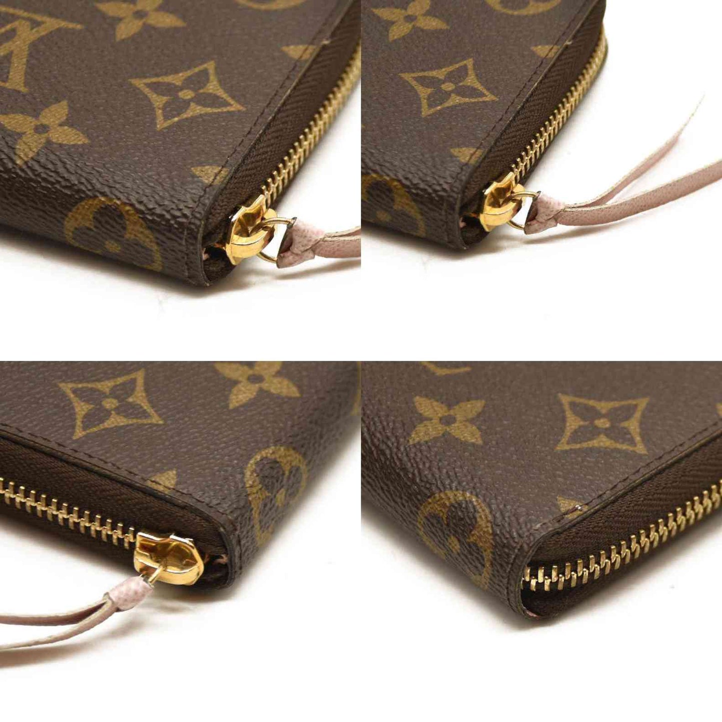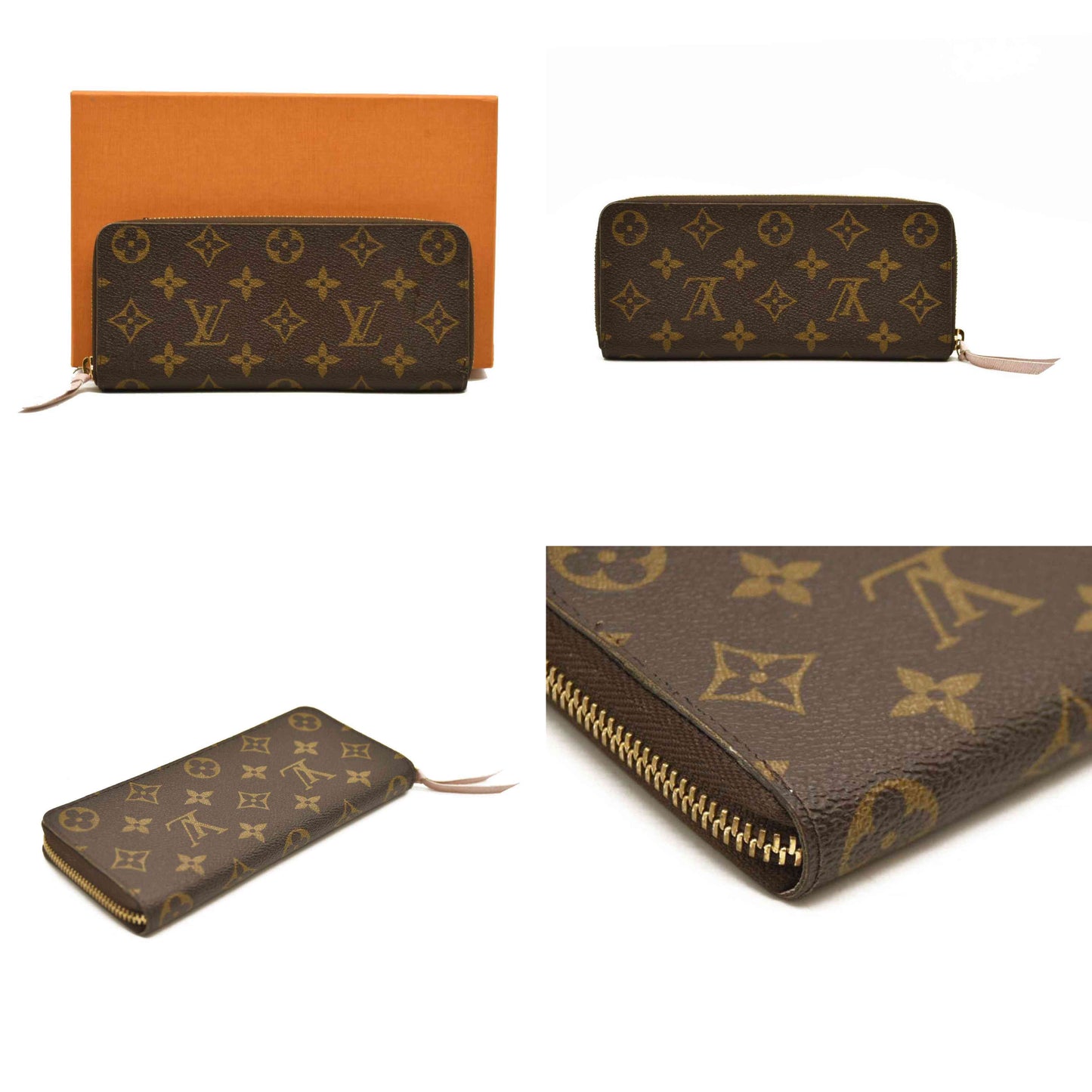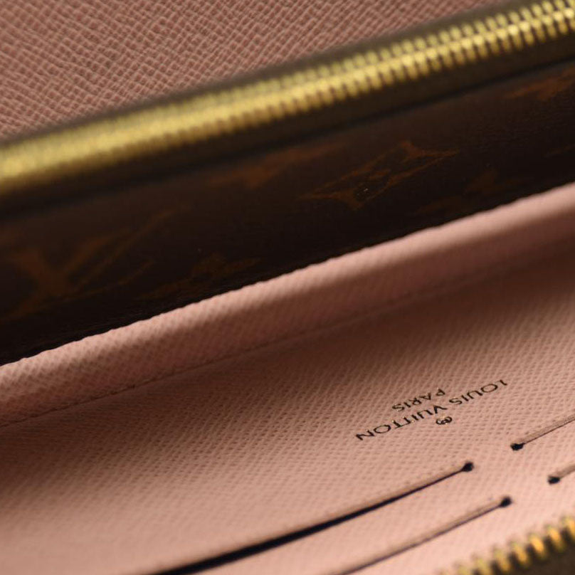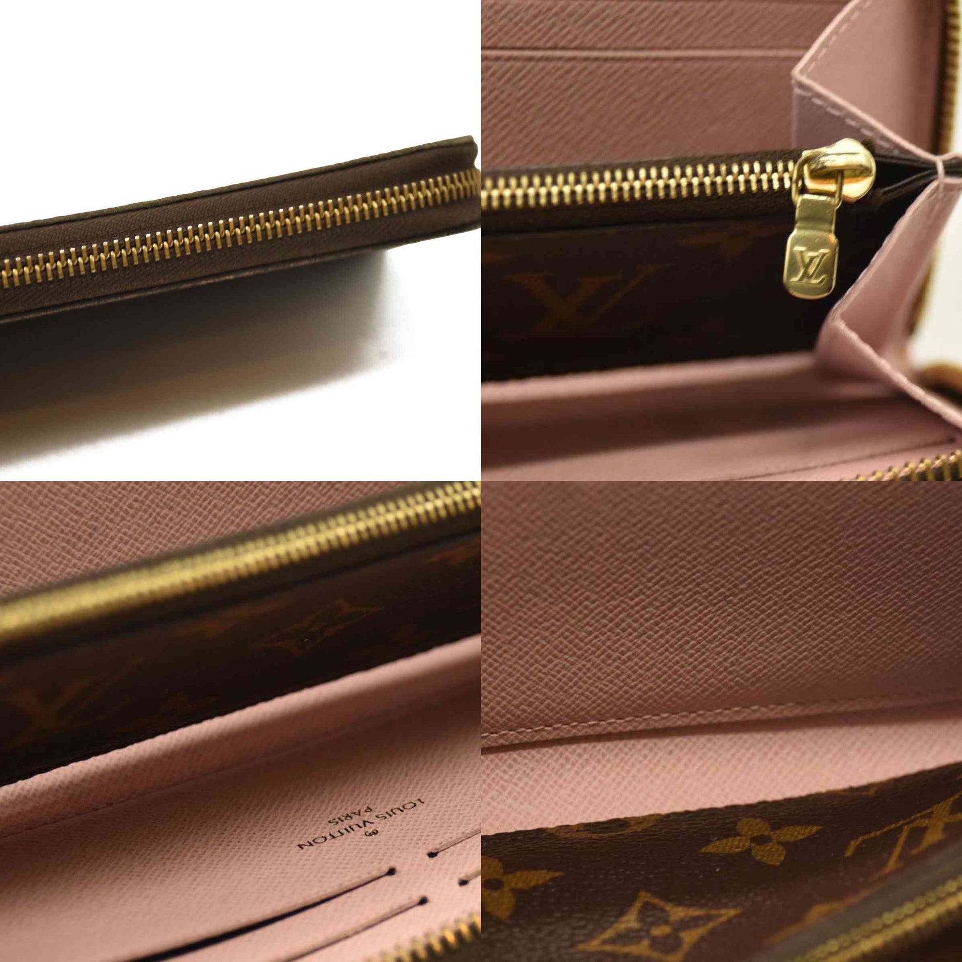 This is an authentic LOUIS VUITTON Monogram Clemence Wallet in Rose Ballerine. The wallet is crafted of traditional monogram toile canvas. The wallet opens with a polished brass wrap-around zipper to a partitioned light pink cross-grain leather interior with card slots, patch pockets, and a central zipper pocket.