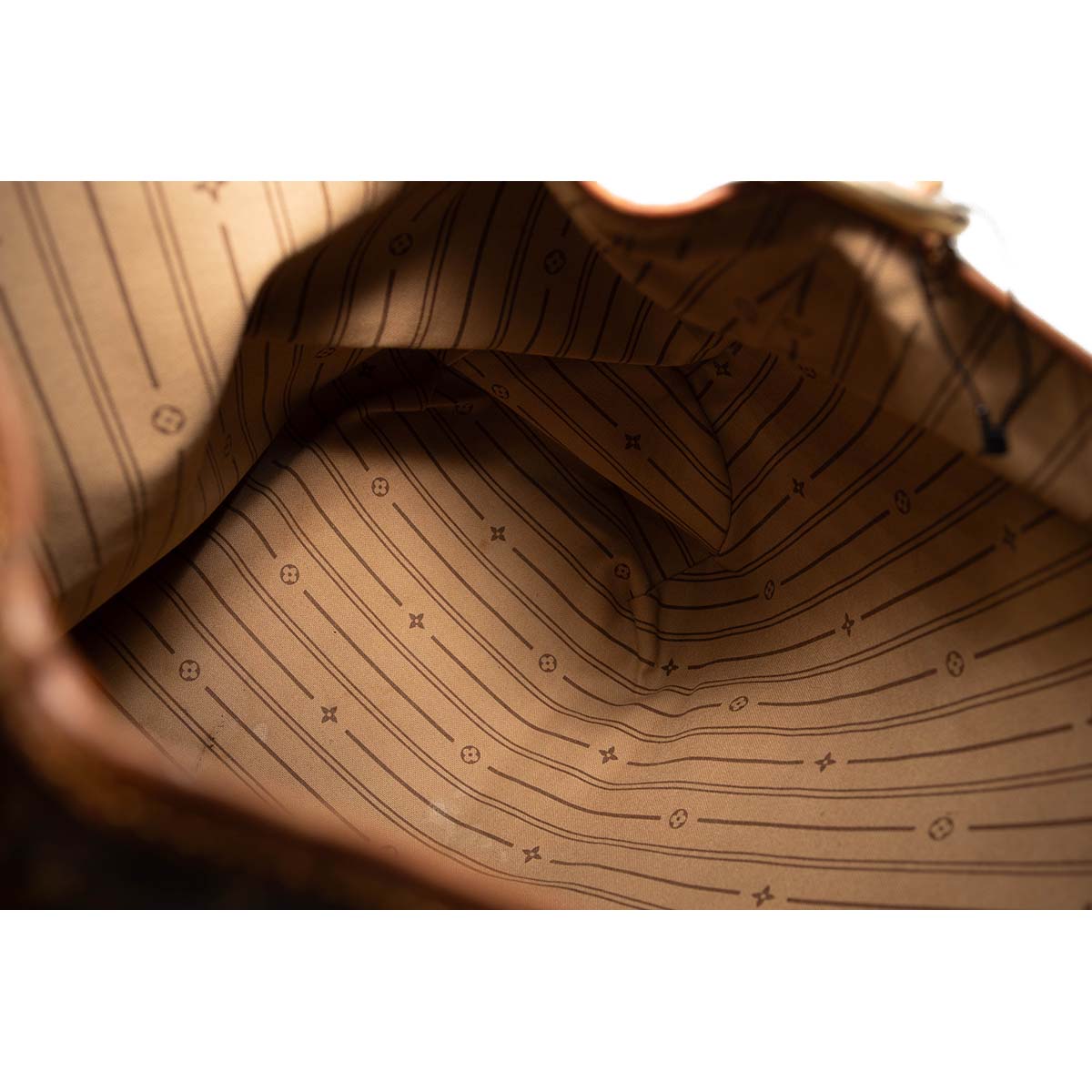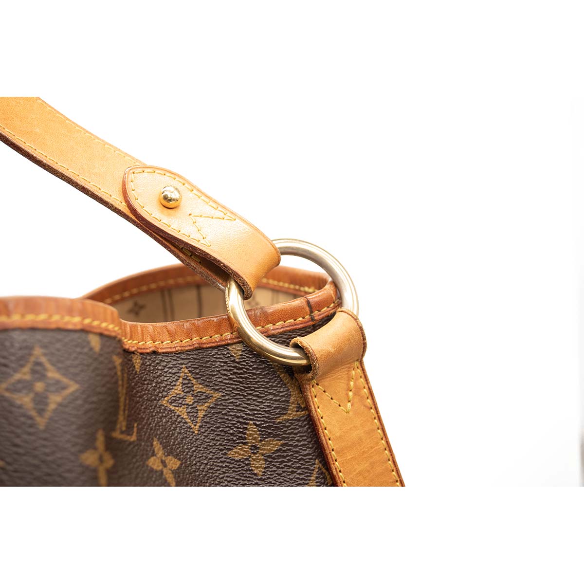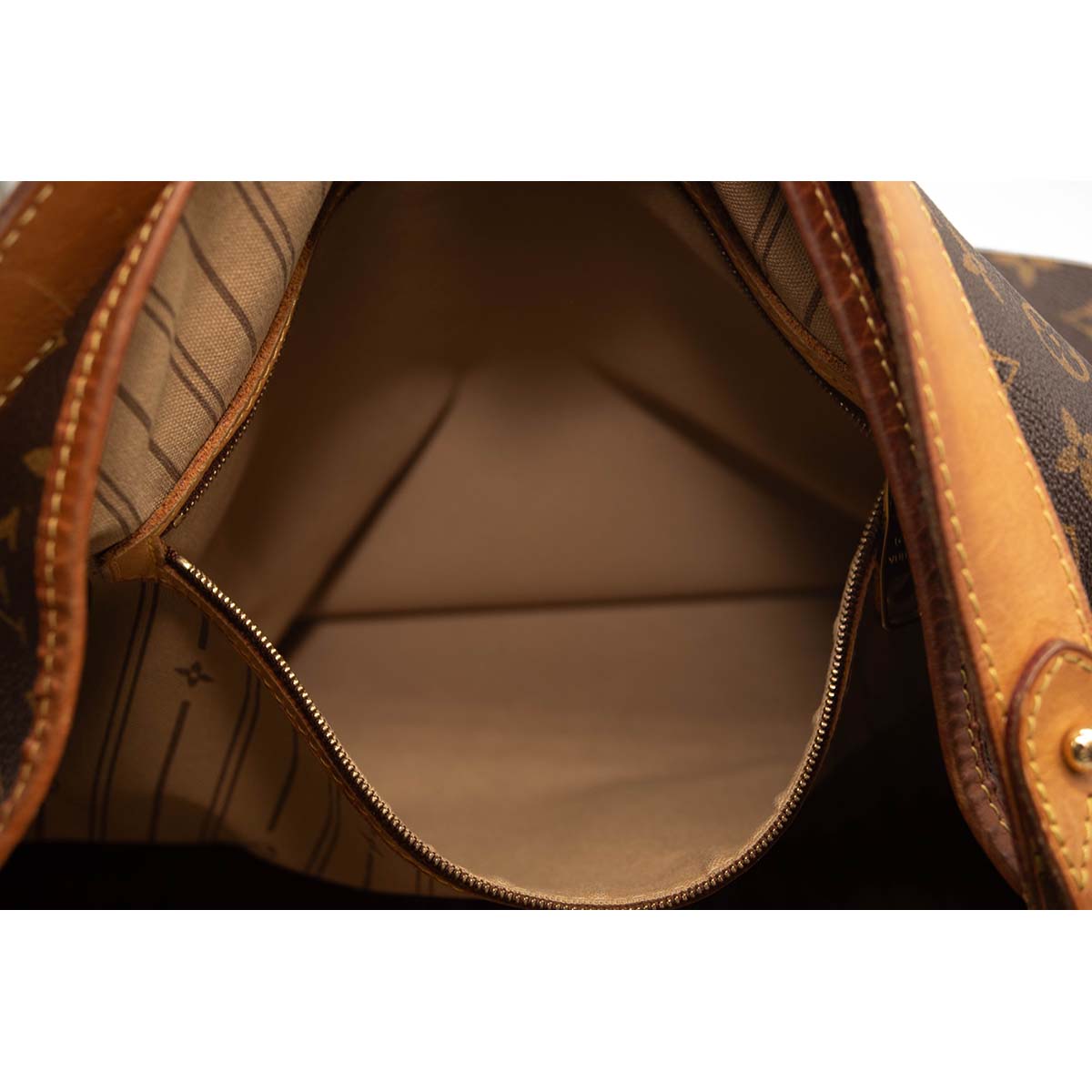 This is an authentic LOUIS VUITTON Monogram Delightful GM. This stylish tote is finely crafted of classic Louis Vuitton monogram coated canvas. This shoulder bag features a looping vachetta cowhide leather shoulder strap and trim, diagonal zipper pockets on the front, and polished brass hardware. The shoulder bag opens to a brown on beige striped fabric interior with a zippered pocket.
