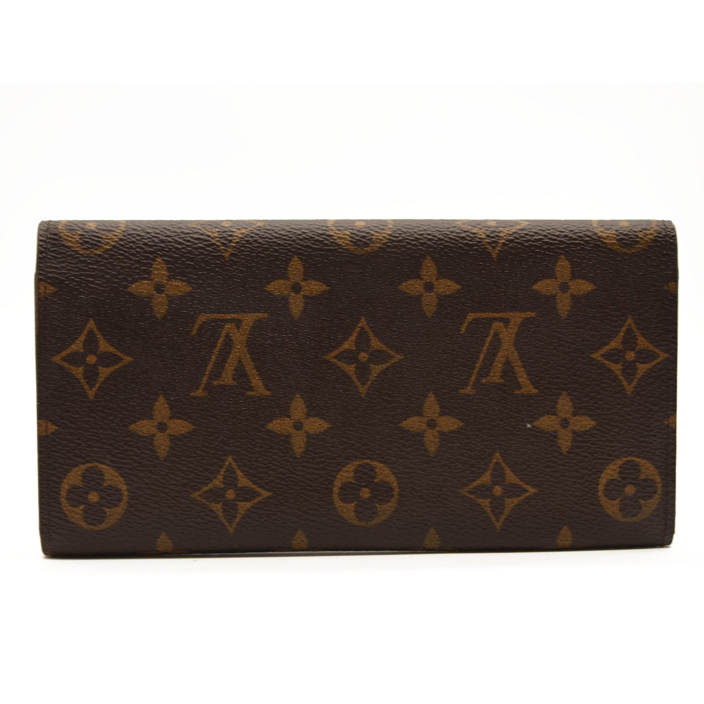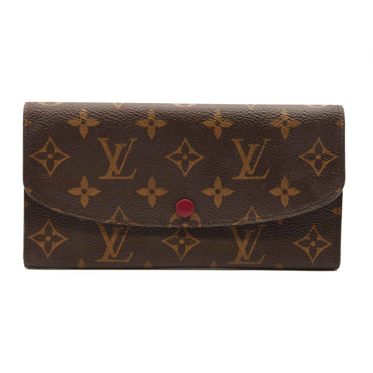 This is an authentic LOUIS VUITTON Monogram Emilie Wallet in Fuchsia. This stylish wallet is crafted of monogram-coated canvas. The flap opens to a coated canvas and dark pink cross-grain leather interior with flat pockets, card slots, and a zipper compartment.