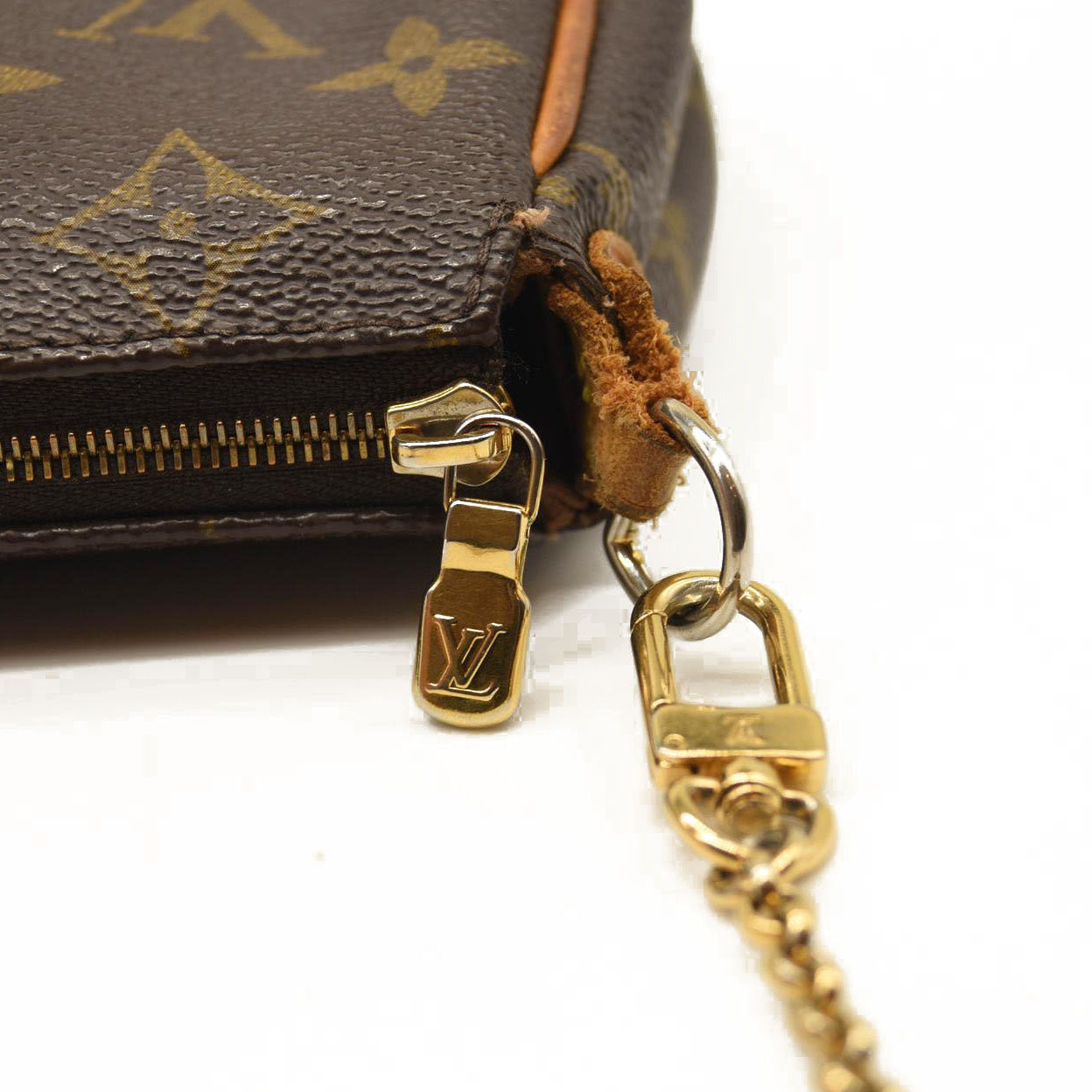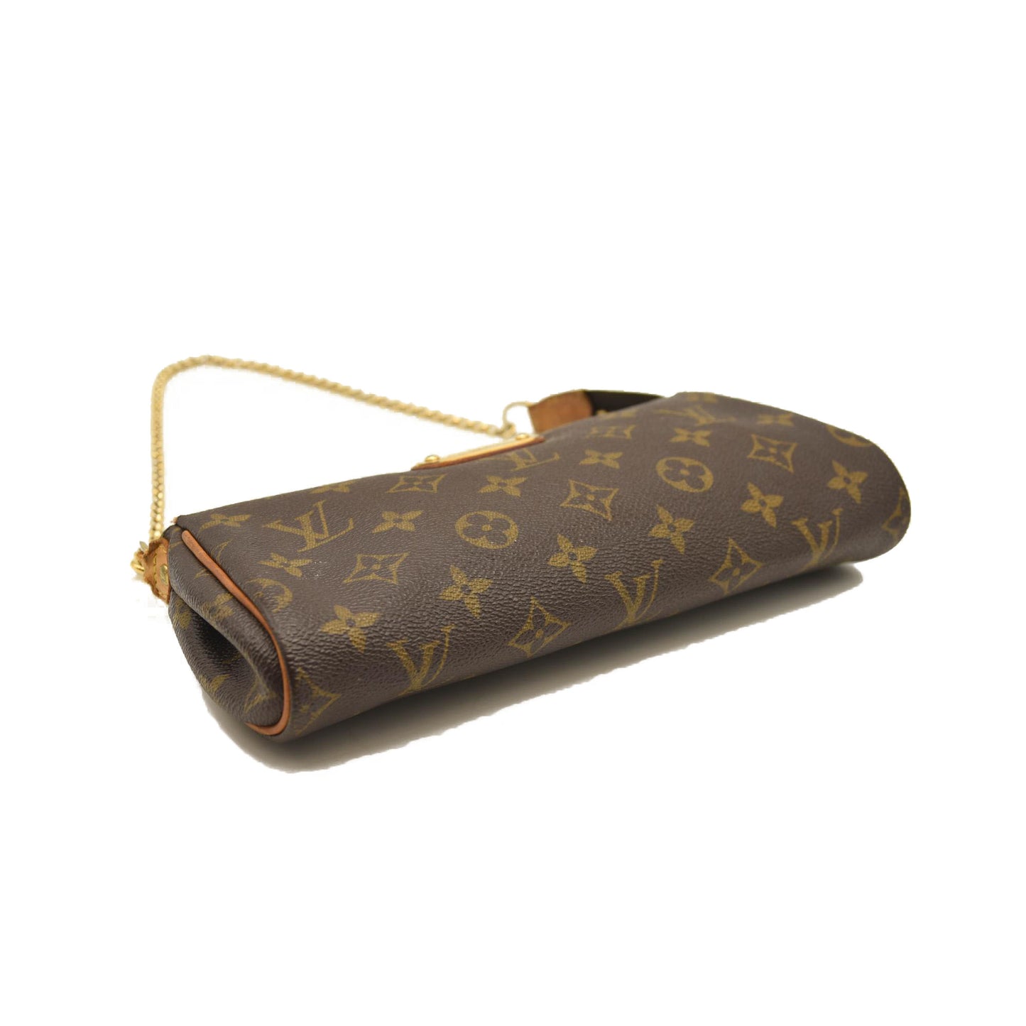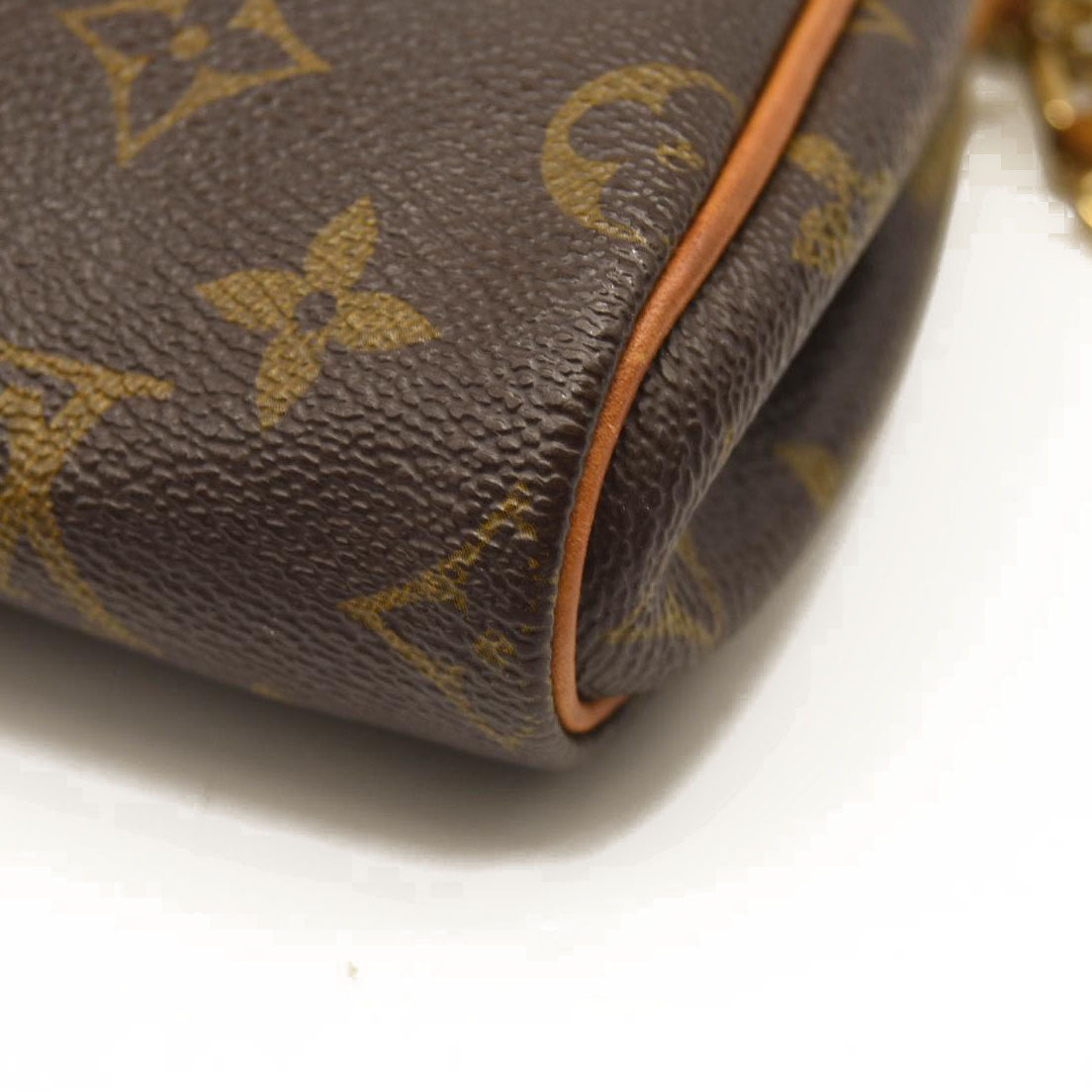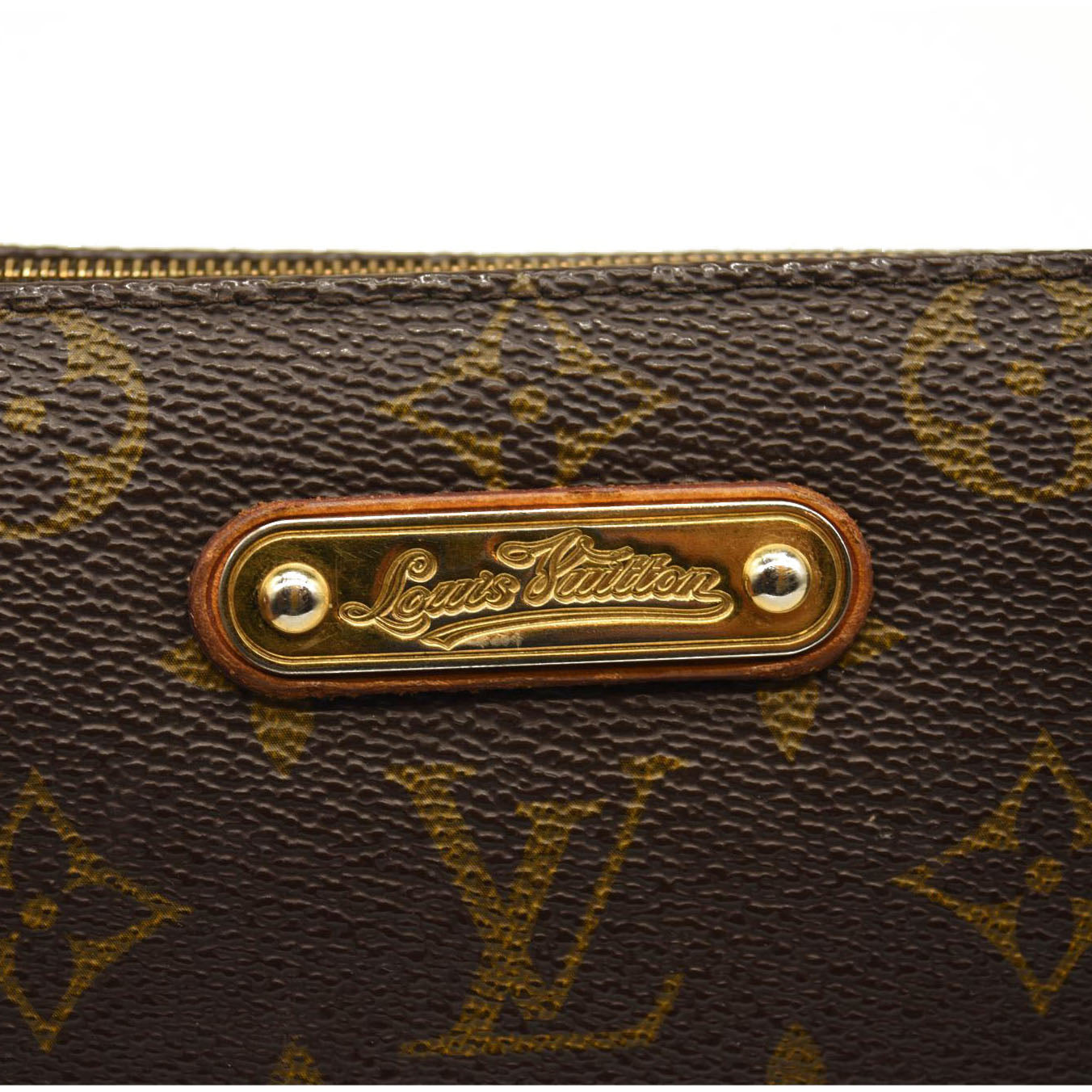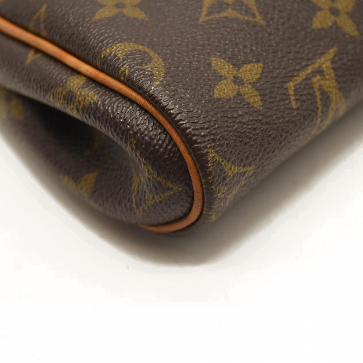 This is an authentic LOUIS VUITTON Monogram Eva Clutch. This stylish and versatile bag is crafted of classic Louis Vuitton monogram coated canvas. This clutch features an elegant polished brass chain-link wristlet strap, vachetta leather trim, and gold hardware. The brass top zipper opens the bag to a compact cocoa brown fabric interior.