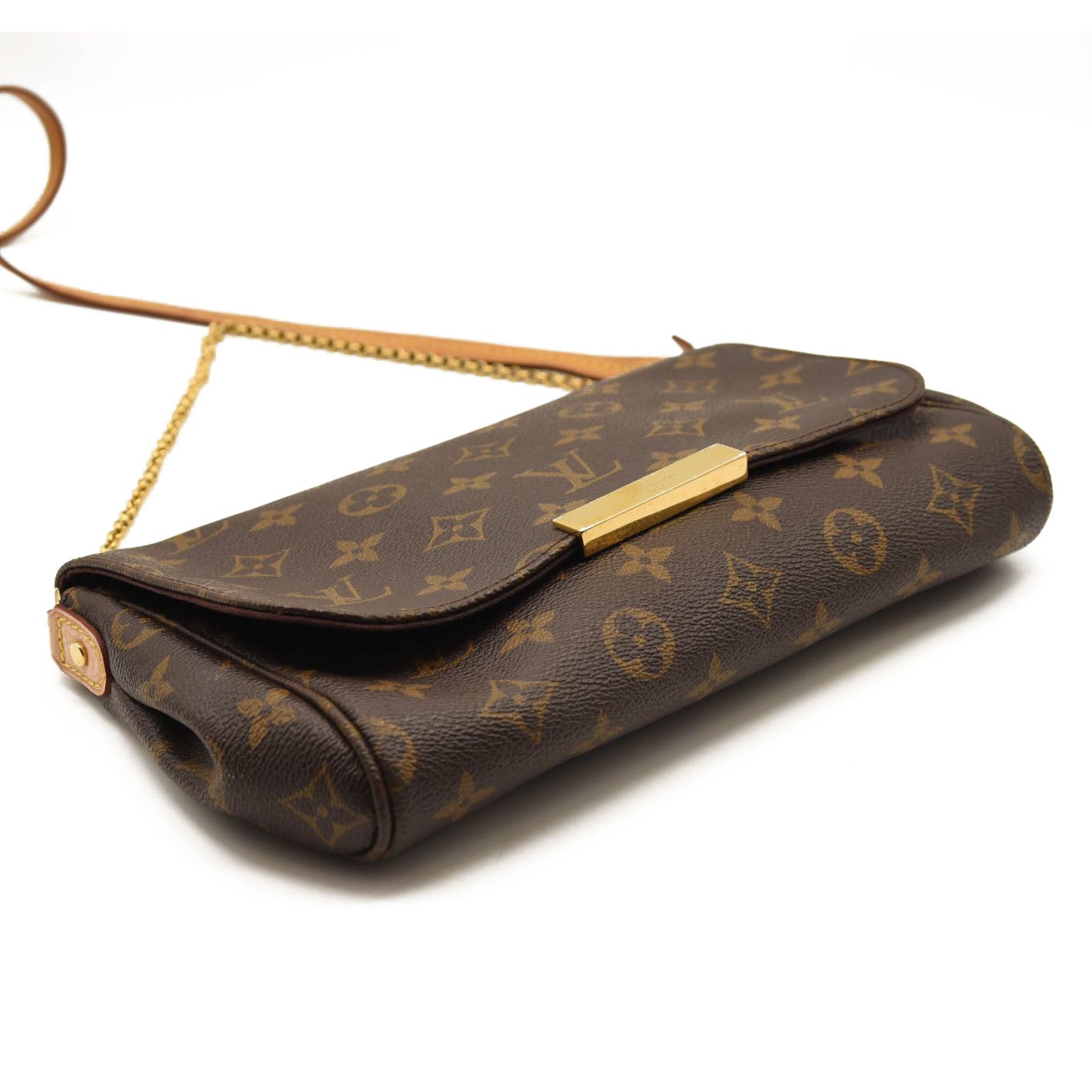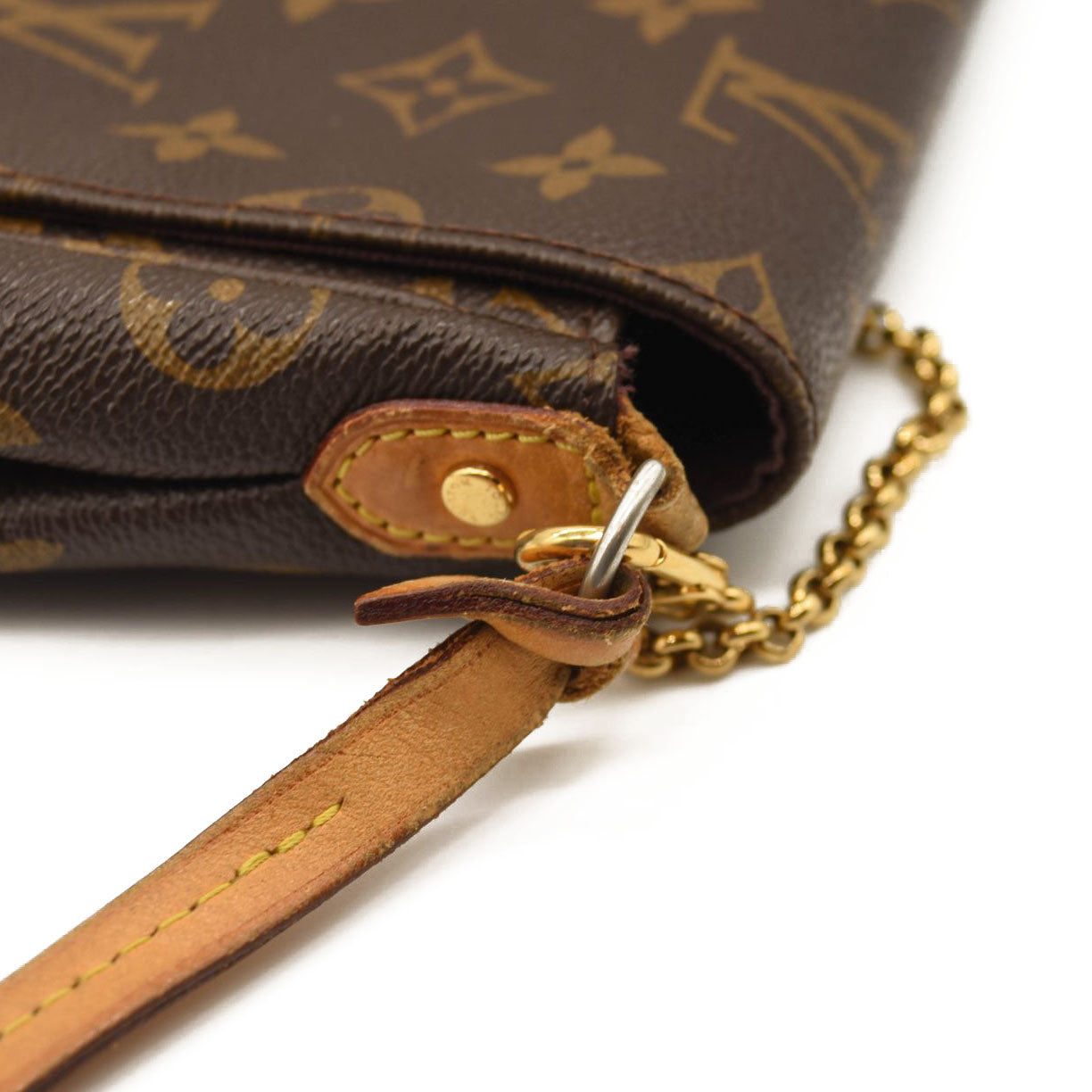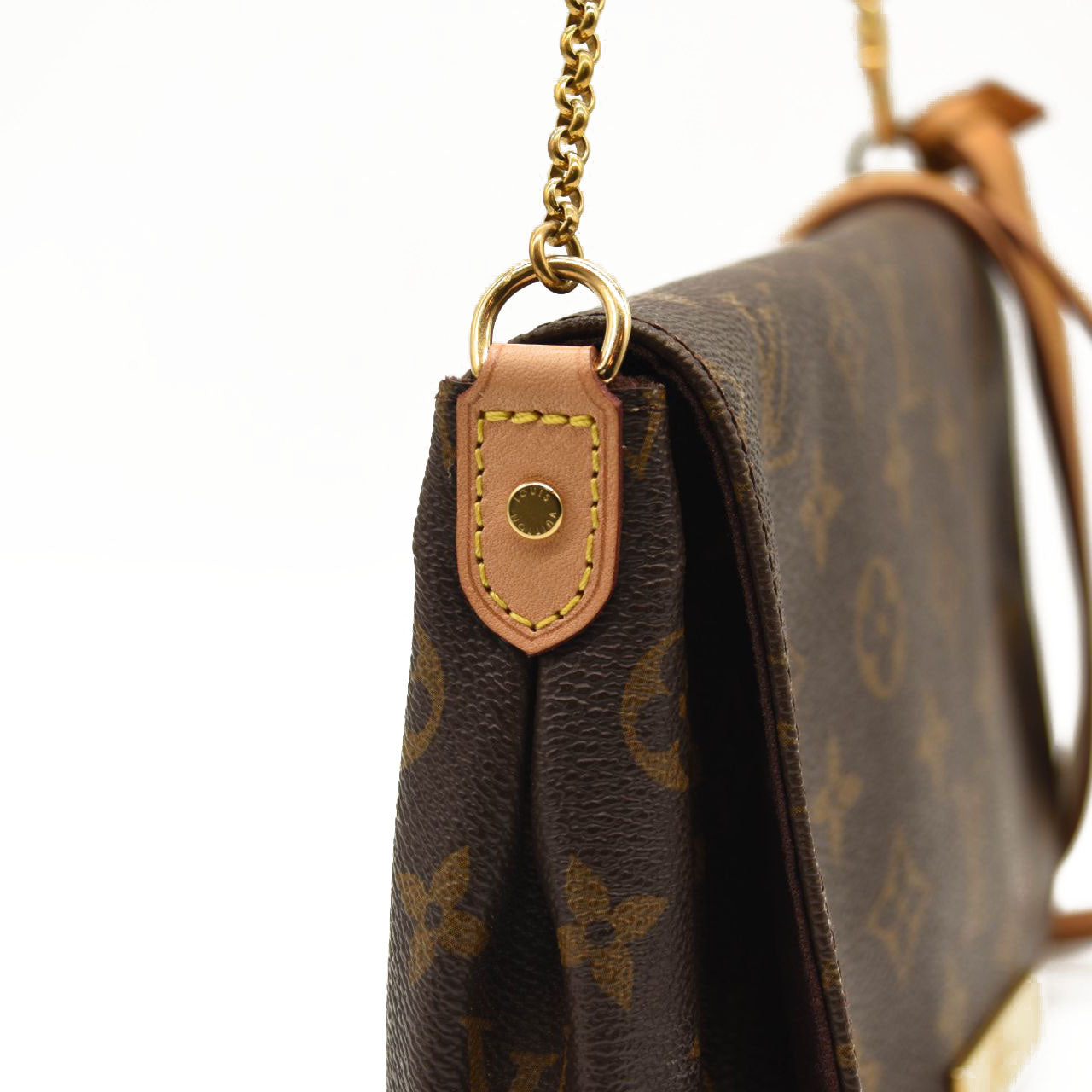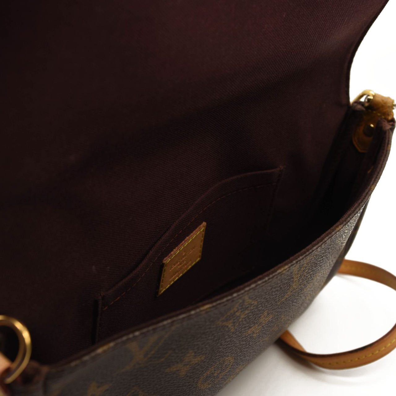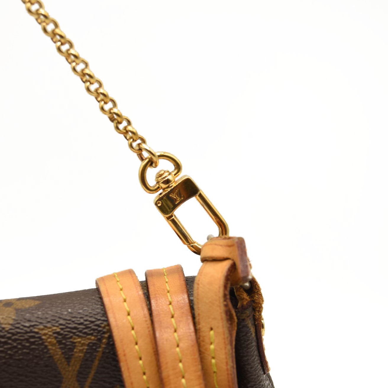 This is an authentic LOUIS VUITTON Monogram Favorite MM. This stylish bag is crafted of a durable monogram toile canvas with a polished gold chain strap and an optional vachetta leather shoulder strap. The crossover flap opens with a magnetic gold bar to a purple fabric interior with a patch pocket.