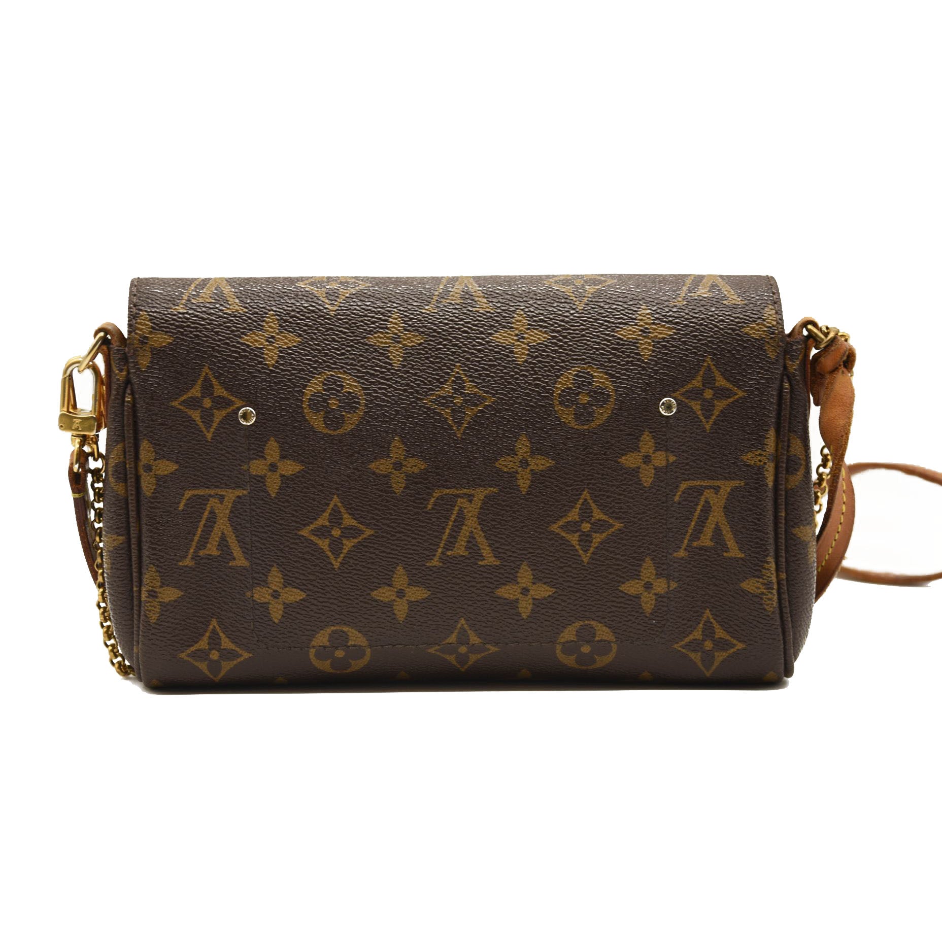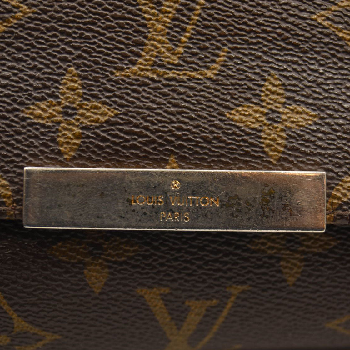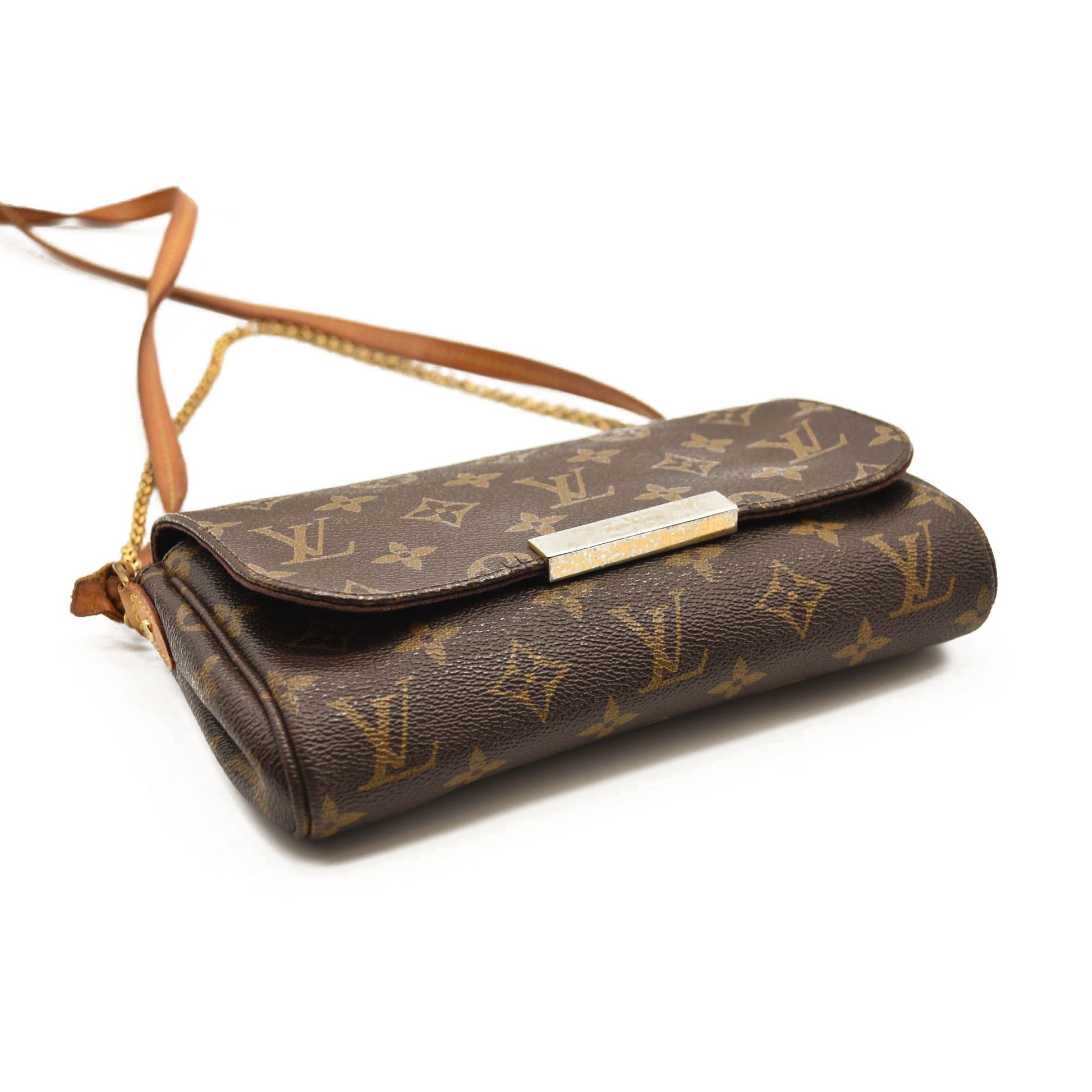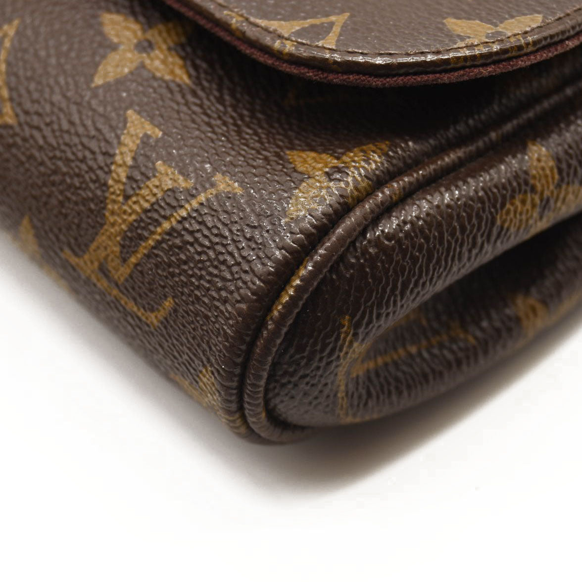 This is an authentic LOUIS VUITTON Monogram Favorite PM. This chic pochette is crafted of Louis Vuitton monogram on toile canvas. The bag features a vachetta cowhide leather removable shoulder strap and a chain hand strap, with a facing flap with a brass name logo tag. This opens to a black currant fabric interior with space enough for just the essentials for day or evening and the luxury and style only from Louis Vuitton!