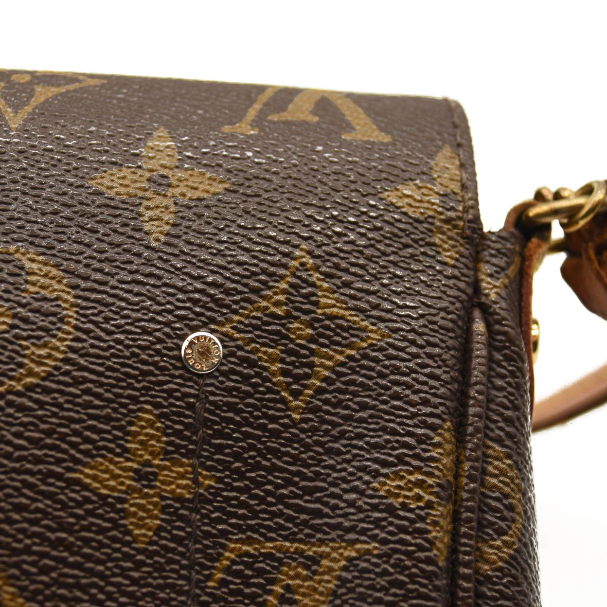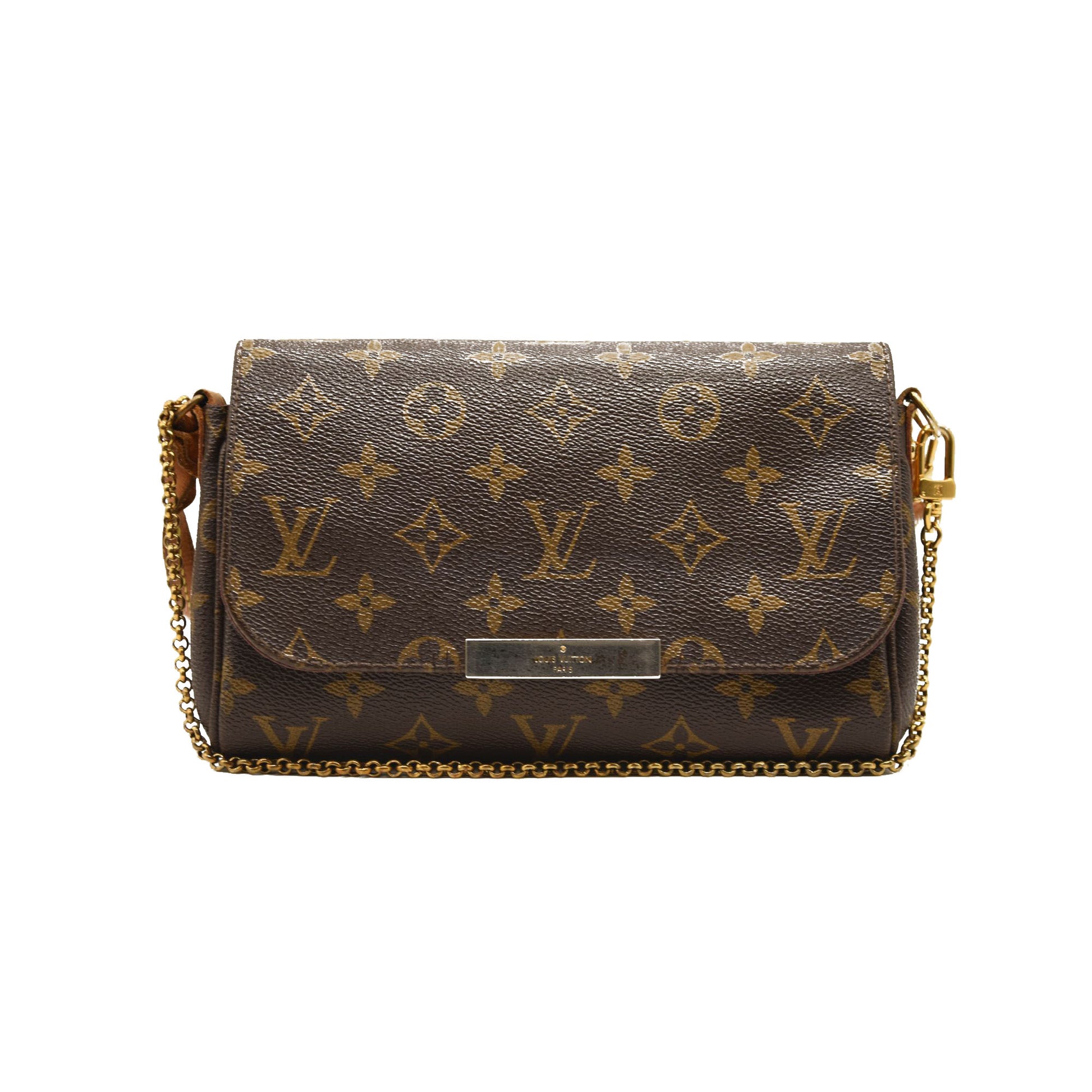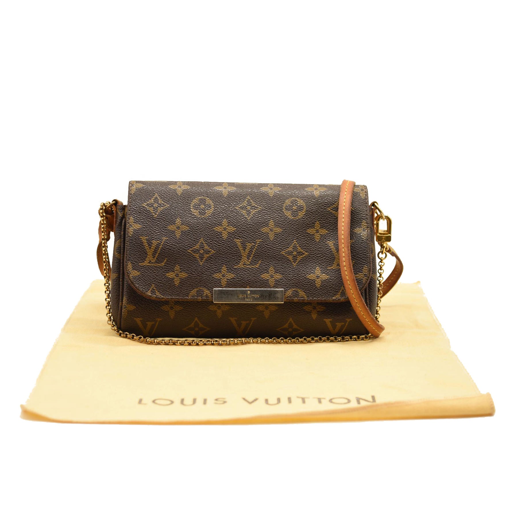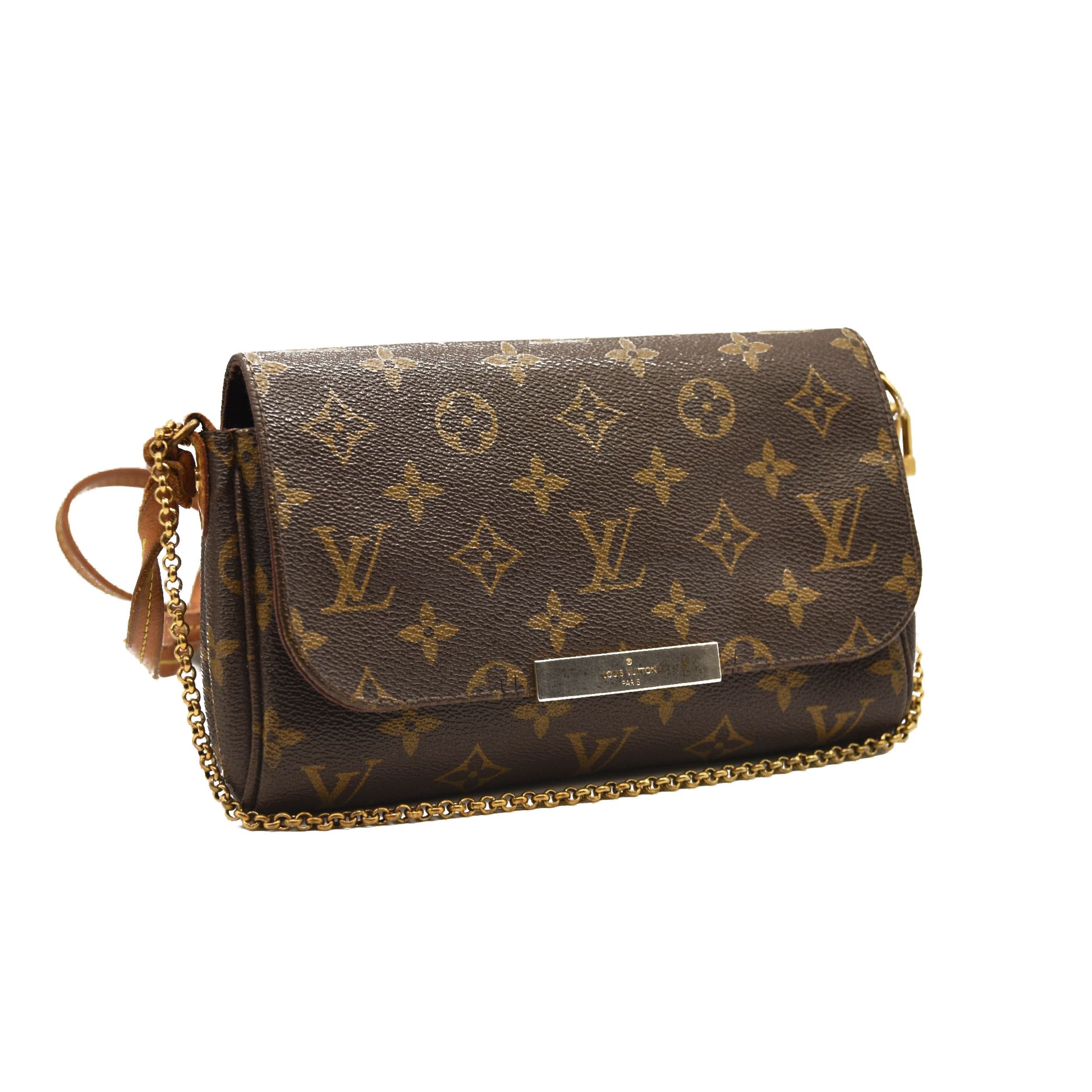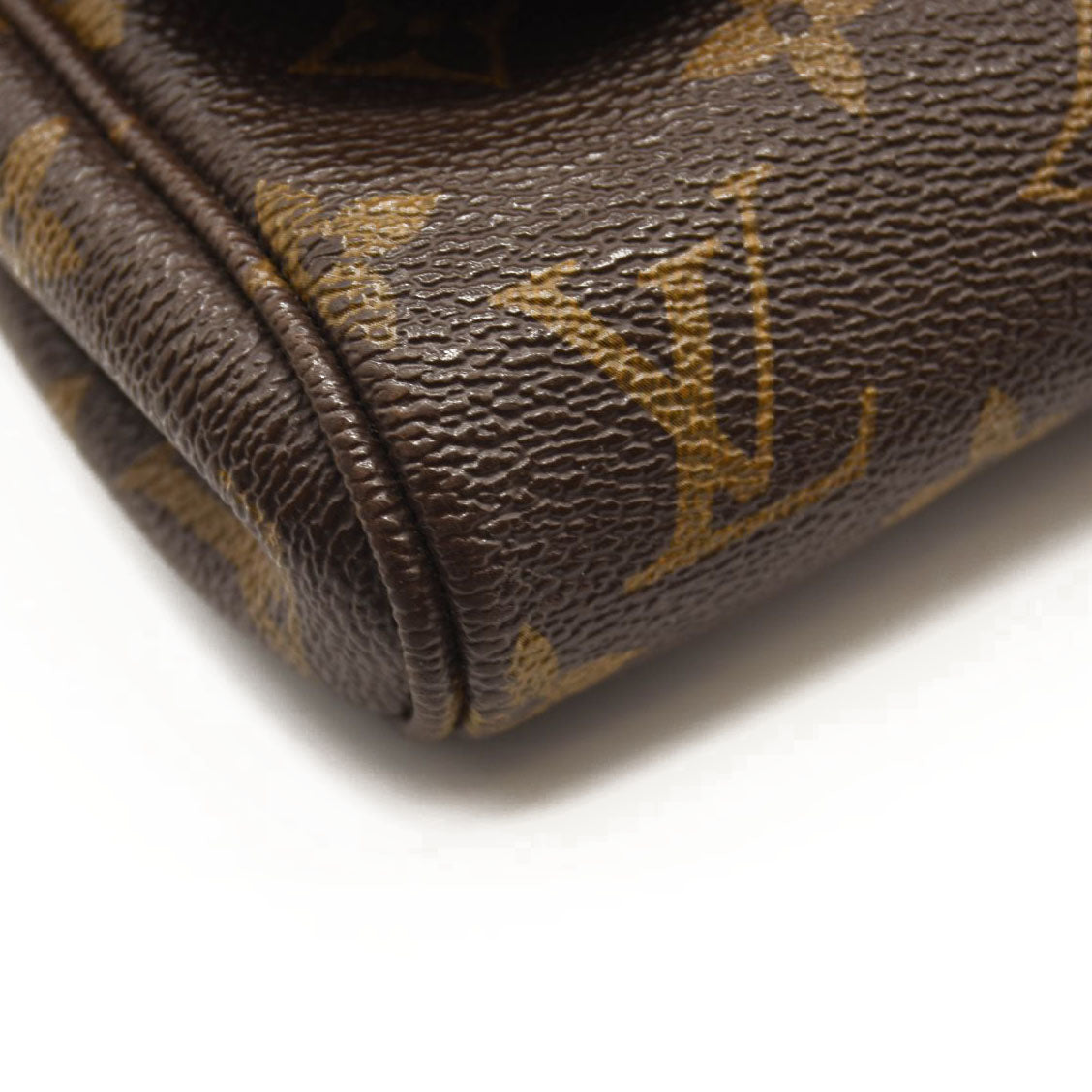 This is an authentic LOUIS VUITTON Monogram Favorite PM. This chic pochette is crafted of Louis Vuitton monogram on toile canvas. The bag features a vachetta cowhide leather removable shoulder strap and a chain hand strap, with a facing flap with a brass name logo tag. This opens to a black currant fabric interior with space enough for just the essentials for day or evening and the luxury and style only from Louis Vuitton!