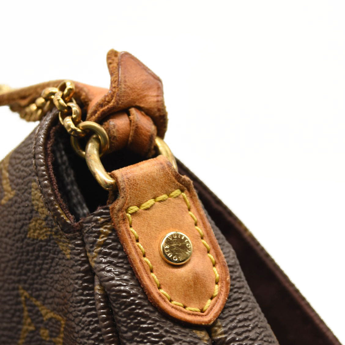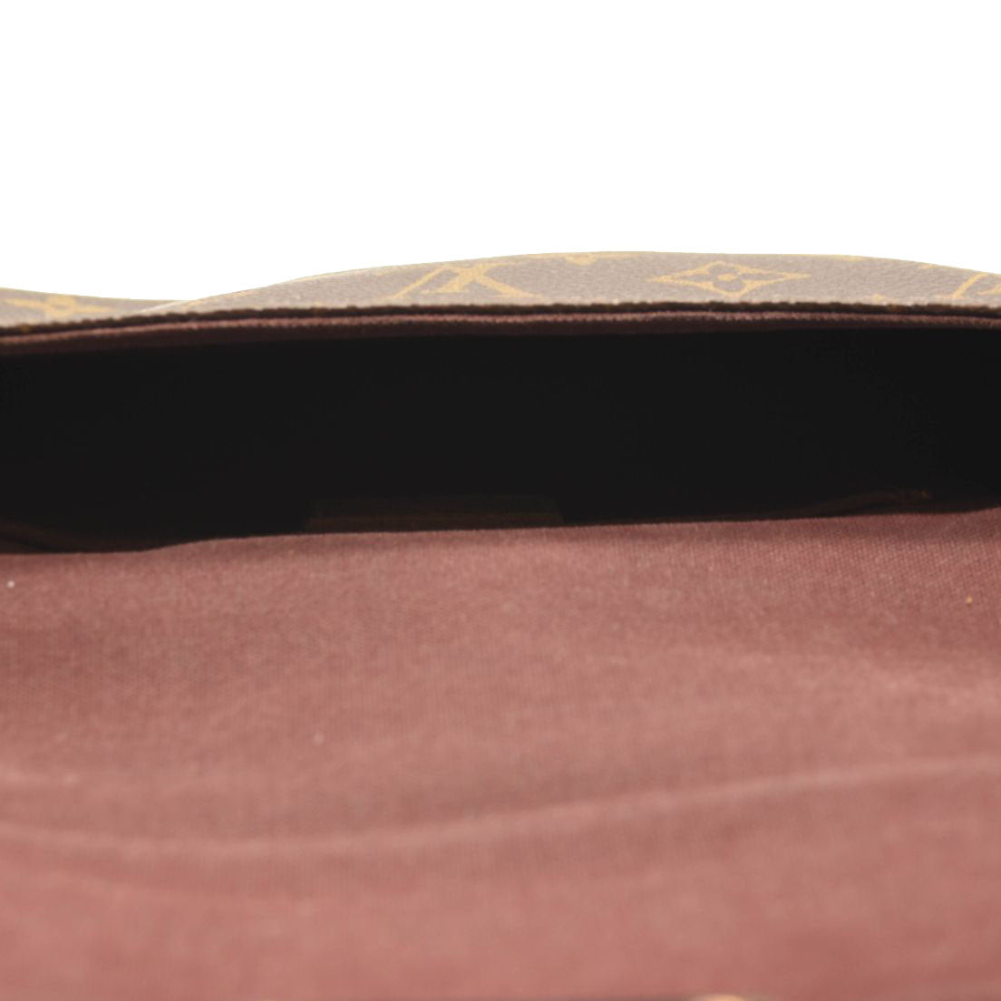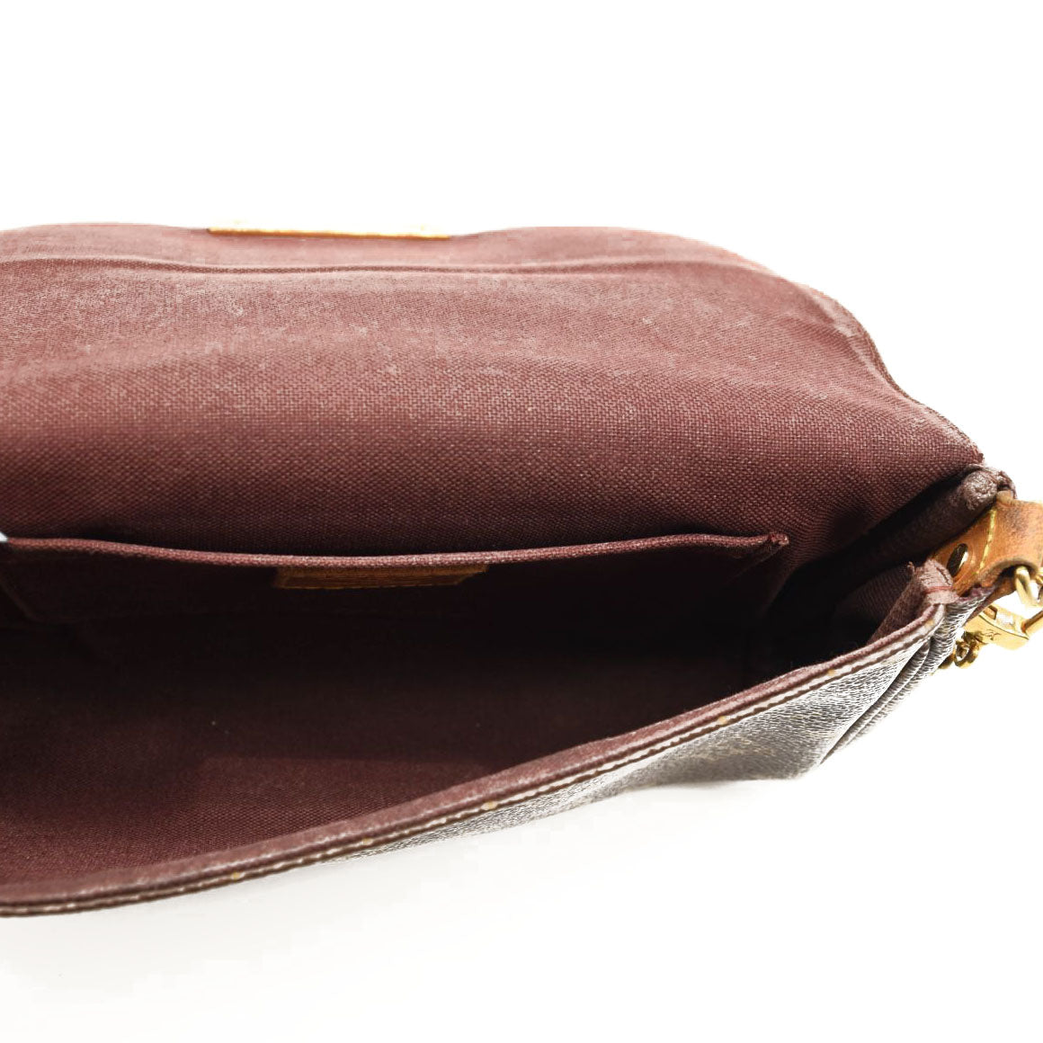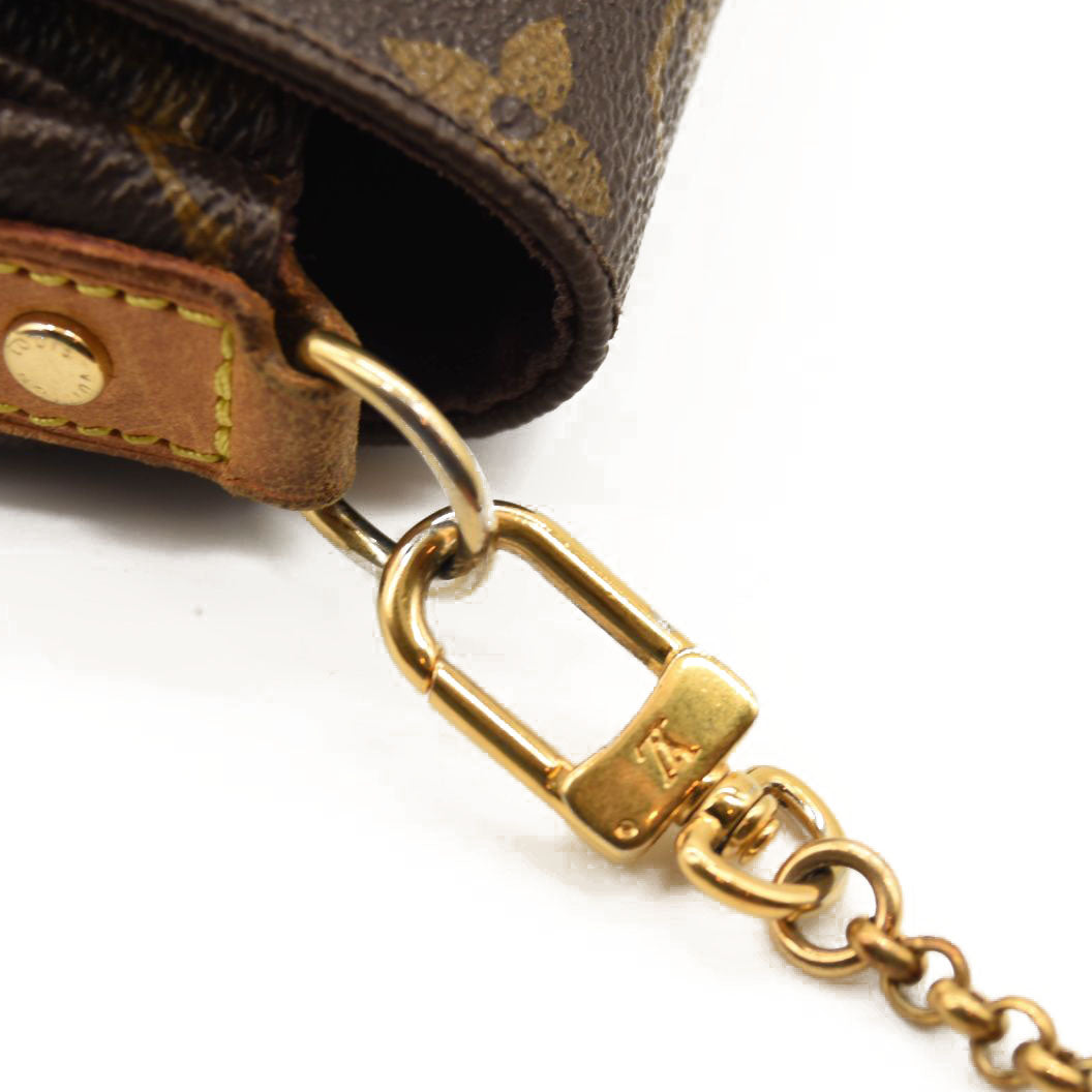 This is an authentic LOUIS VUITTON Monogram Favorite PM. This chic pochette is crafted of Louis Vuitton monogram on toile canvas. The bag features a vachetta cowhide leather removable shoulder strap and a chain hand strap, with a facing flap with a brass name logo tag. This opens to a black currant fabric interior with space enough for just the essentials for day or evening and the luxury and style only from Louis Vuitton!