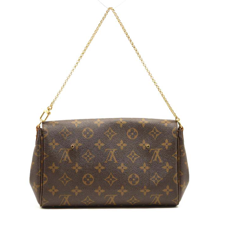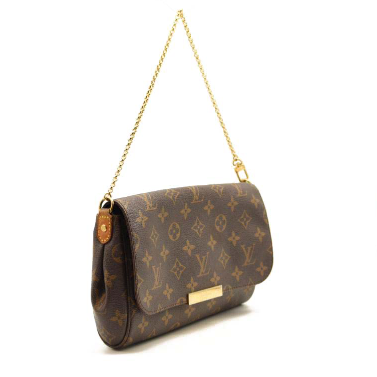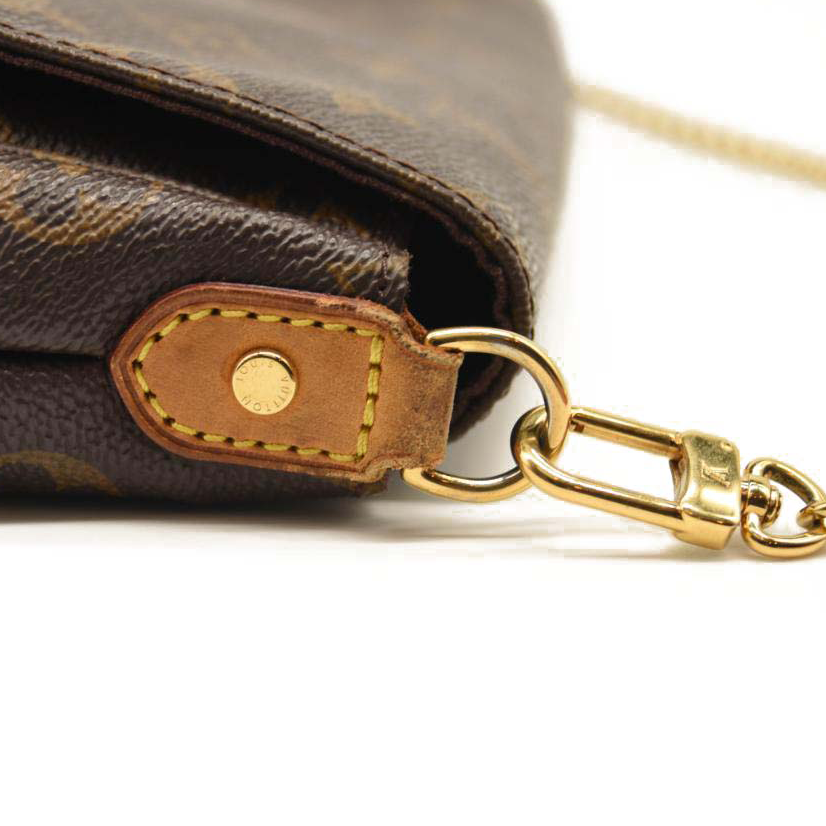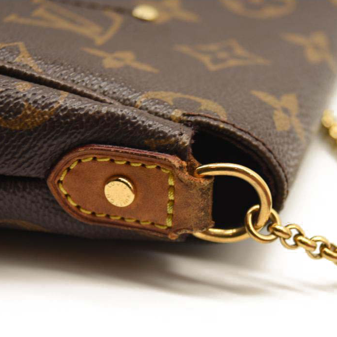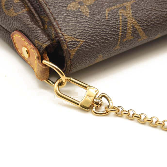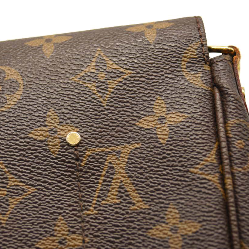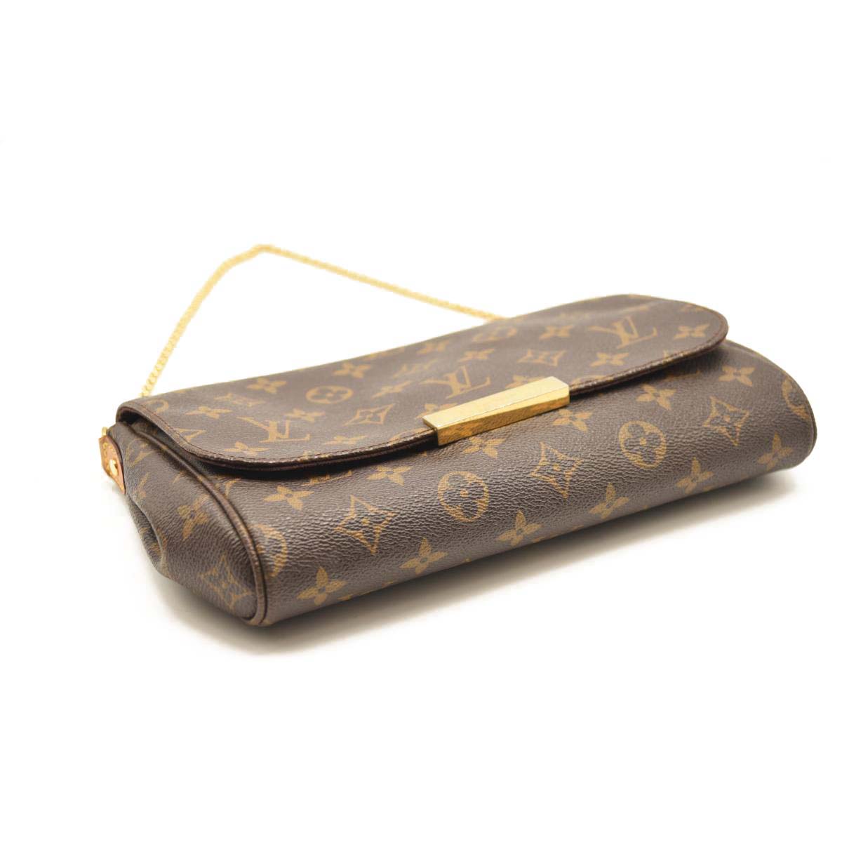 This is an authentic LOUIS VUITTON Monogram Favorite MM. This stylish bag is crafted of a durable monogram toile canvas with a polished brass chain strap. The crossover flap opens with a magnetic brass bar to a purple fabric interior with a patch pocket.