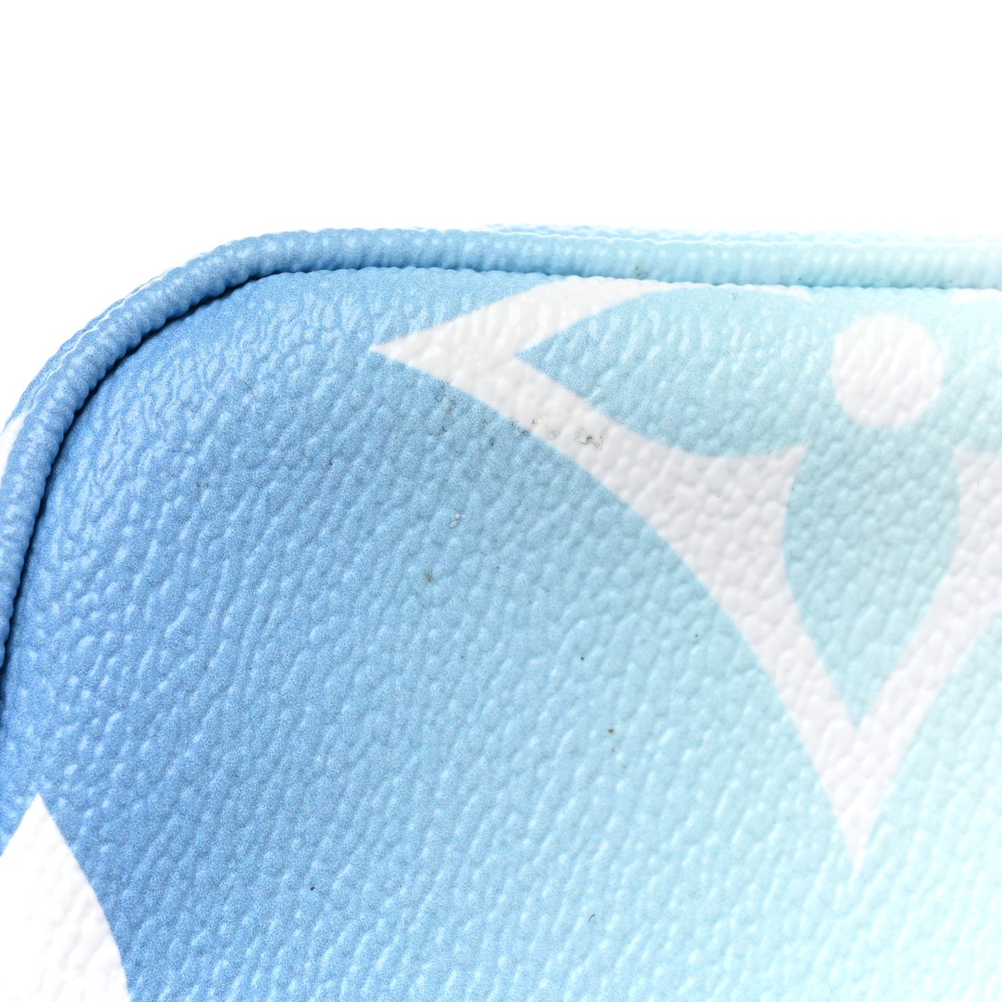This is an authentic LOUIS VUITTON Monogram Giant By The Pool Multi Pochette Accessories in Blue. This pochette is crafted of signature Louis Vuitton monogram on toile canvas. The bag features a polished brass top zipper and beige shoulder strap. The top zipper opens to a beige fabric interior with a flat pocket.