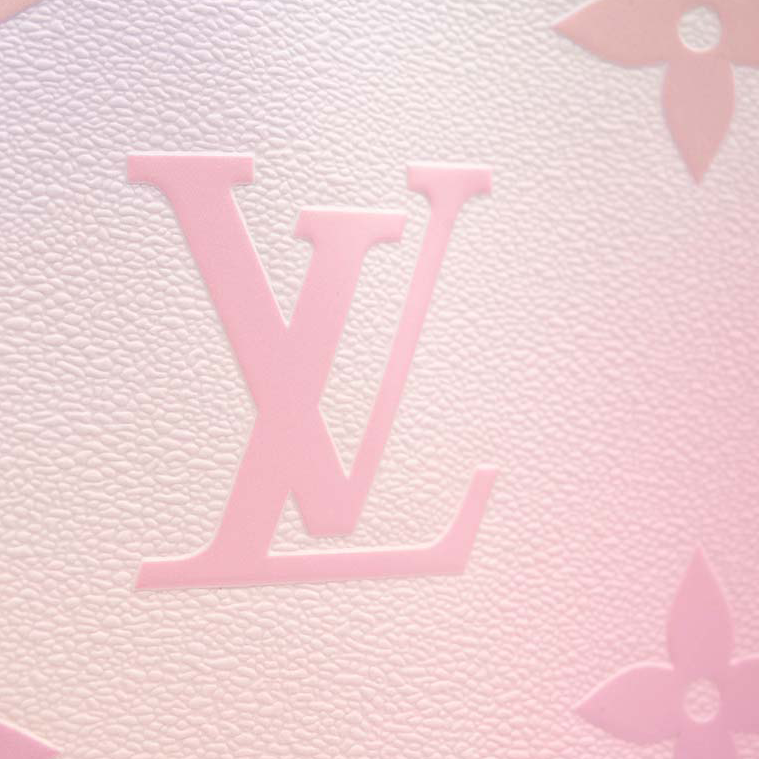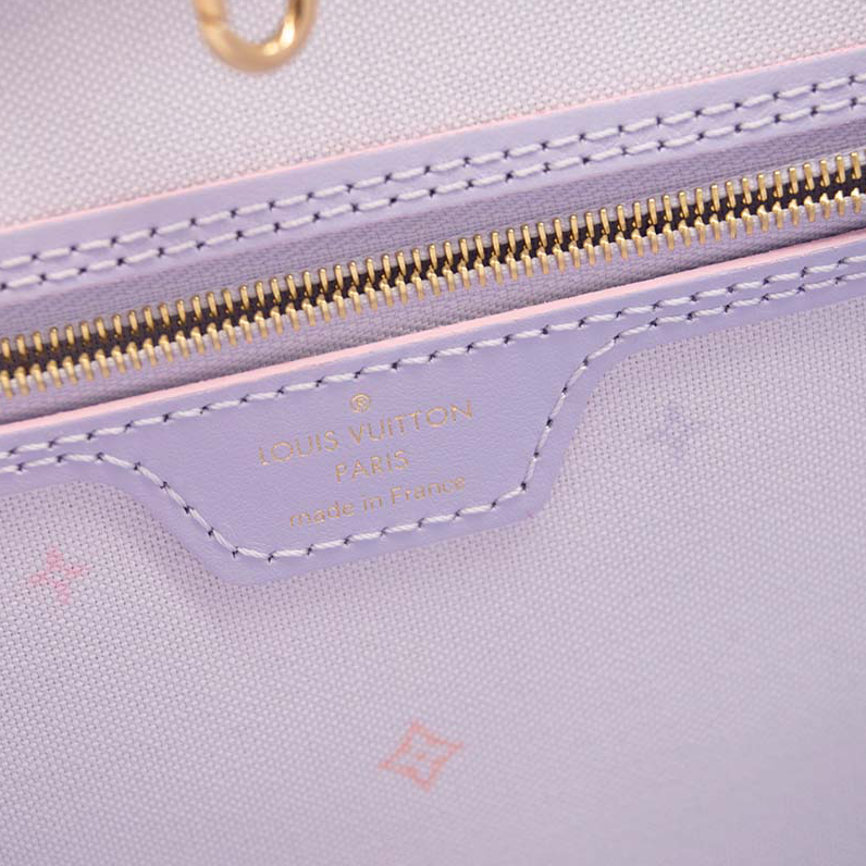 This is an authentic LOUIS VUITTON Monogram Giant Spring In The City Neverfull MM in Sunrise Pastel. This pre-owned luxury tote is part of the Louis Vuitton Spring 2022 “Spring in the City” collection. This stylish tote is crafted of oversized classic Louis Vuitton monogram coated canvas in an ombre pink to blue contrast. The bag features two shoulder straps, trim and side cinch cords, with polished brass hardware. The wide top is open to a striped light purple fabric interior with a zipper pocket. The top can be secured across with a snap strap inlay.