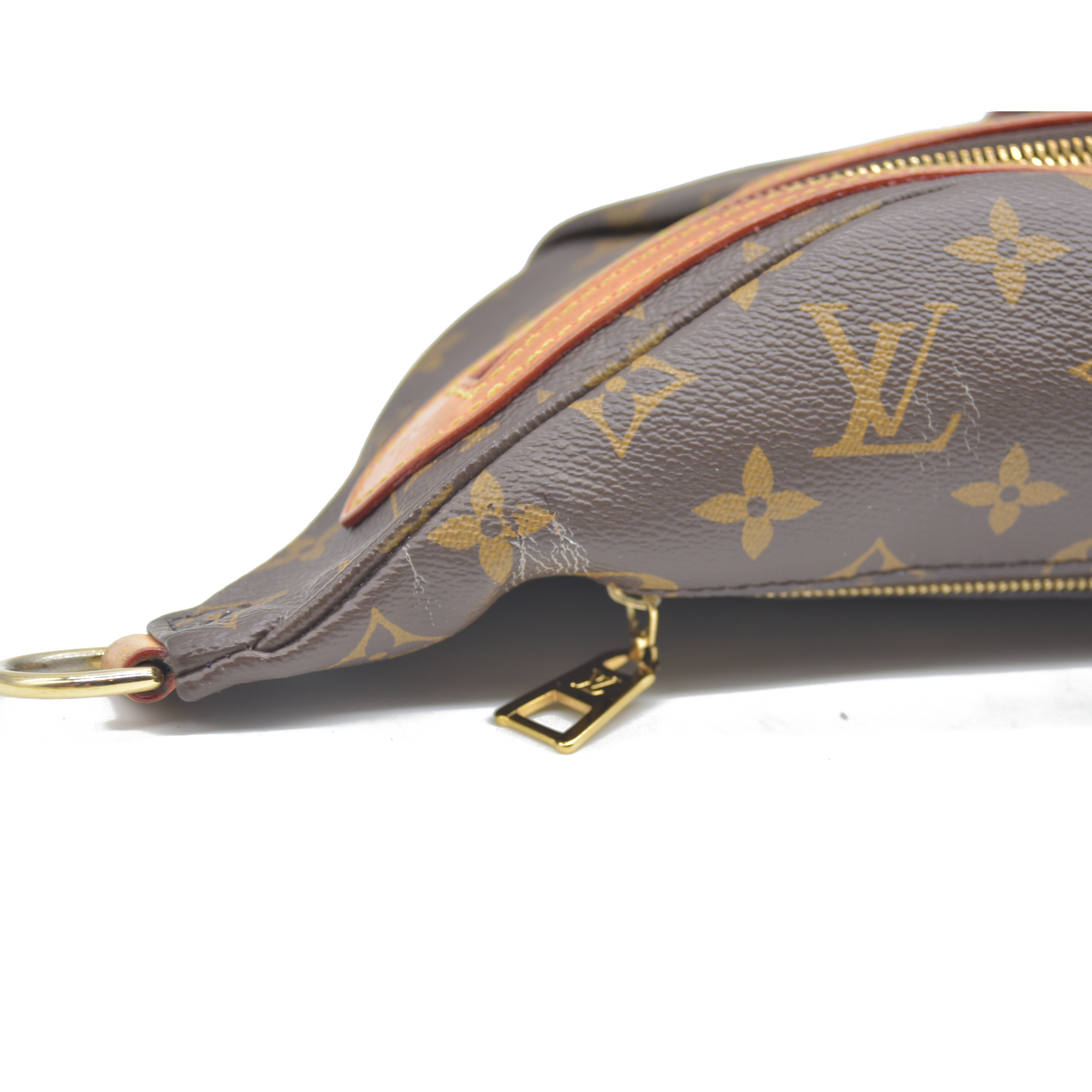 This is an authentic LOUIS VUITTON Monogram High Rise Bumbag. This belt bag is crafted of Louis Vuitton monogram coated canvas in brown with vachetta leather accents including zipper tape and a removable faux luggage tag bag charm. The bag features a rear zipper pocket, and an adjustable beige fabric strap stitched with "Louis Vuitton". The main zipper opens to a white monogram fabric interior.