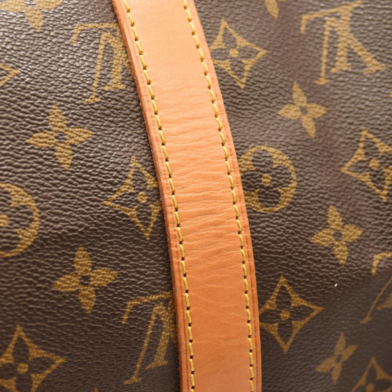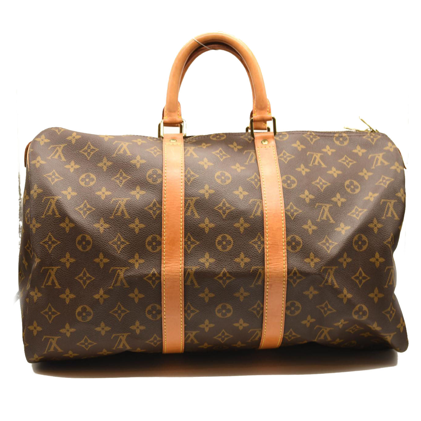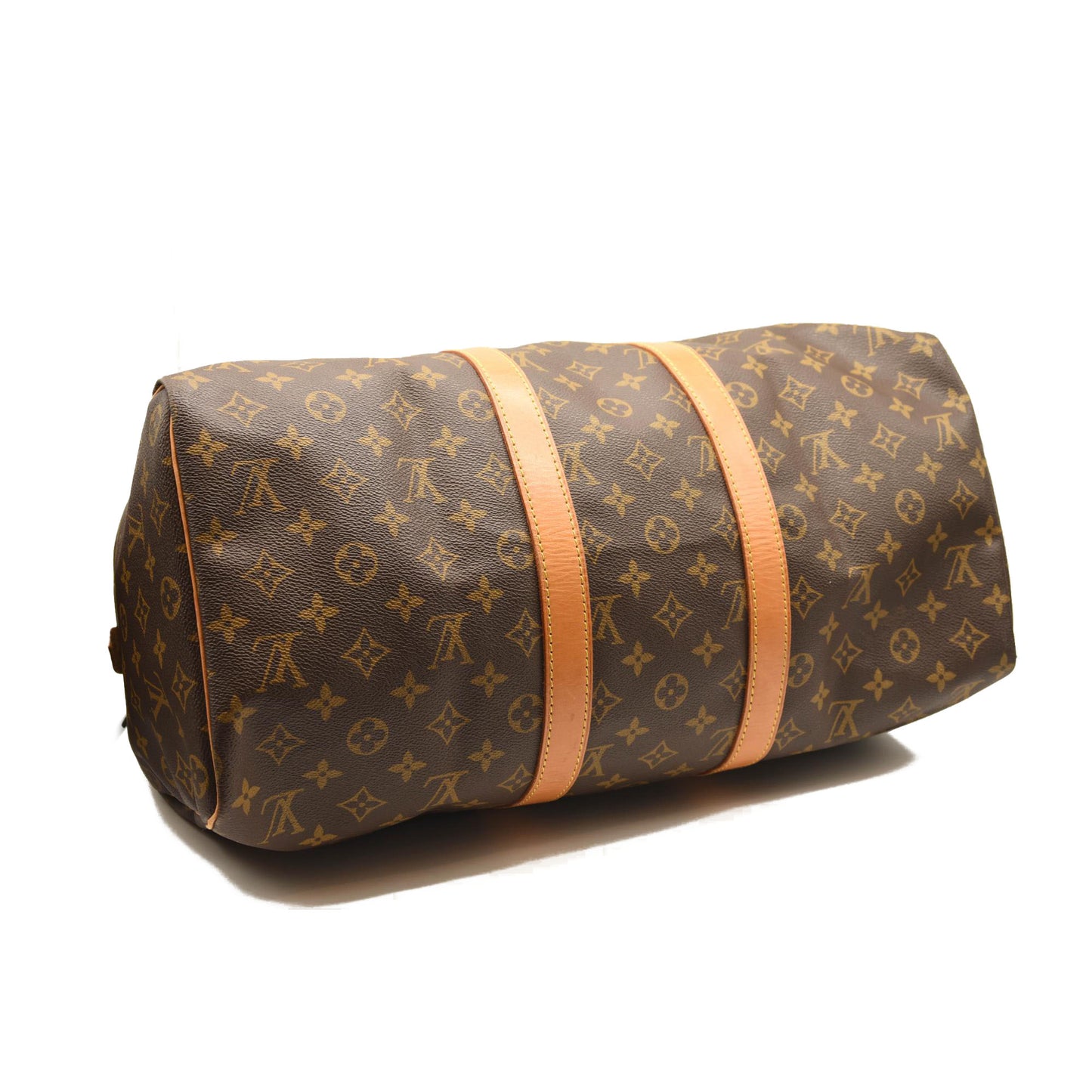 This is an authentic LOUIS VUITTON Monogram Keepall 45. This stylish bag is crafted of signature Louis Vuitton monogram on a toile coated canvas. It features vachetta leather trim, rolled leather top handles, and polished gold hardware. The top zippers open to a spacious brown fabric interior.