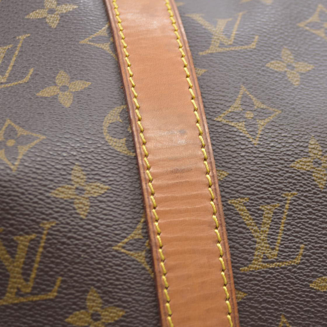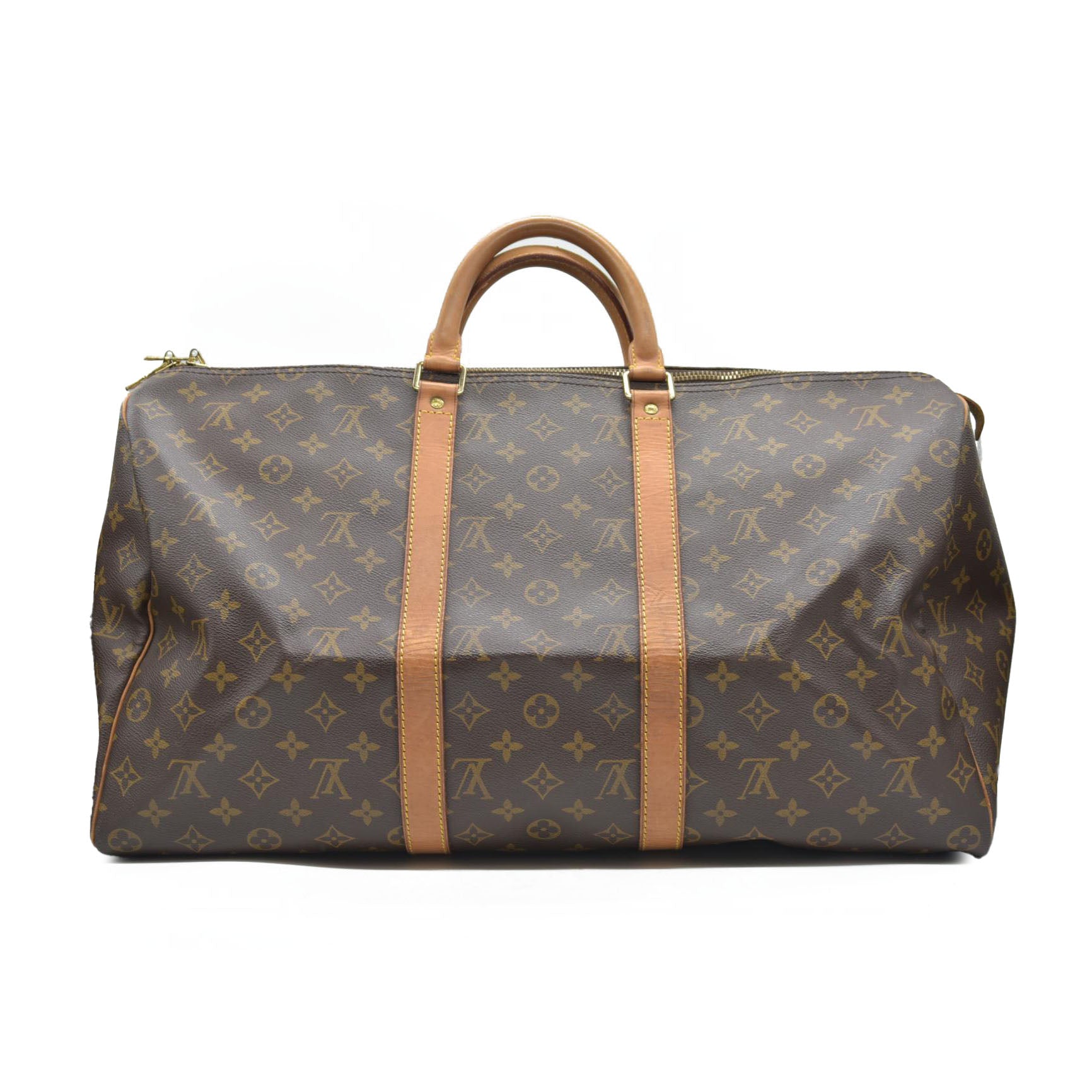 This is an authentic LOUIS VUITTON Monogram Keepall 50. This stylish duffel is crafted of signature Louis Vuitton monogram on coated canvas. The bag features vachetta leather trim, rolled top handles, and polished brass hardware. The top zippers open to a spacious cocoa brown fabric interior.