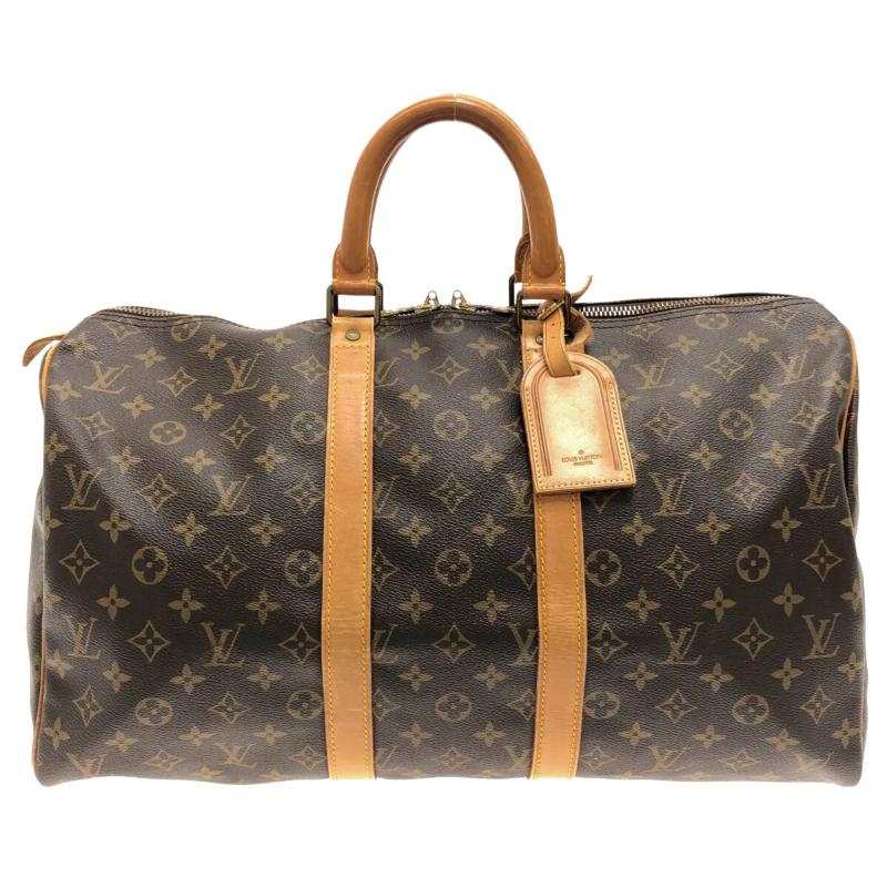 This is an authentic LOUIS VUITTON Monogram Keepall 45. This stylish bag is crafted of signature Louis Vuitton monogram on a toile coated canvas. It features vachetta leather trim, rolled leather top handles, and polished gold hardware. The top zippers open to a spacious brown fabric interior.
