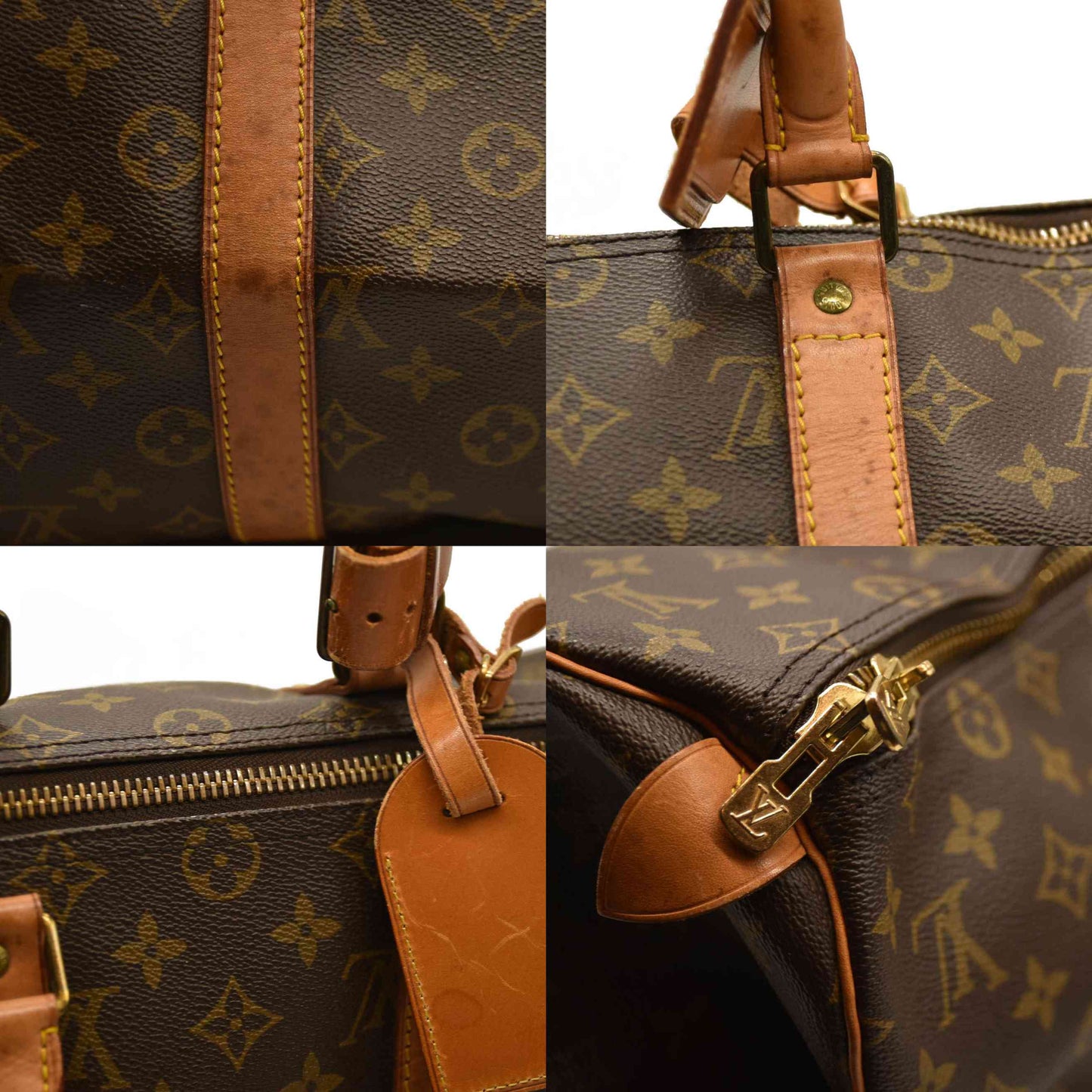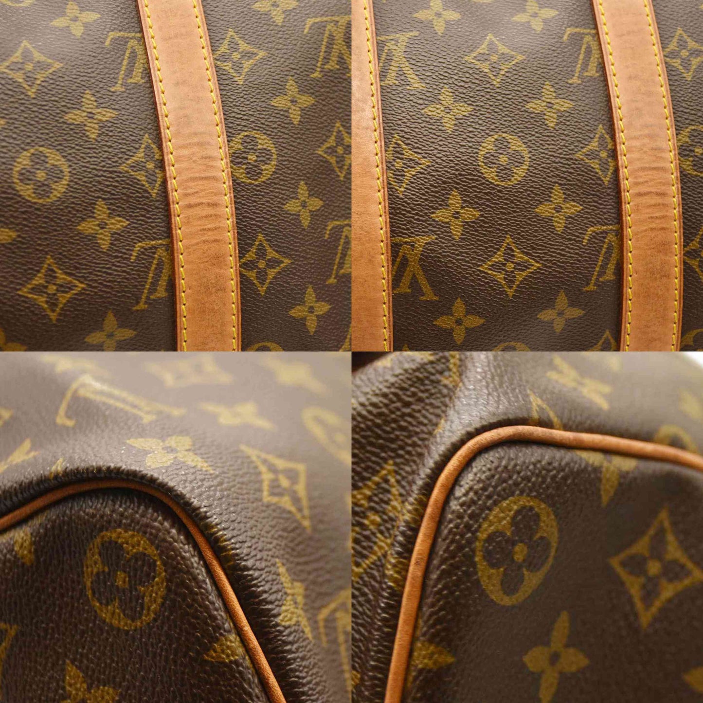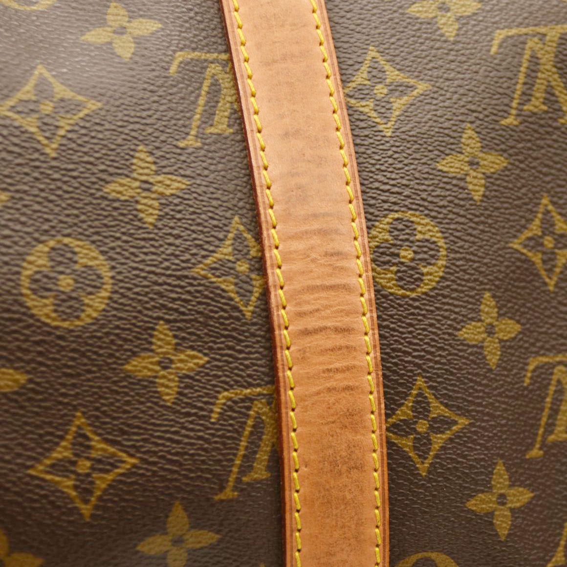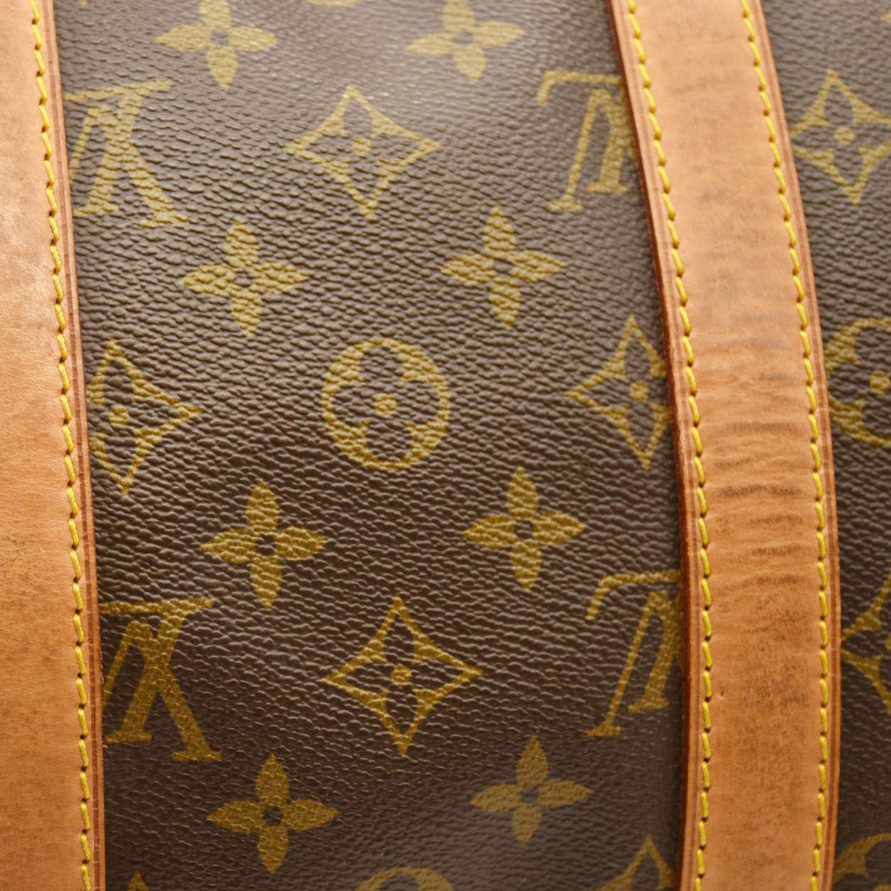 This is an authentic LOUIS VUITTON Monogram Keepall 55. This duffle is crafted of signature Louis Vuitton monogram coated canvas. The bag features vachetta cowhide leather accents including rolled top handles, piping, and trim. The brass top zippers open to a spacious cocoa brown fabric interior.