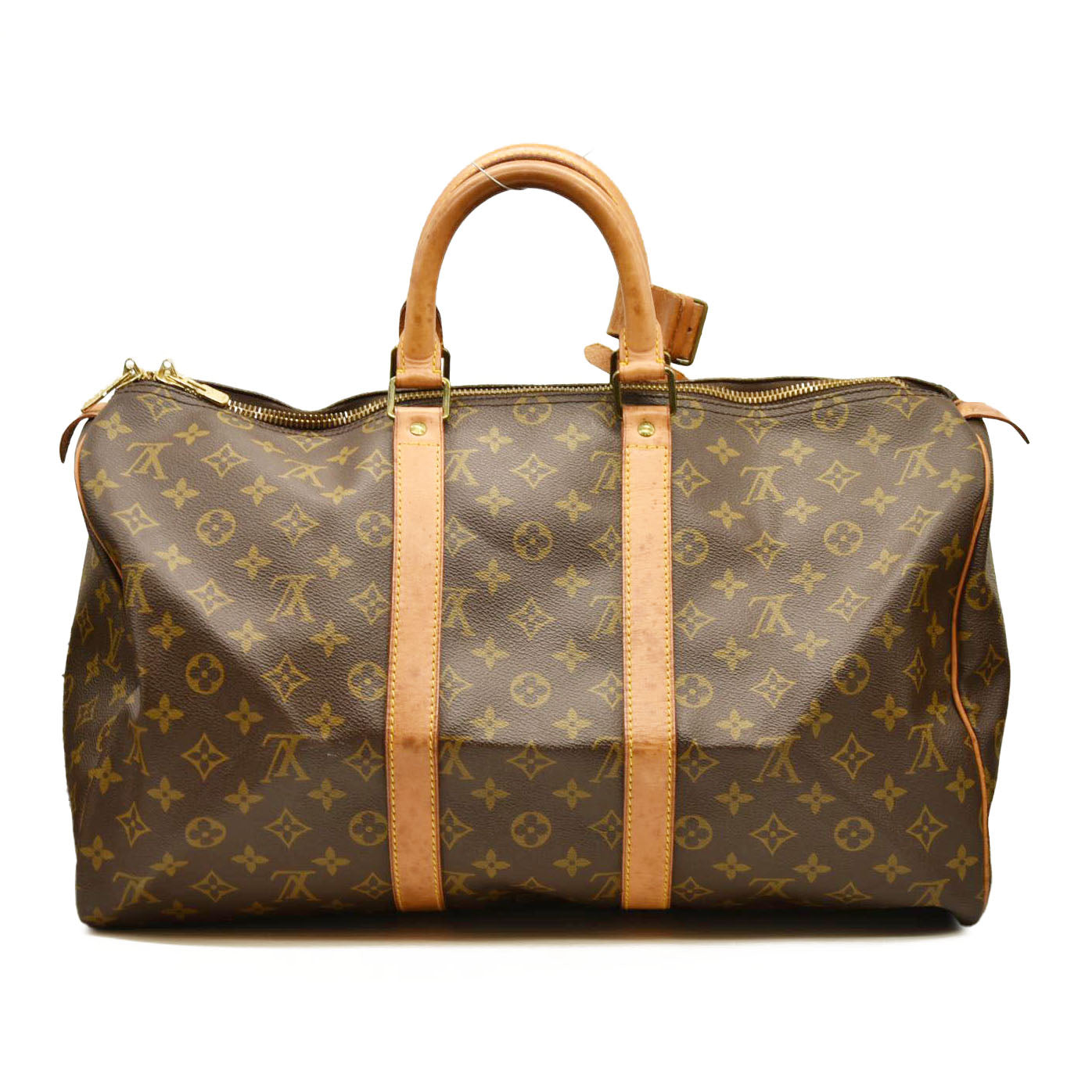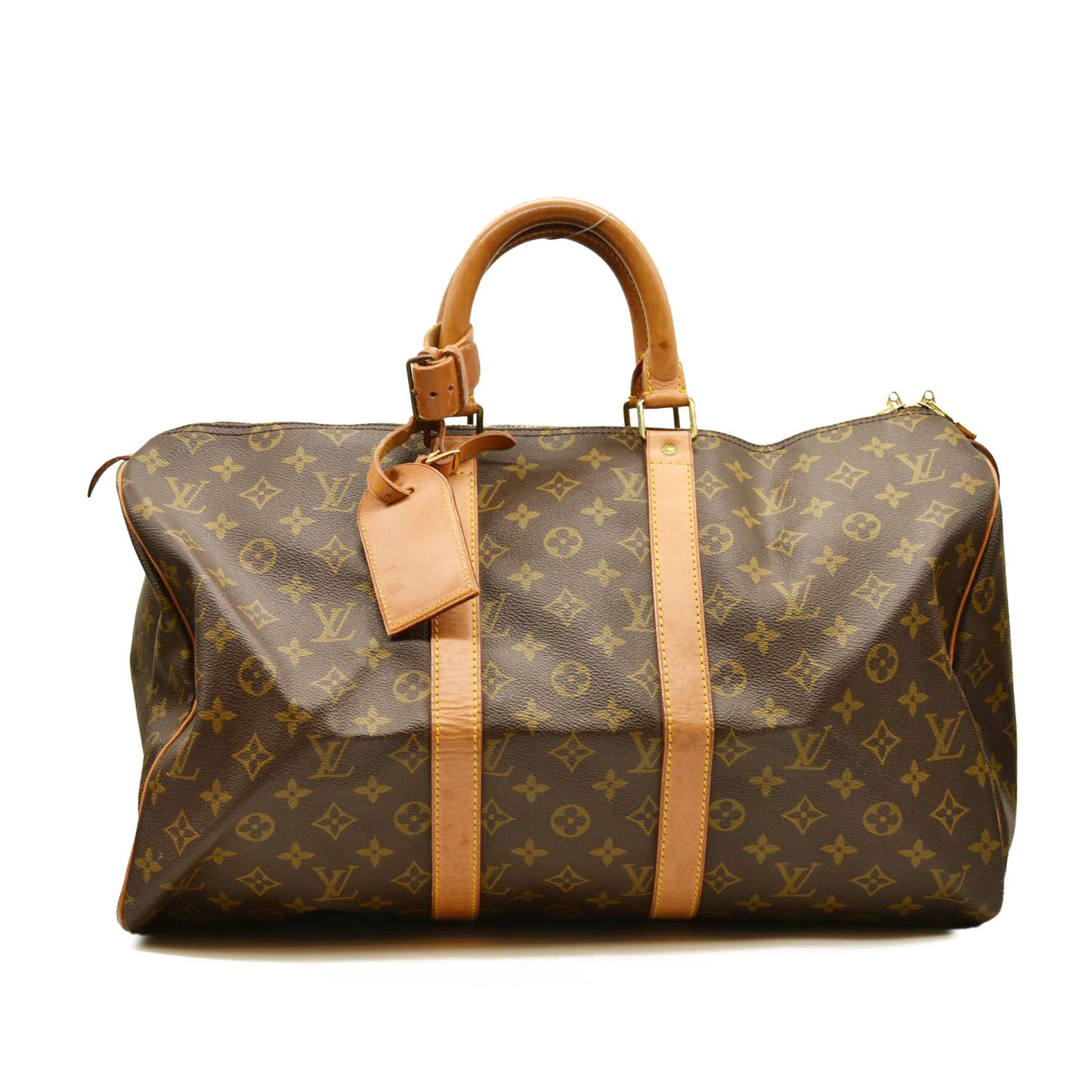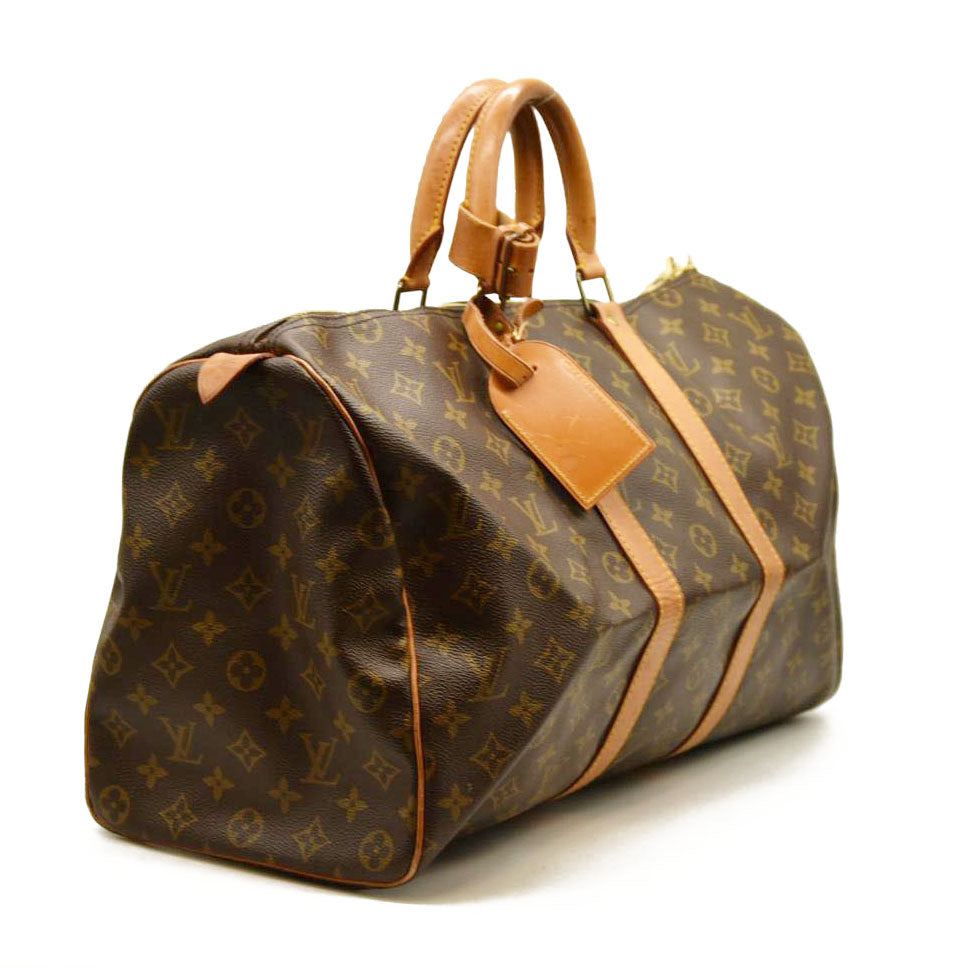 This is an authentic LOUIS VUITTON Monogram Keepall 55. This duffle is crafted of signature Louis Vuitton monogram coated canvas. The bag features vachetta cowhide leather accents including rolled top handles, piping, and trim. The brass top zippers open to a spacious cocoa brown fabric interior.