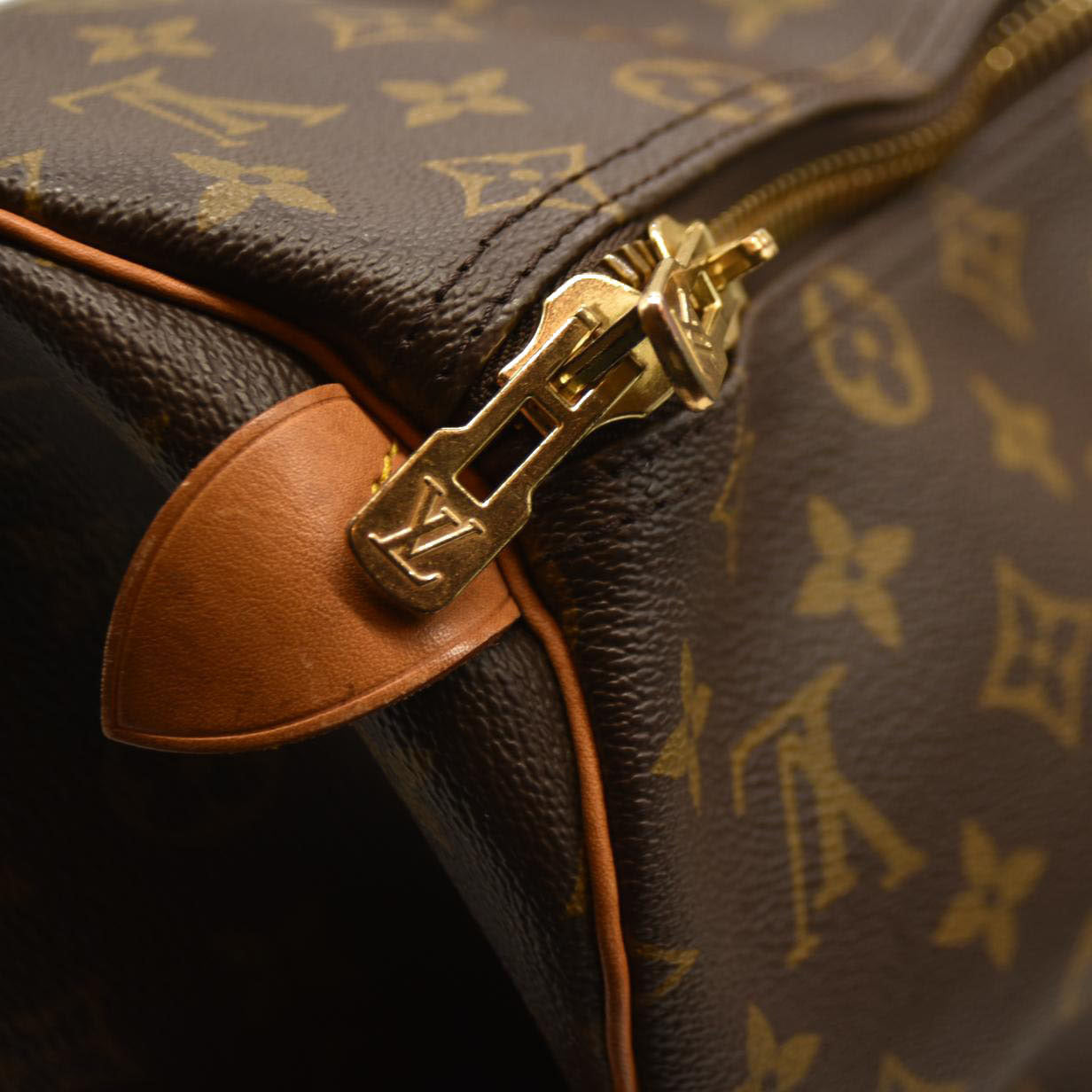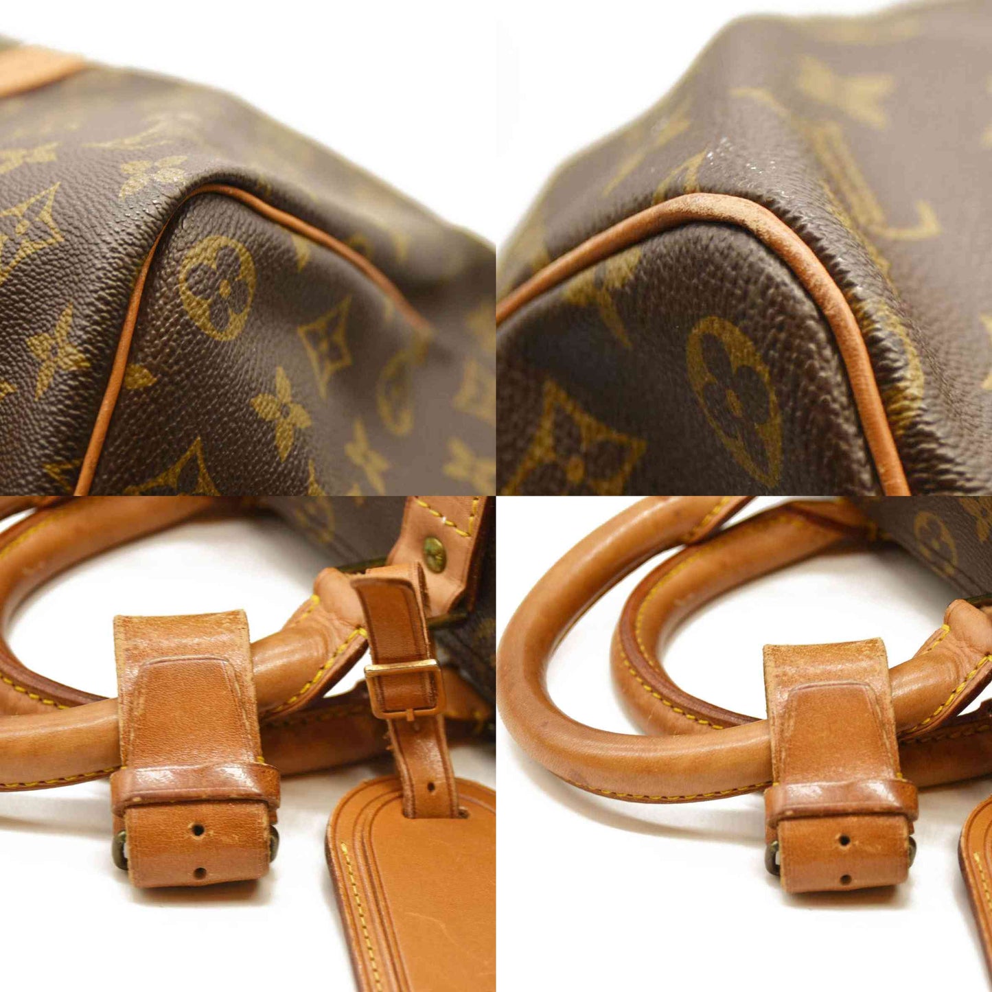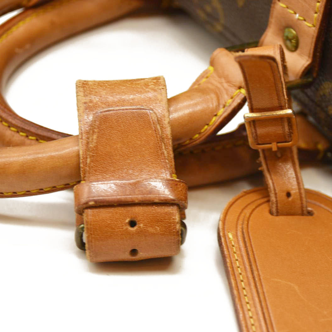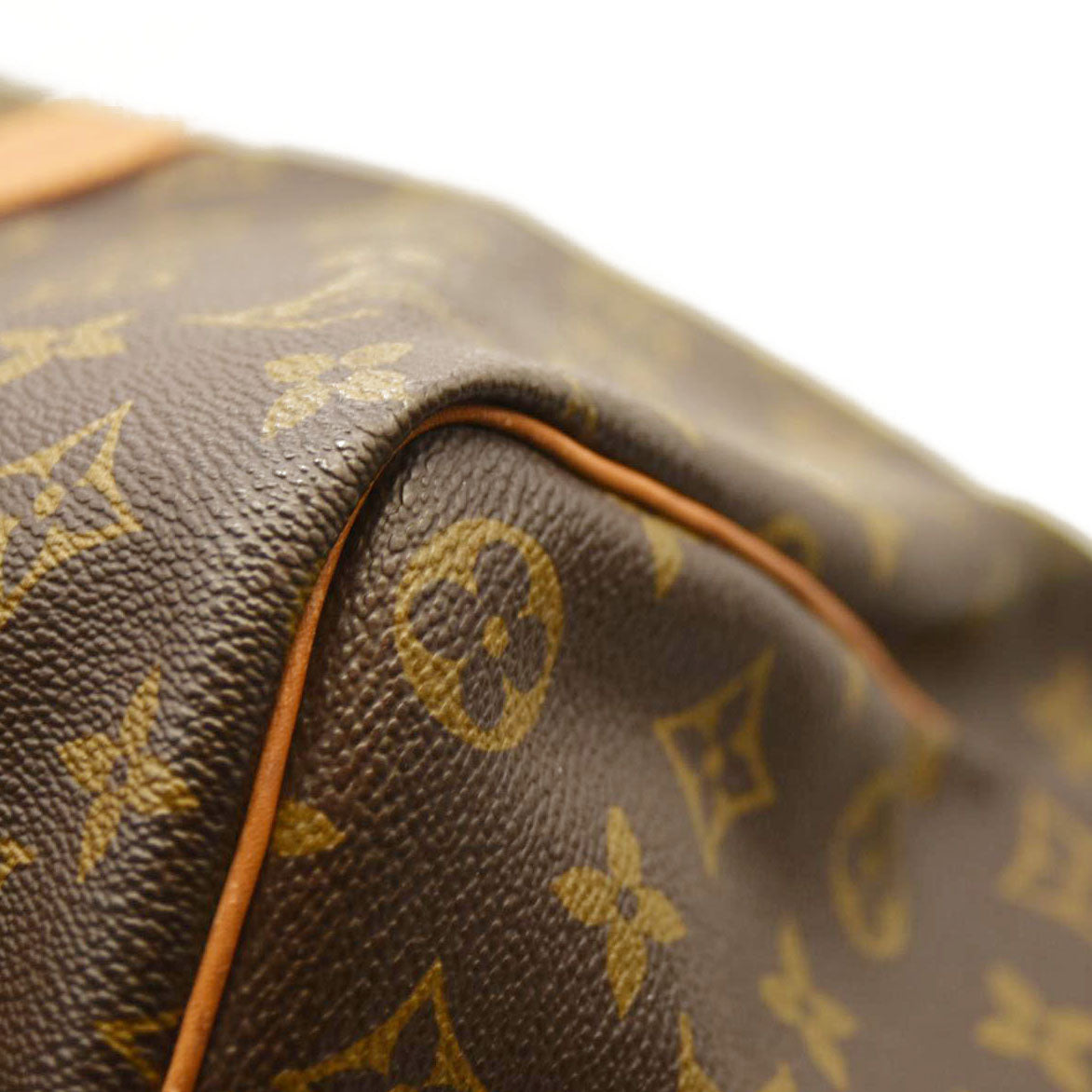 This is an authentic LOUIS VUITTON Monogram Keepall 55. This duffle is crafted of signature Louis Vuitton monogram coated canvas. The bag features vachetta cowhide leather accents including rolled top handles, piping, and trim. The brass top zippers open to a spacious cocoa brown fabric interior.