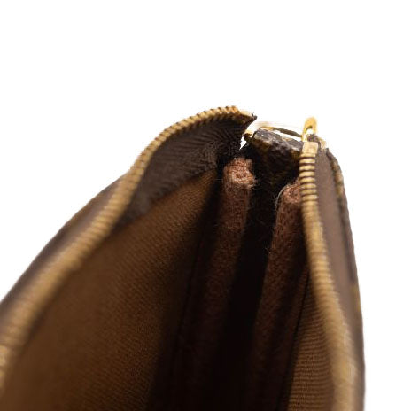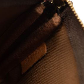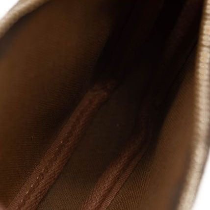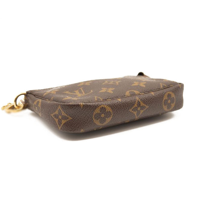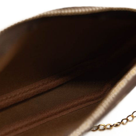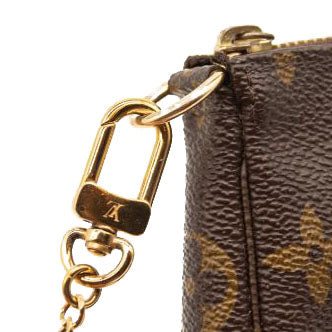 This is an authentic LOUIS VUITTON Monogram Mini Pochette Accessories. This pochette is crafted of classic Louis Vuitton monogram on coated canvas. The pochette features a gold chain strap and a gold top zipper that opens to a cocoa brown fabric interior.