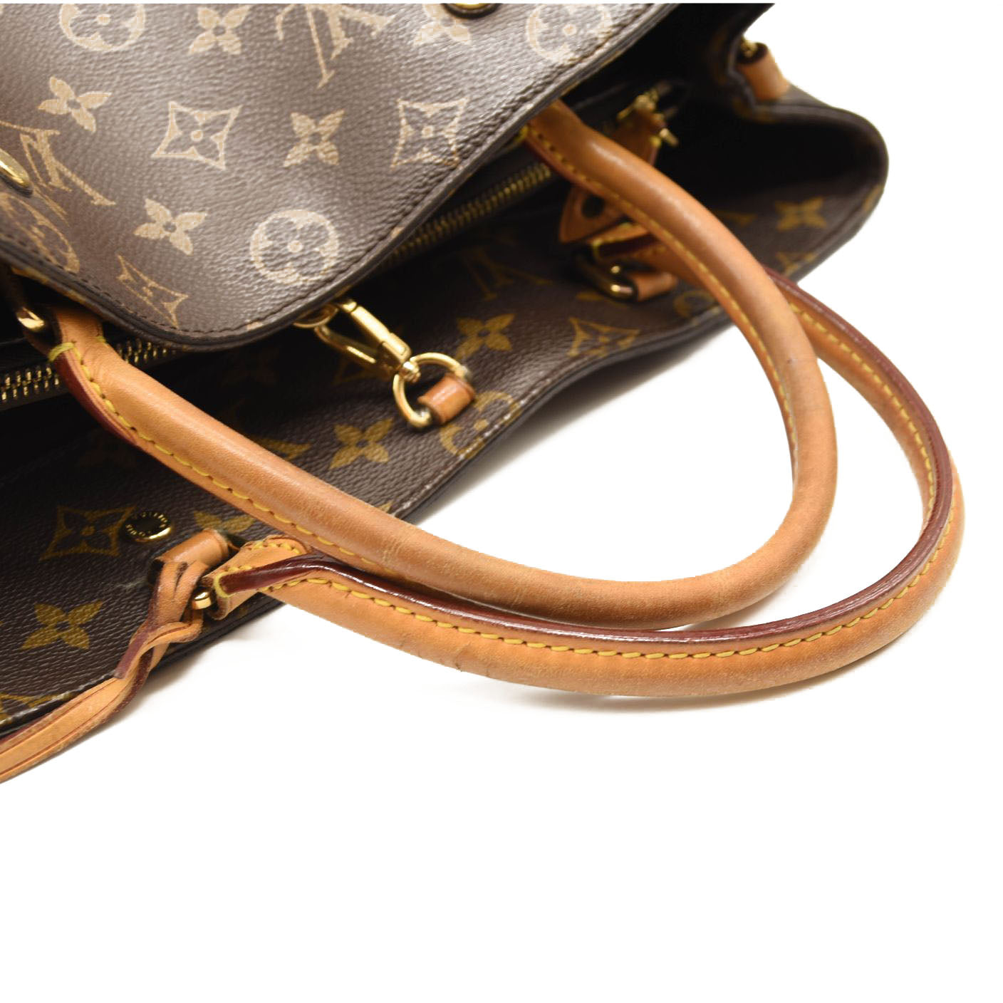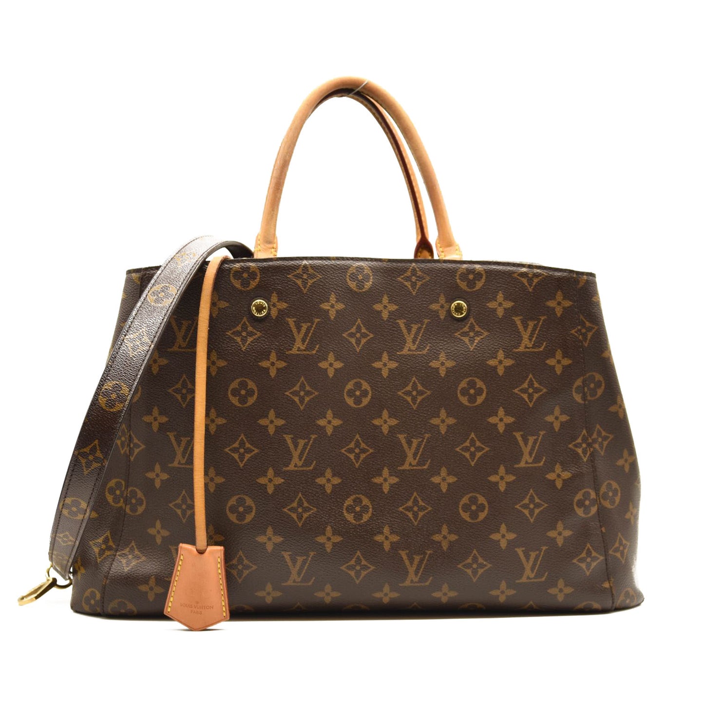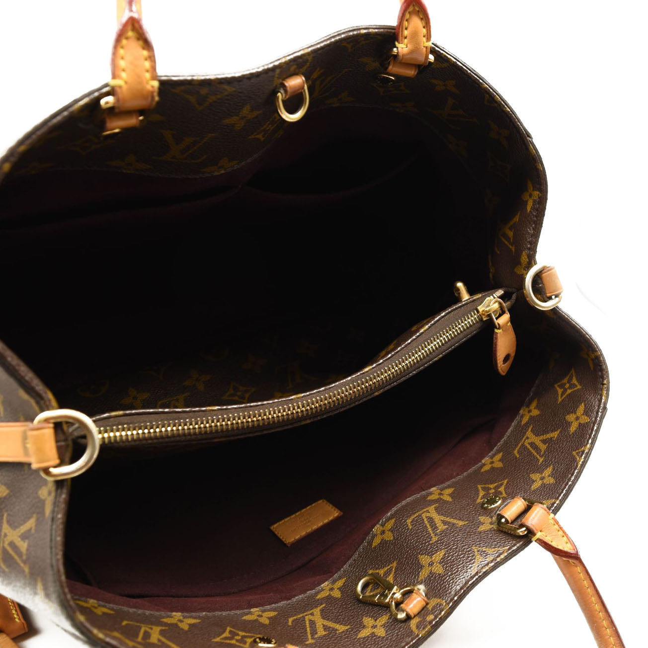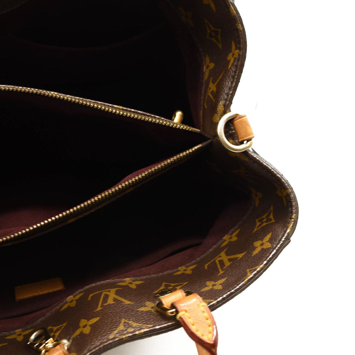 This is an authentic LOUIS VUITTON Monogram Montaigne MM. This chic tote is crafted of Louis Vuitton monogram toile canvas. The bag features rolled vachetta leather top handles, an optional coated toile canvas shoulder strap, and gold-toned hardware. The top is open to a partitioned plum purple microfiber interior with a central zipper compartment and patch pockets.