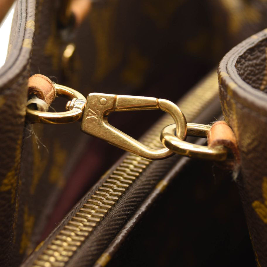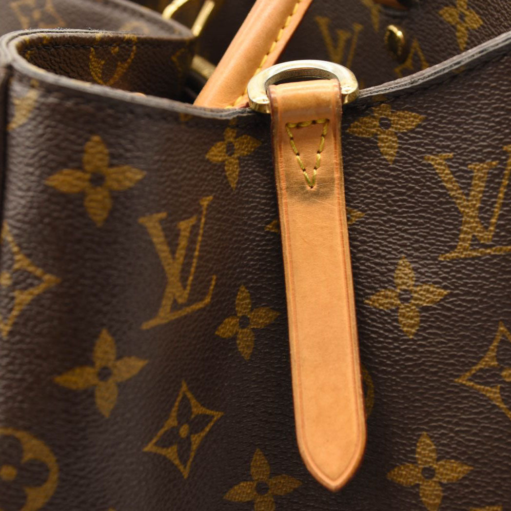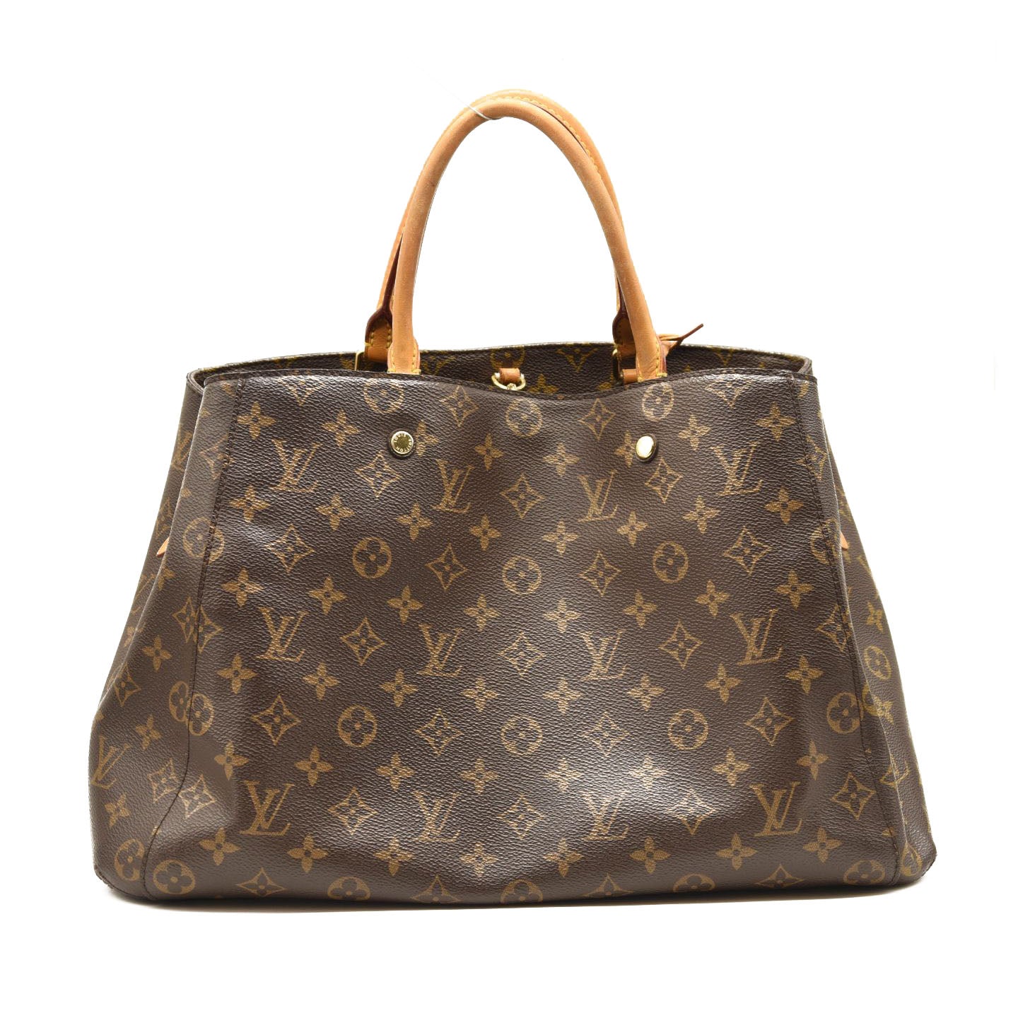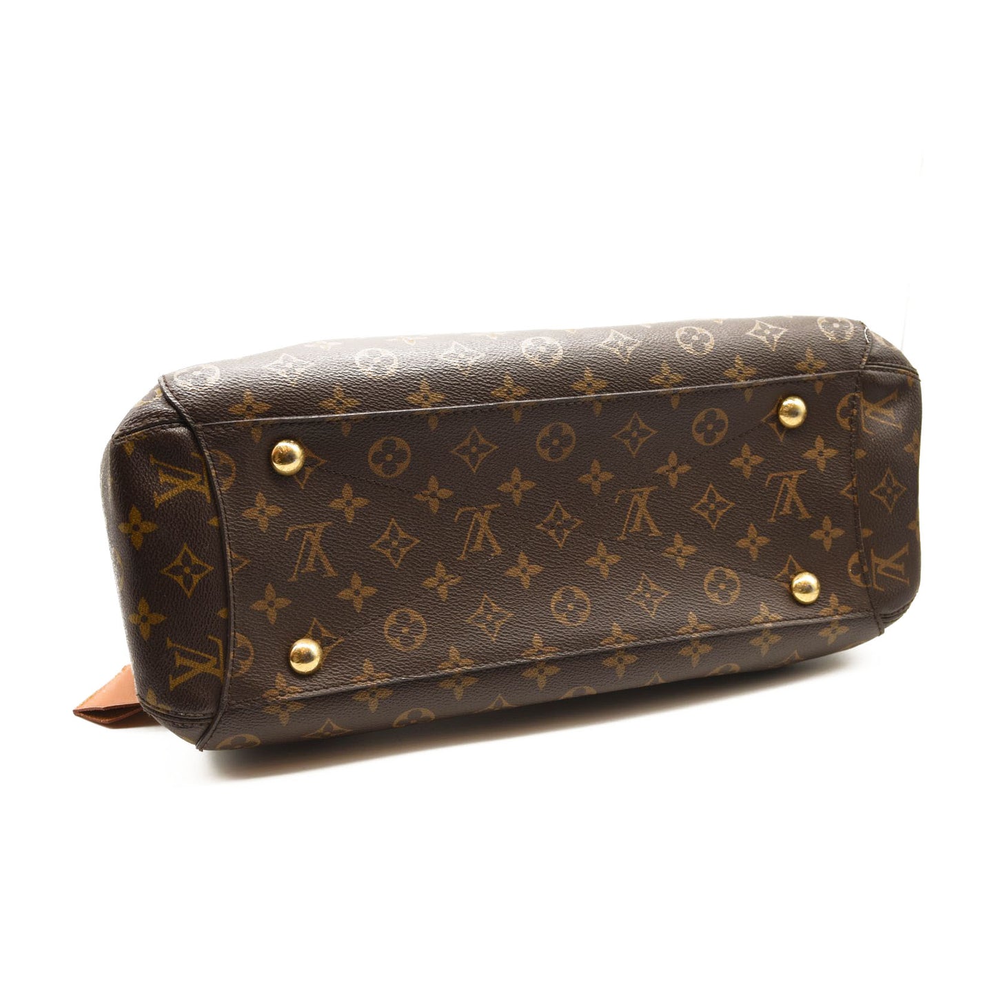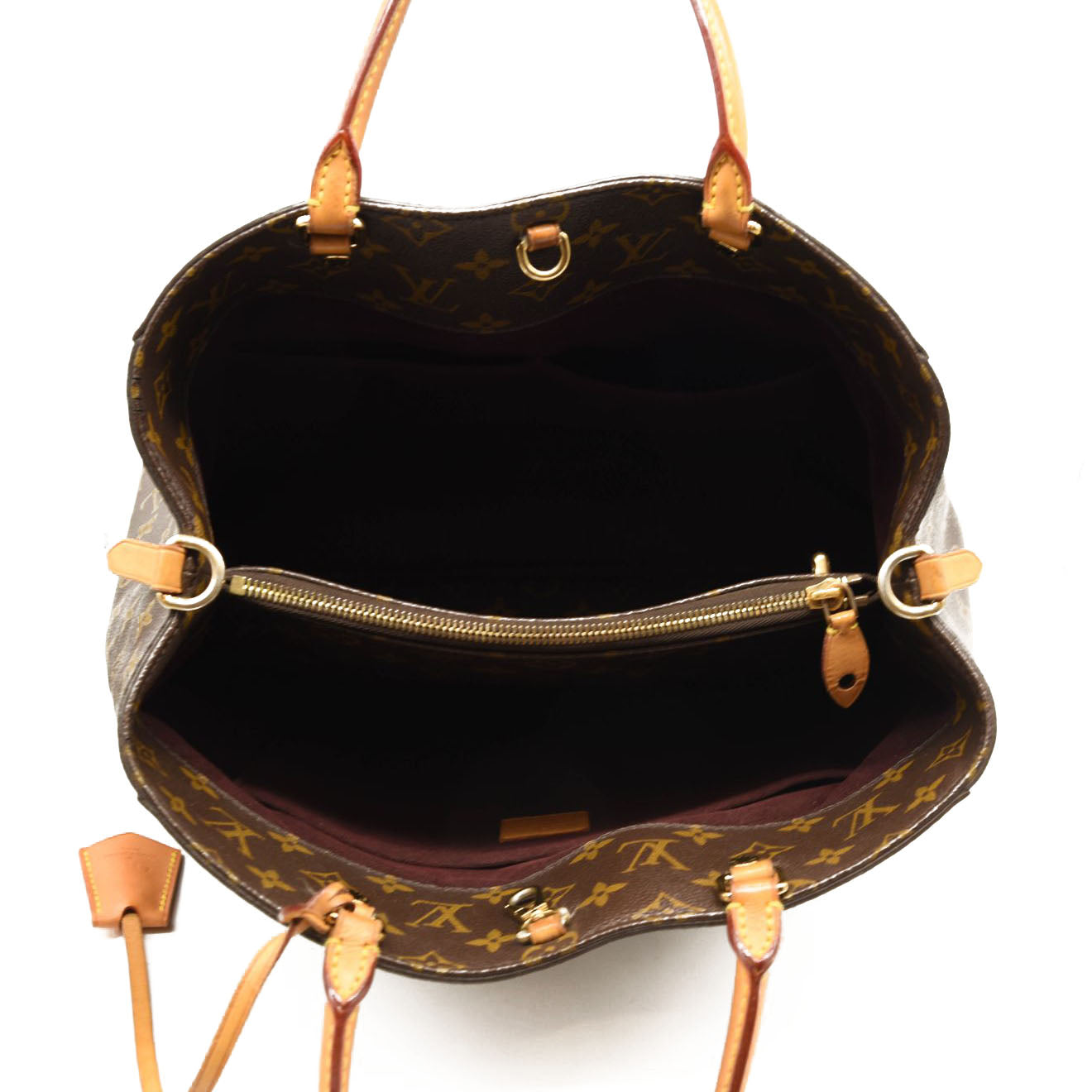 This is an authentic LOUIS VUITTON Monogram Montaigne MM. This chic tote is crafted of Louis Vuitton monogram toile canvas. The bag features rolled vachetta leather top handles, an optional coated toile canvas shoulder strap, and gold-toned hardware. The top is open to a partitioned plum purple microfiber interior with a central zipper compartment and patch pockets.