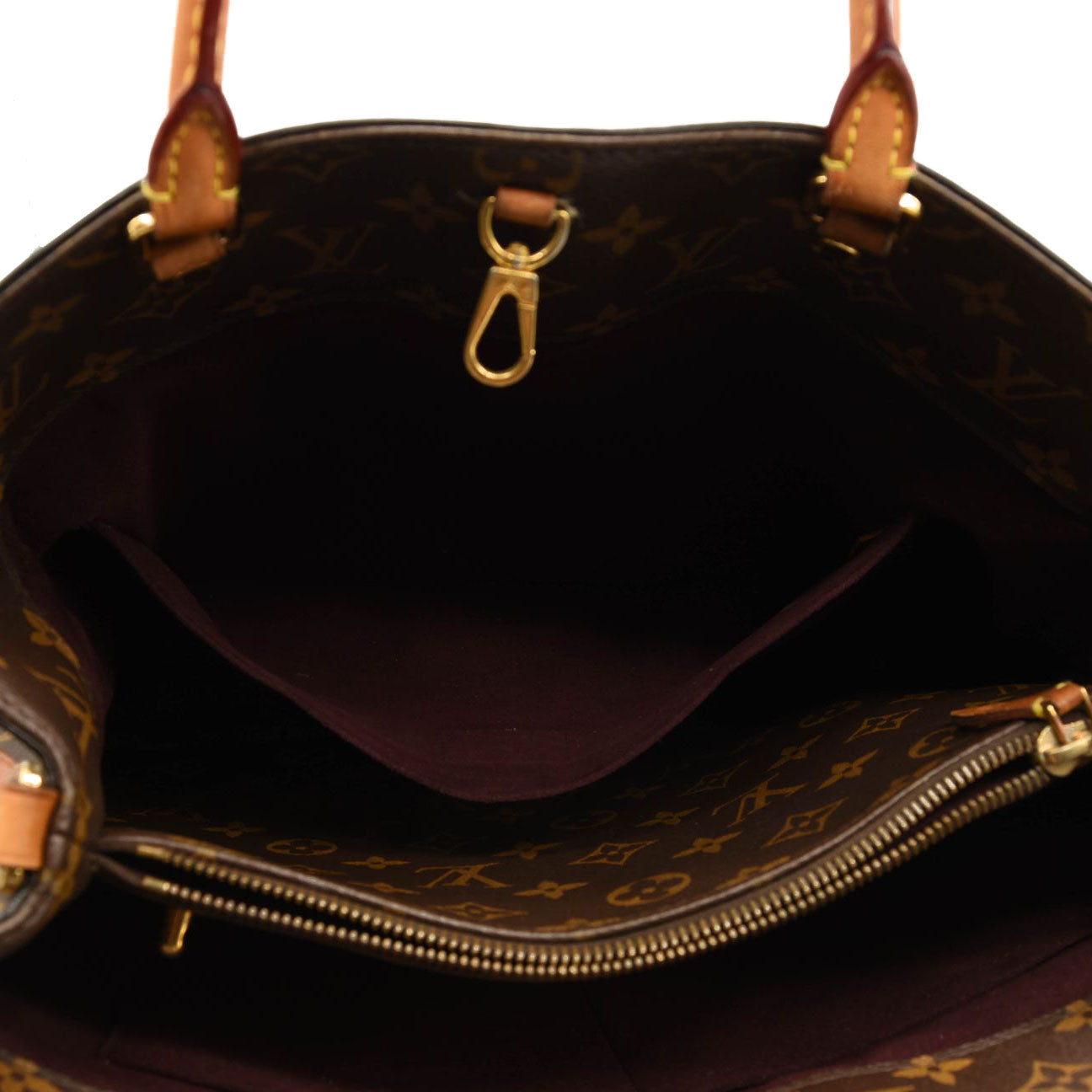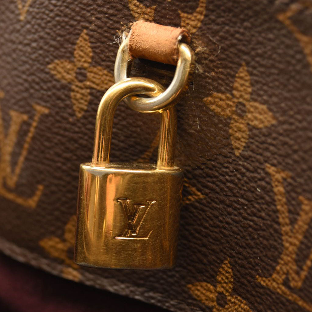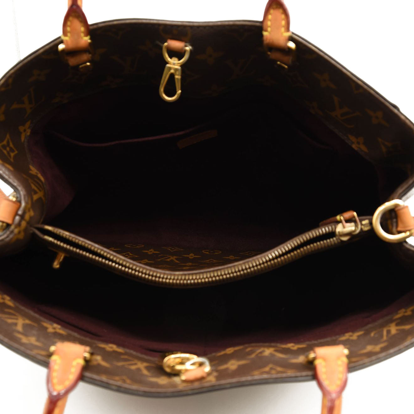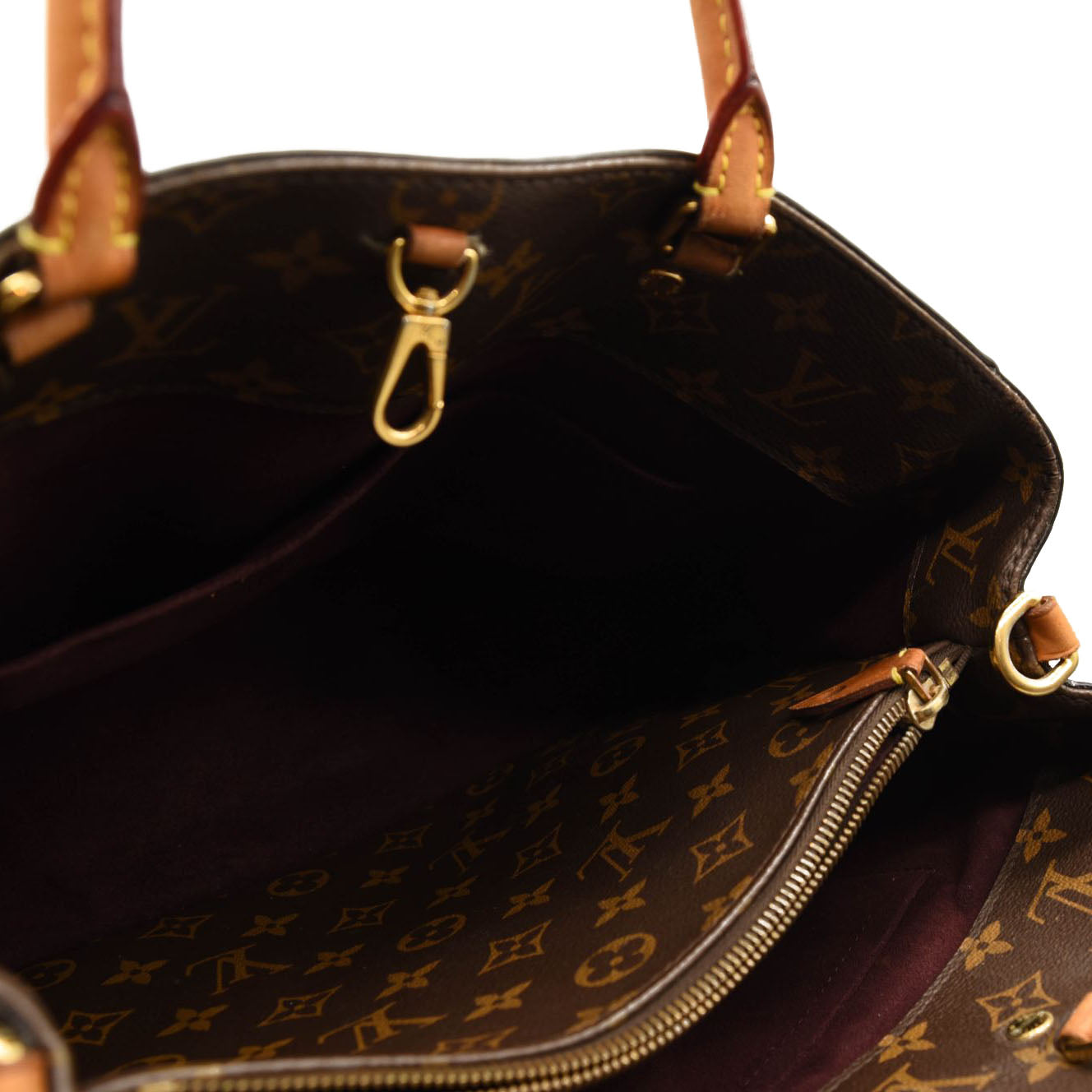 This is an authentic LOUIS VUITTON Monogram Montaigne MM. This chic tote is crafted of Louis Vuitton monogram toile canvas. The bag features rolled vachetta leather top handles, an optional coated toile canvas shoulder strap, and gold-toned hardware. The top is open to a partitioned plum purple microfiber interior with a central zipper compartment and patch pockets.