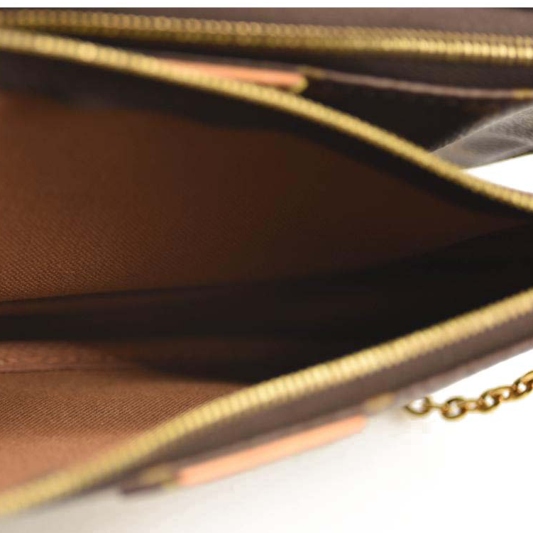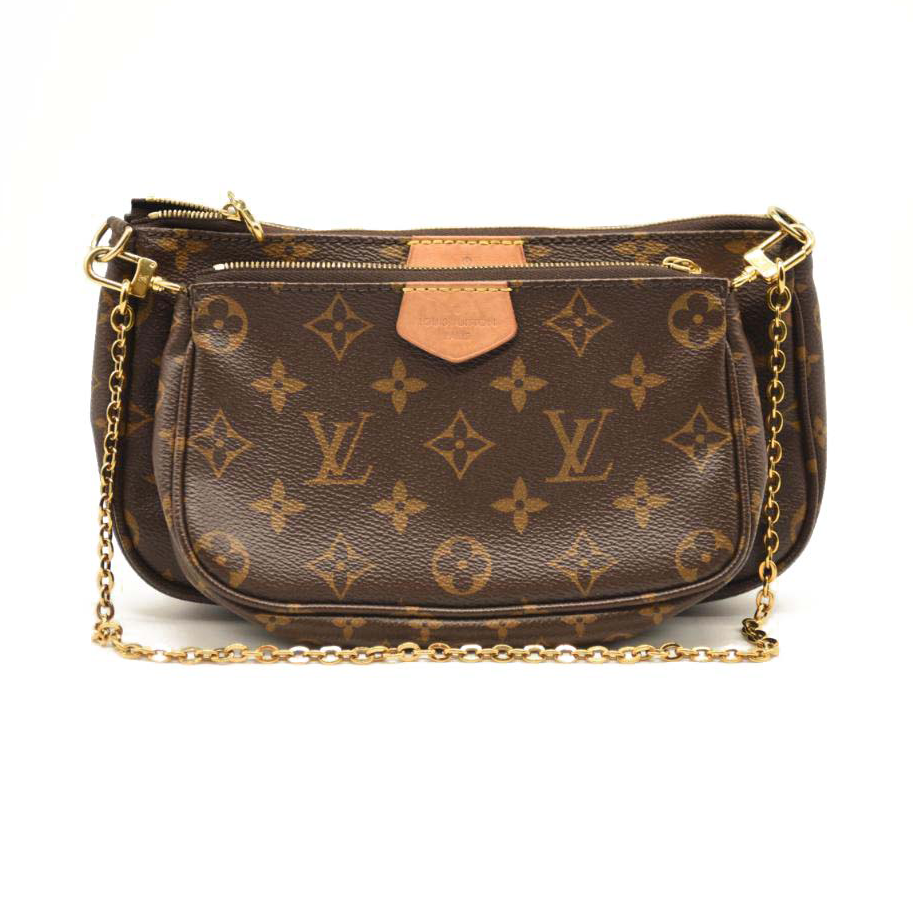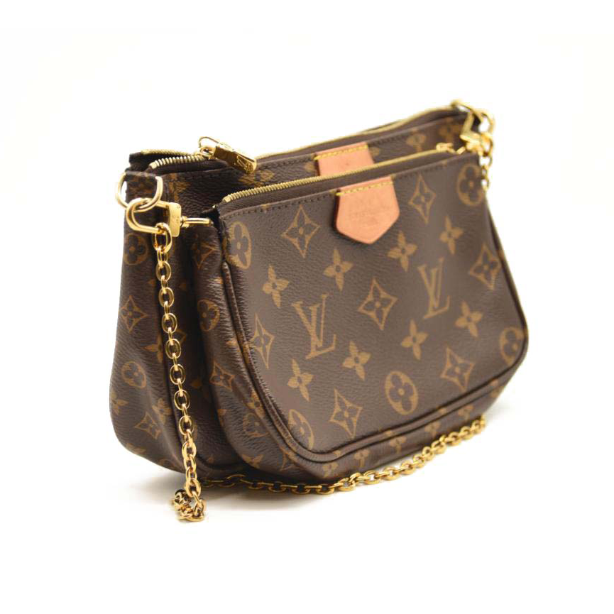 This is an authentic LOUIS VUITTON Monogram Multi Pochette Accessories in Rose Clair. This hybrid crossbody bag is crafted of monogram and mini monogram coated canvas in brown. The set features a pochette accessoires, a mini pochette accessoires, and a round coin purse attached to the adjustable pink canvas strap. The set also features a gold chain strap for multiple carrying options. The pochettes open to brown canvas interiors and the coin purse opens to a beige leather interior.
