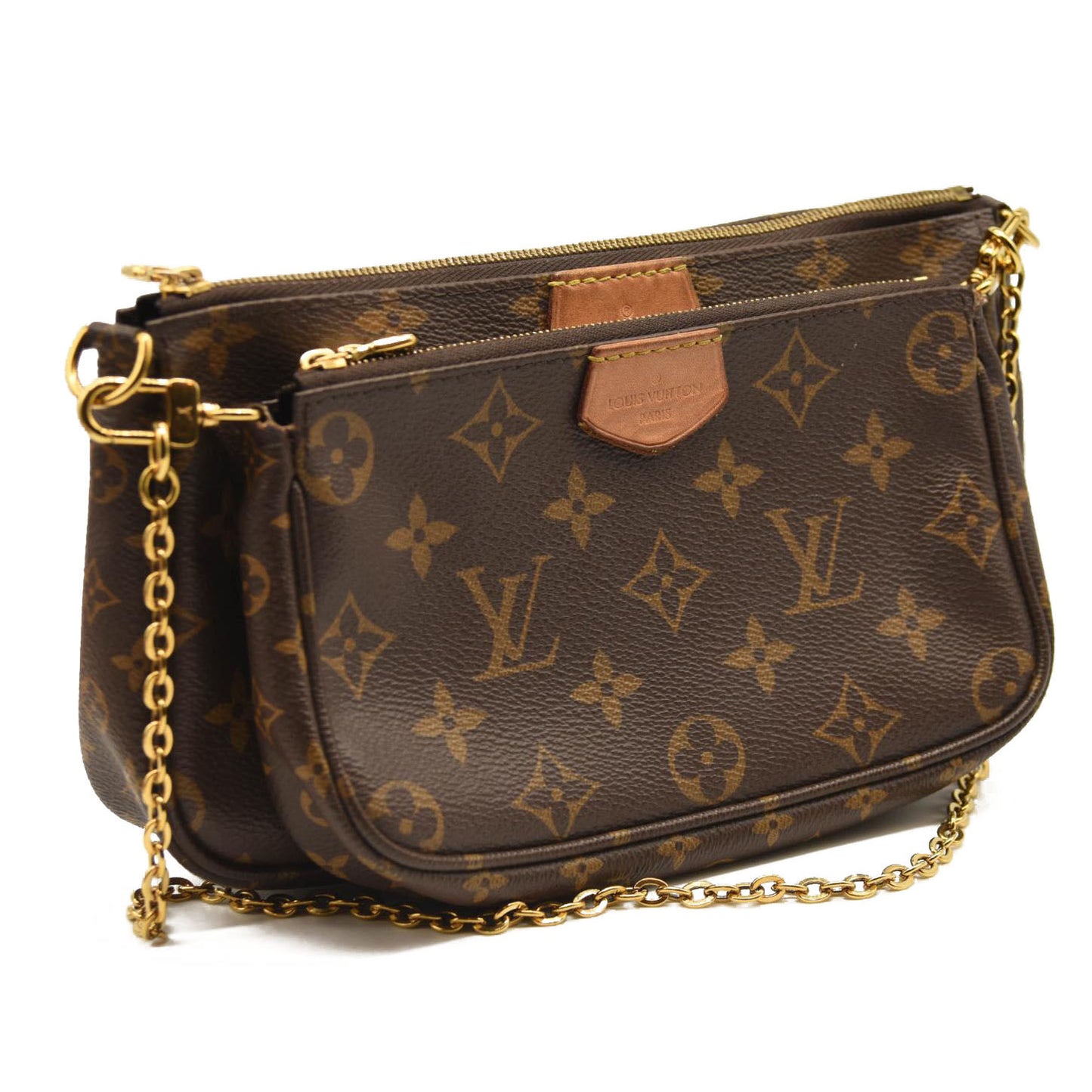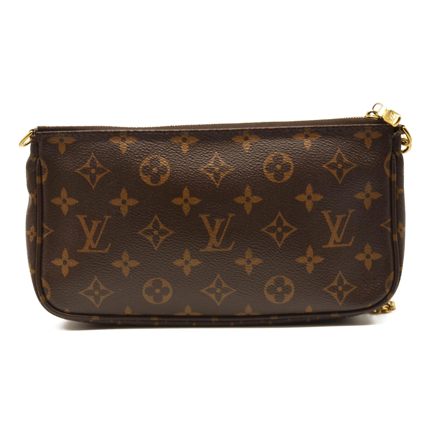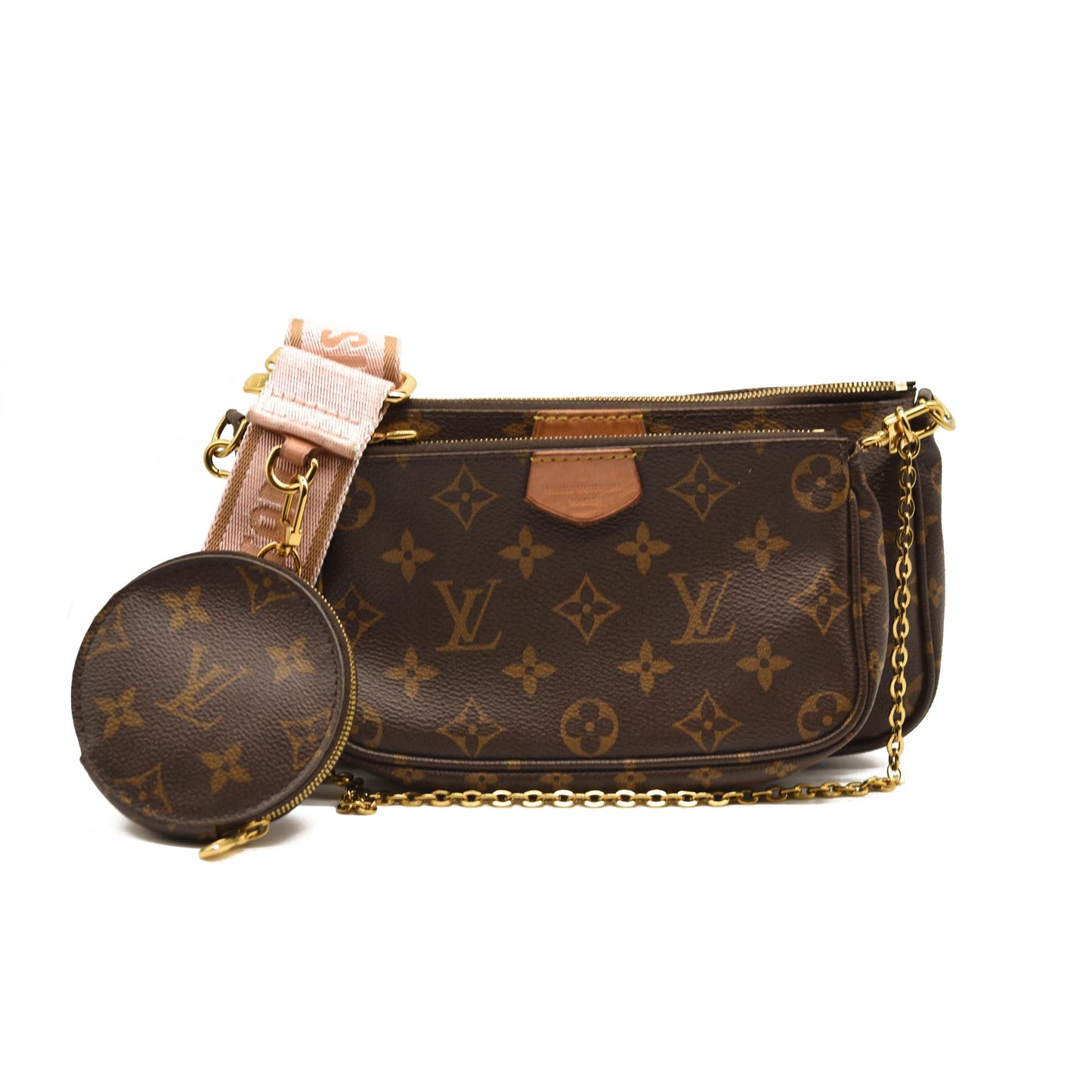 This is an authentic LOUIS VUITTON Monogram Multi Pochette Accessories in Rose Clair. This pochette is crafted of signature Louis Vuitton monogram on toile canvas. The bag features a polished brass top zipper, pink and light brown shoulder strap, and two removable pouches. The top zipper opens to a cocoa brown fabric interior with a flat pocket. This is a perfect multi pouch for everyday use, only from Louis Vuitton!