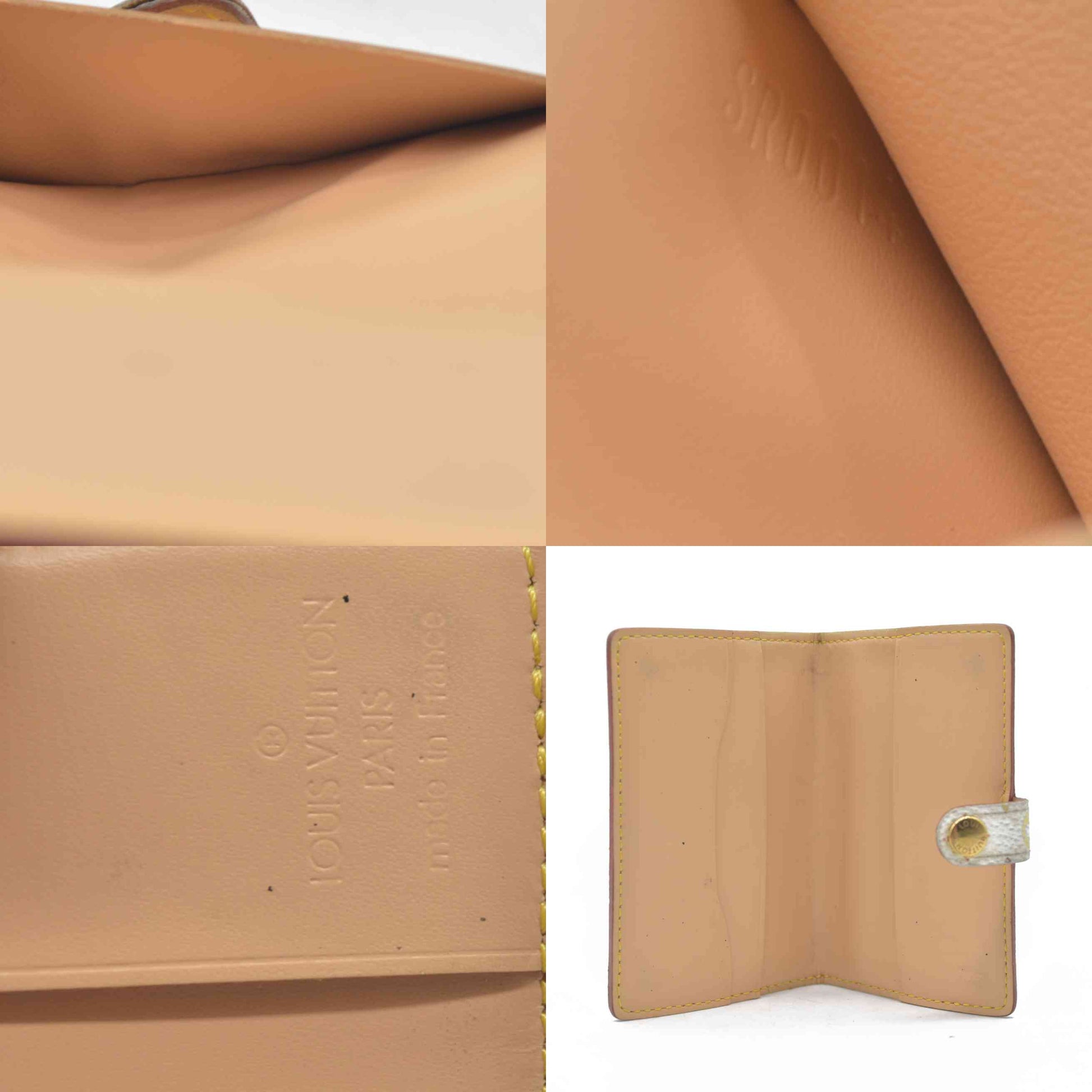 White coated canvas Louis Vuitton Monogram Multicolore small ring agenda cover with tan Vachetta leather trim, creme leather lining, single pen loop, dual slip pockets, three card slots, snap closure and brand stamp at interior.