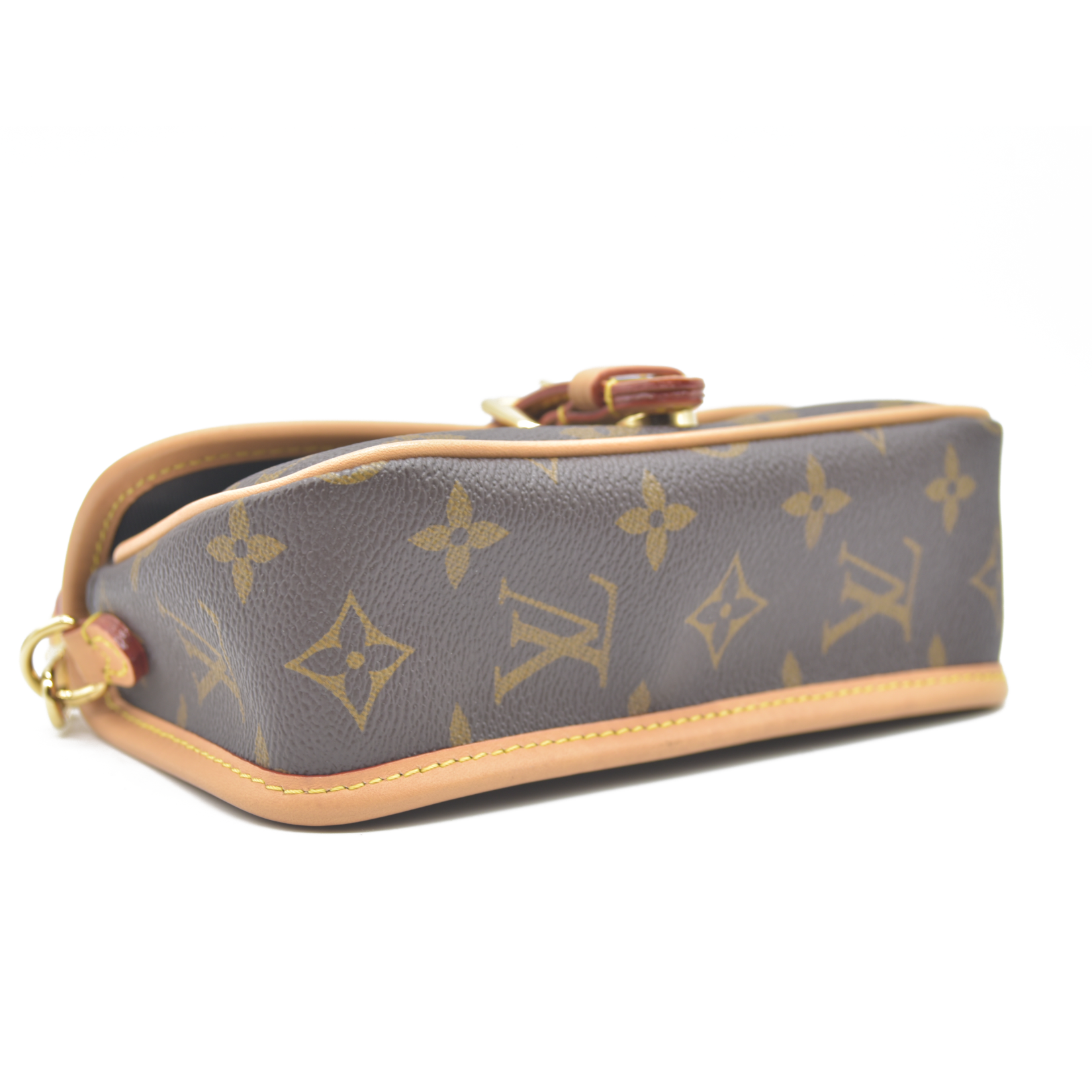 This is an authentic LOUIS VUITTON Empreinte Monogram Nano Diane. This chic shoulder bag is crafted of Louis Vuitton monogram on coated canvas. it features vachetta leather accents, a rounded flap with a magnetic closure, and a belt-style design. The bag includes a removable strap and an adjustable shoulder strap. The front flap opens with a magnetic buckle to a matching microfiber interior.