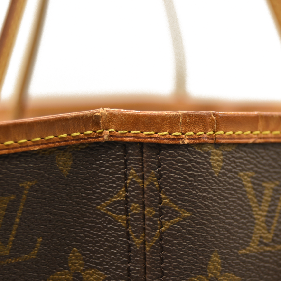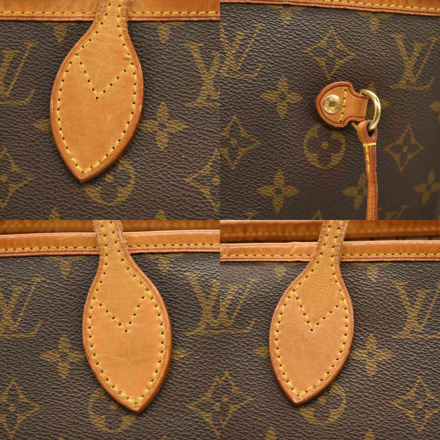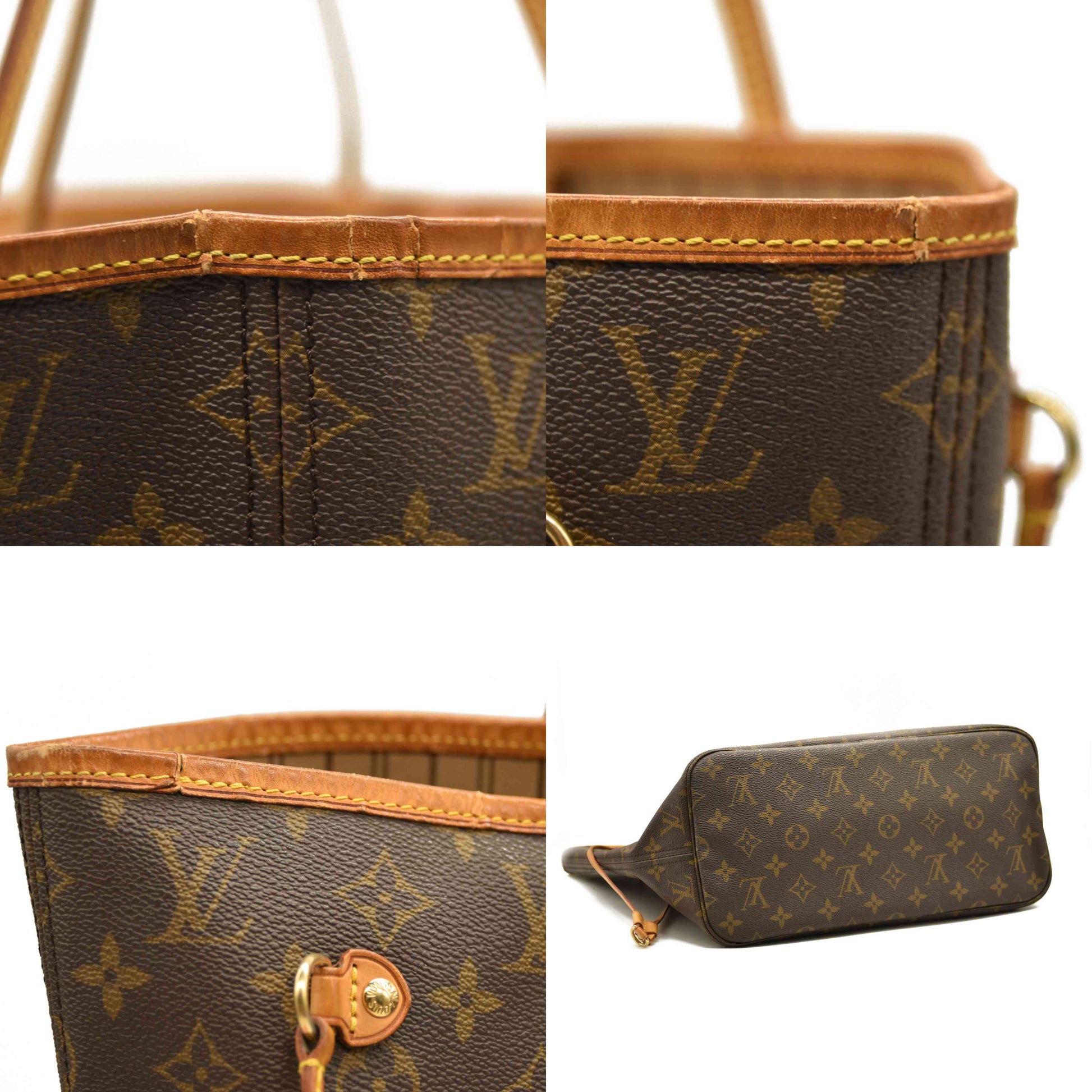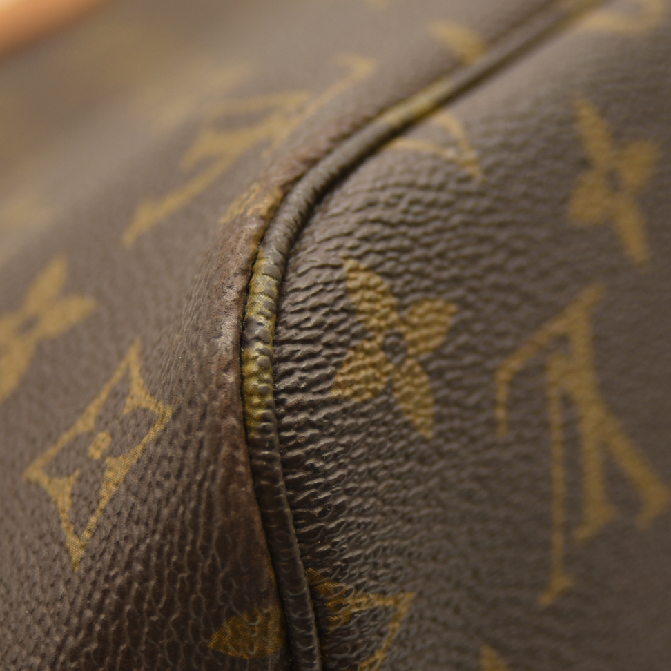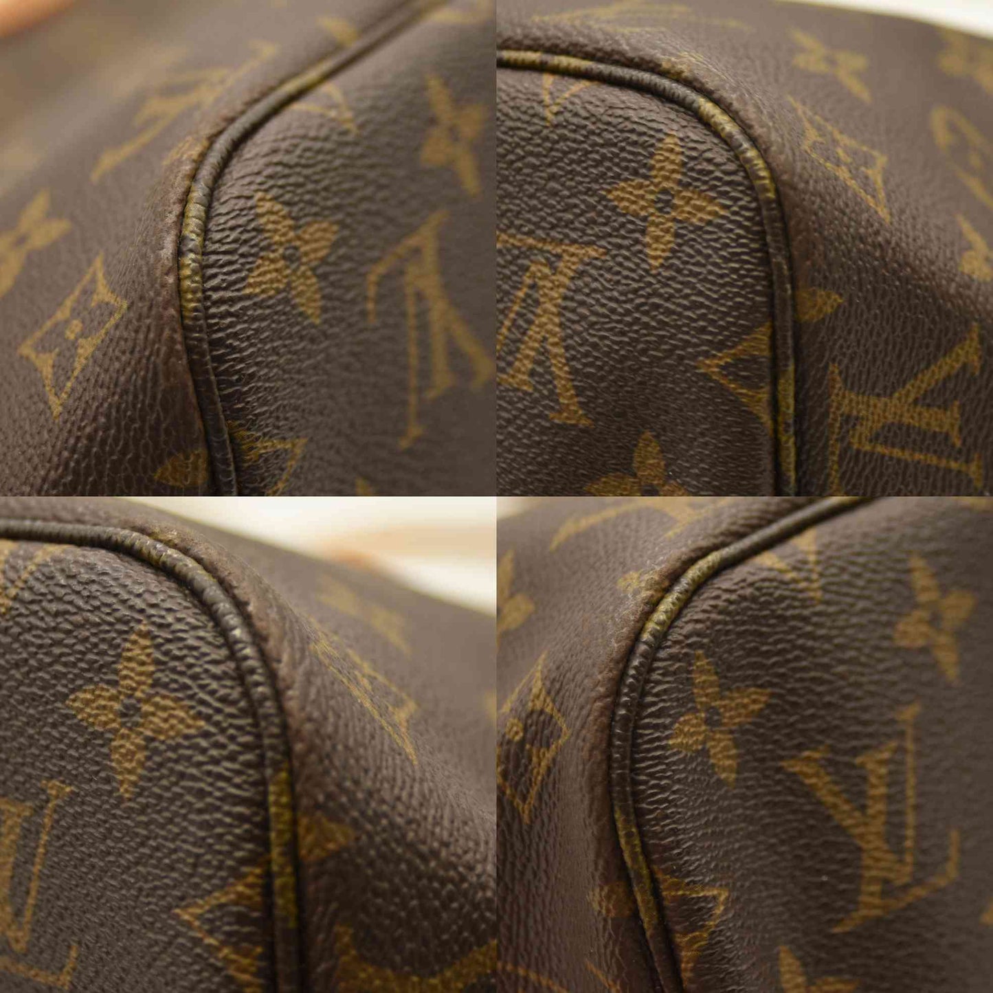 Many wrinkles, Some faded, Many abrasion, Much soiled, Many scratches, Many cracking, Undefined stain area, Defined stain in some area, Small holes due to many abrasion, Monogram leather is slightly torn off where shoulder strap's holding leather is stitched down, Leather surface is worn out along edges, Many cracking along stitch holes, Defined cracking around opening area obviously shows, Opening edge damaged, Please see the pictures carefully
