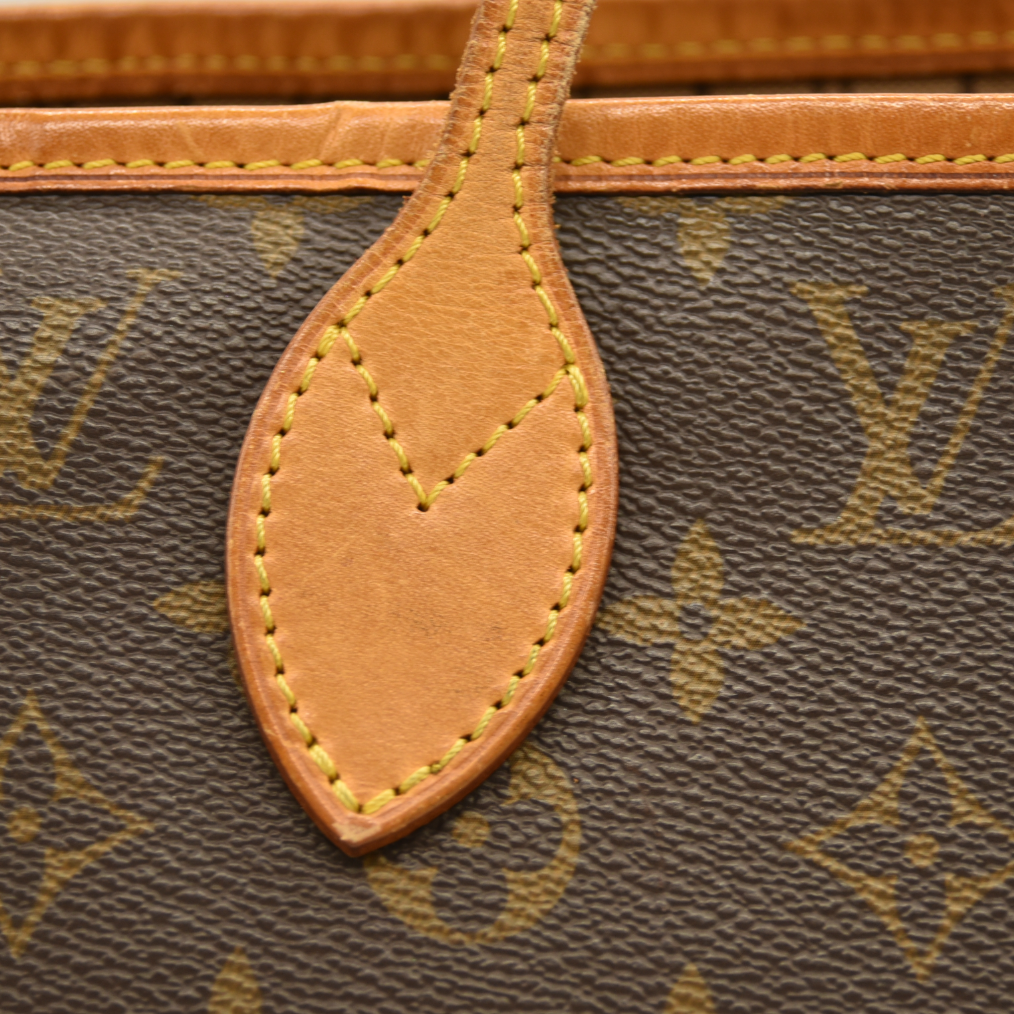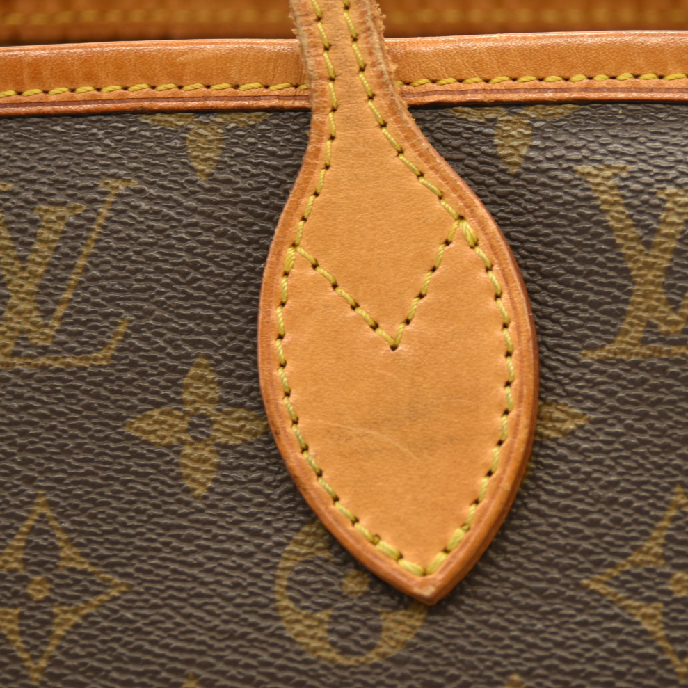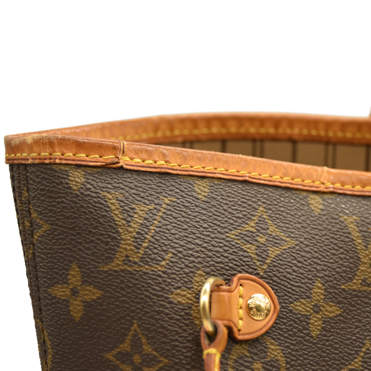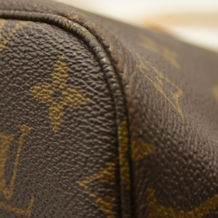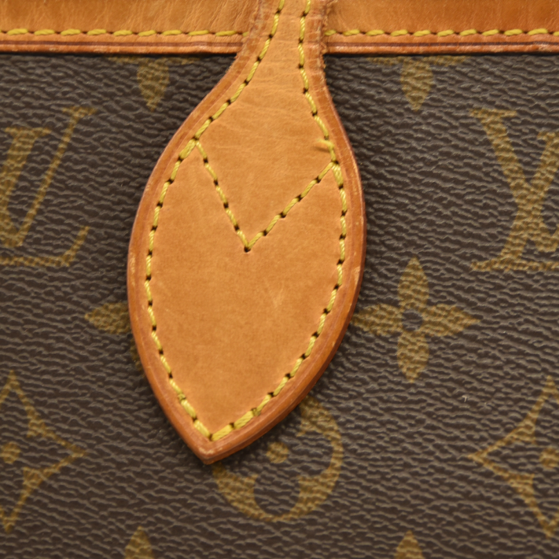 Many wrinkles, Some faded, Many abrasion, Much soiled, Many scratches, Many cracking, Undefined stain area, Defined stain in some area, Small holes due to many abrasion, Monogram leather is slightly torn off where shoulder strap's holding leather is stitched down, Leather surface is worn out along edges, Many cracking along stitch holes, Defined cracking around opening area obviously shows, Opening edge damaged, Please see the pictures carefully