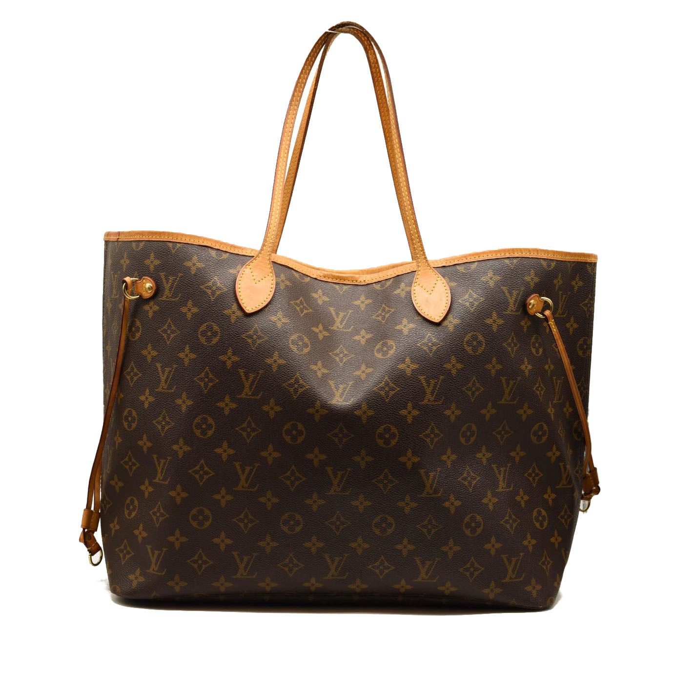 This is an authentic LOUIS VUITTON Monogram Neverfull GM. This stylish tote is crafted of classic Louis Vuitton monogram coated canvas. It features vachetta cowhide leather trim, handles, and side cinch cords with polished brass hardware. The top is open to a beige striped fabric interior with a hanging zipper pocket.