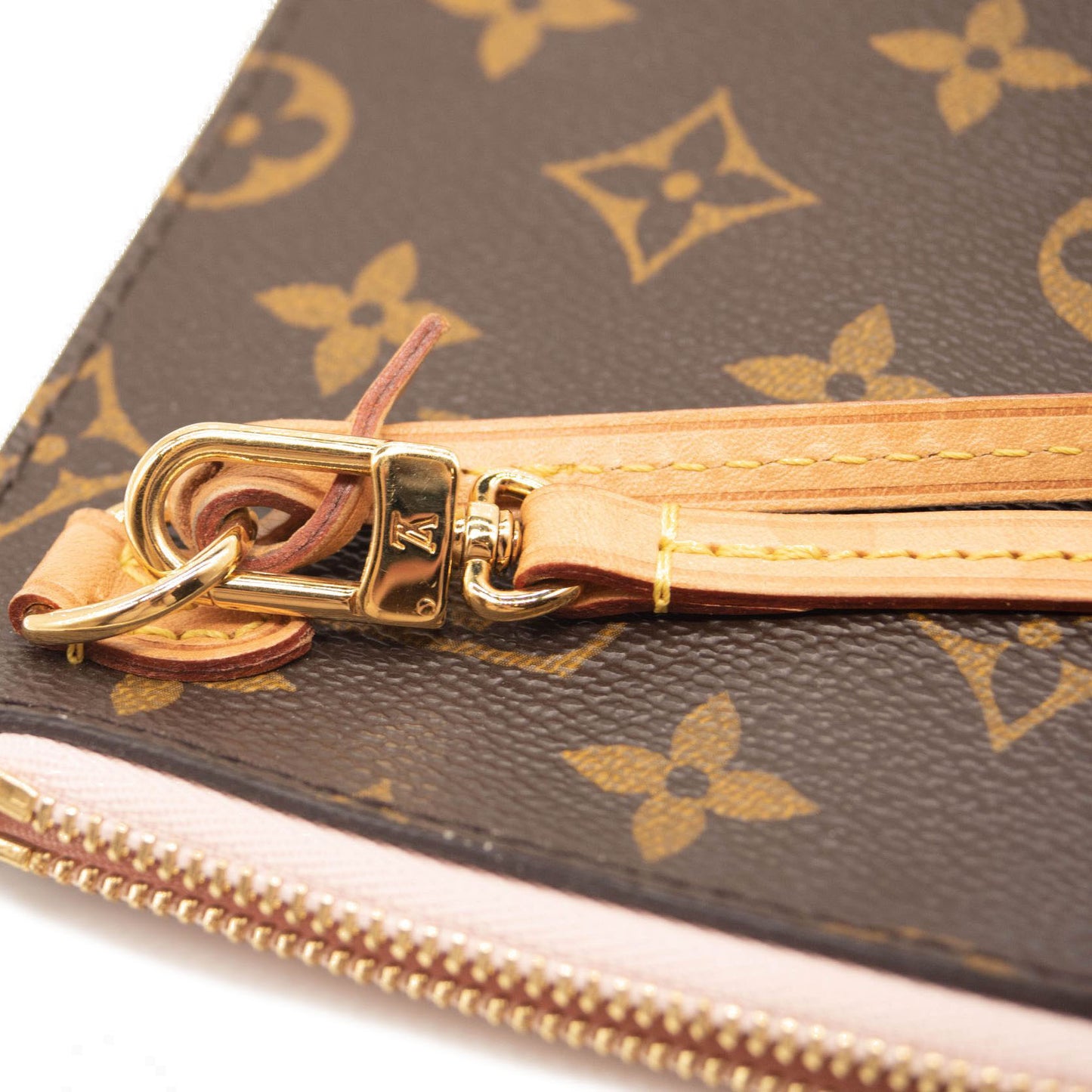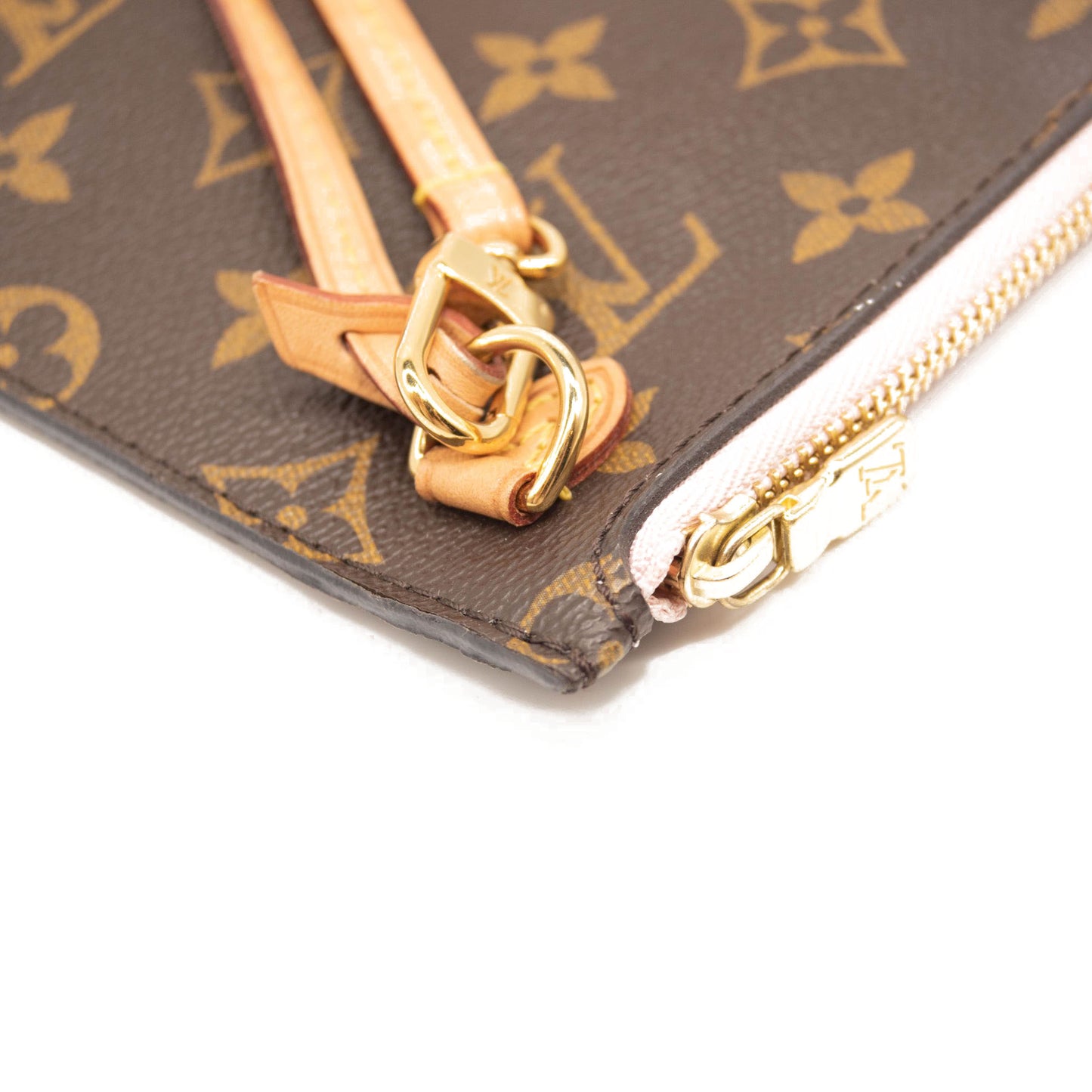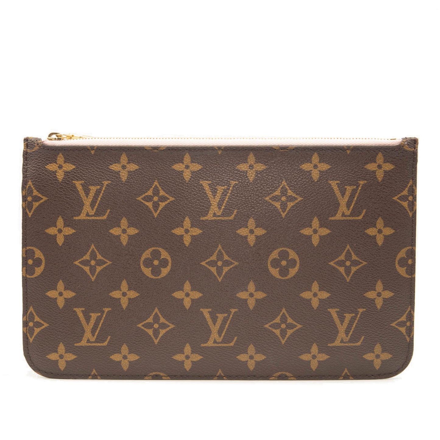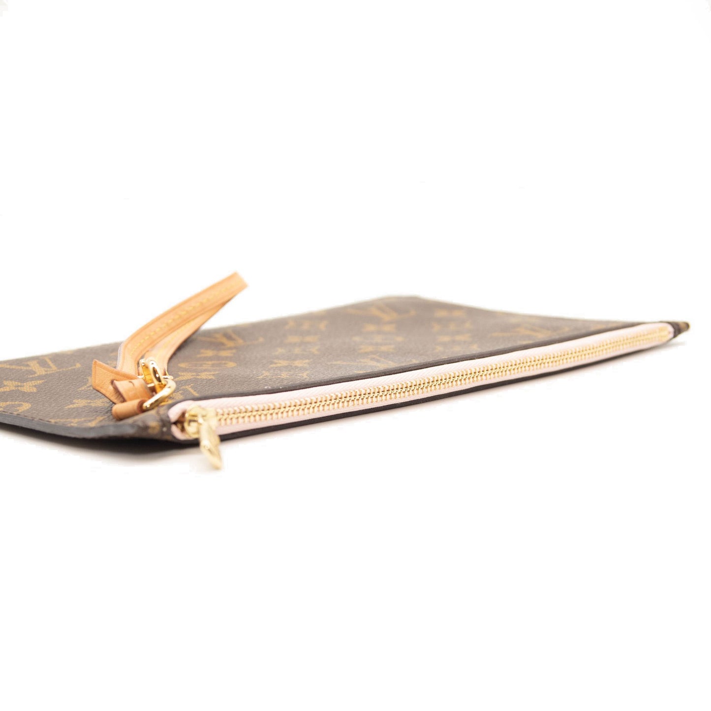 This is an authentic LOUIS VUITTON Monogram Neverfull MM GM Pochette in Rose Ballerine. This chic pouch is made of traditional Louis Vuitton monogram coated canvas. The pouch features polished gold hardware and a vachetta natural leather wrist strap. The top zipper opens to pink striped fabric interior with a pocket.
