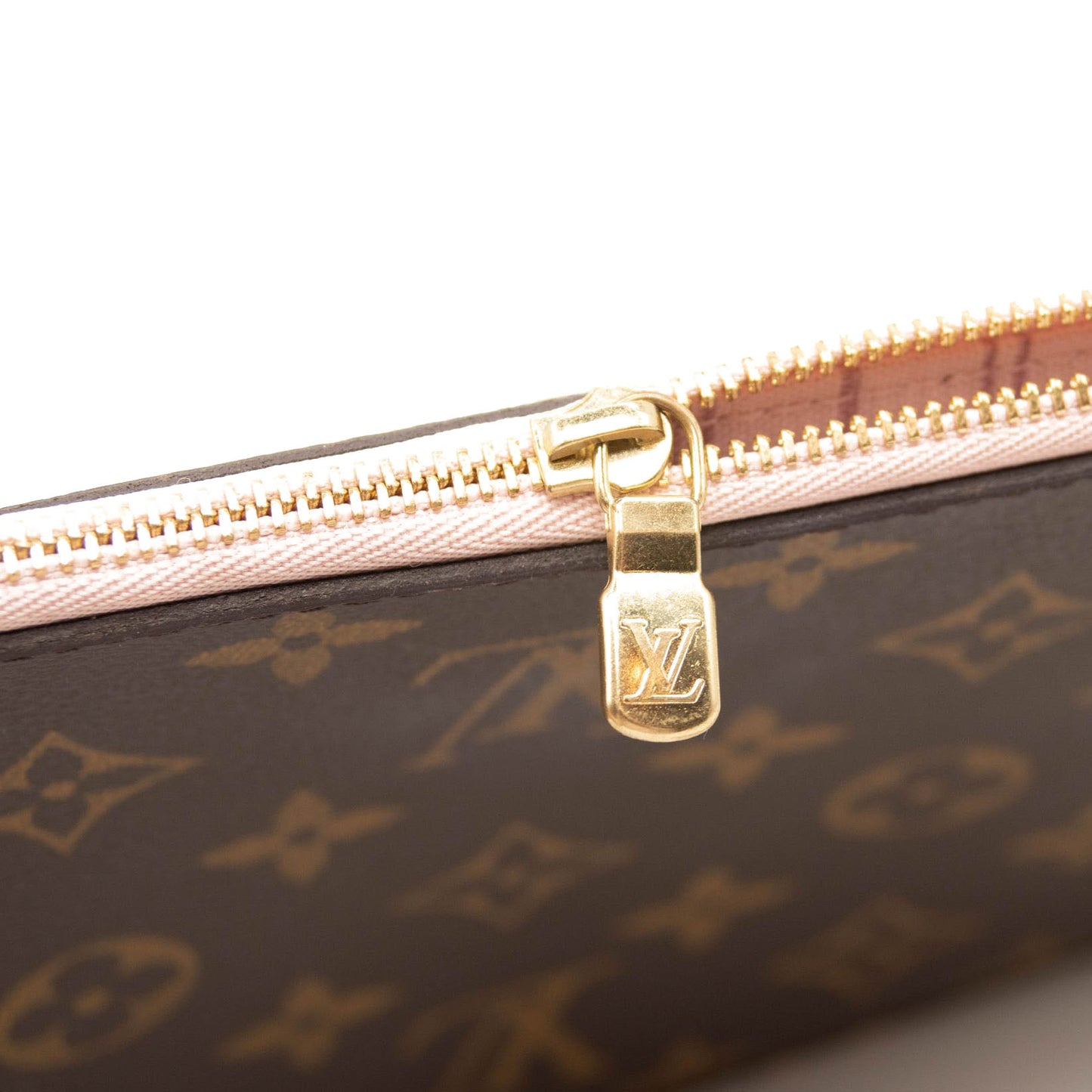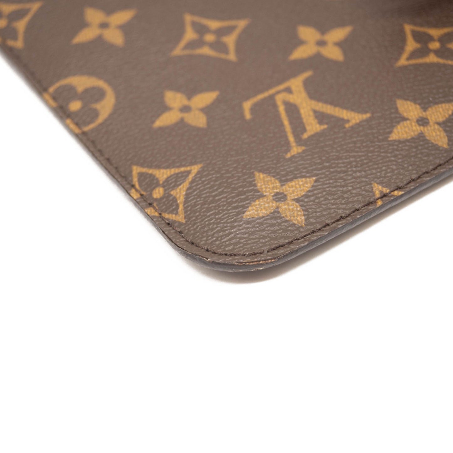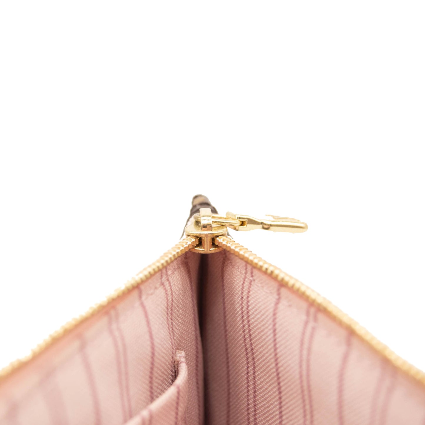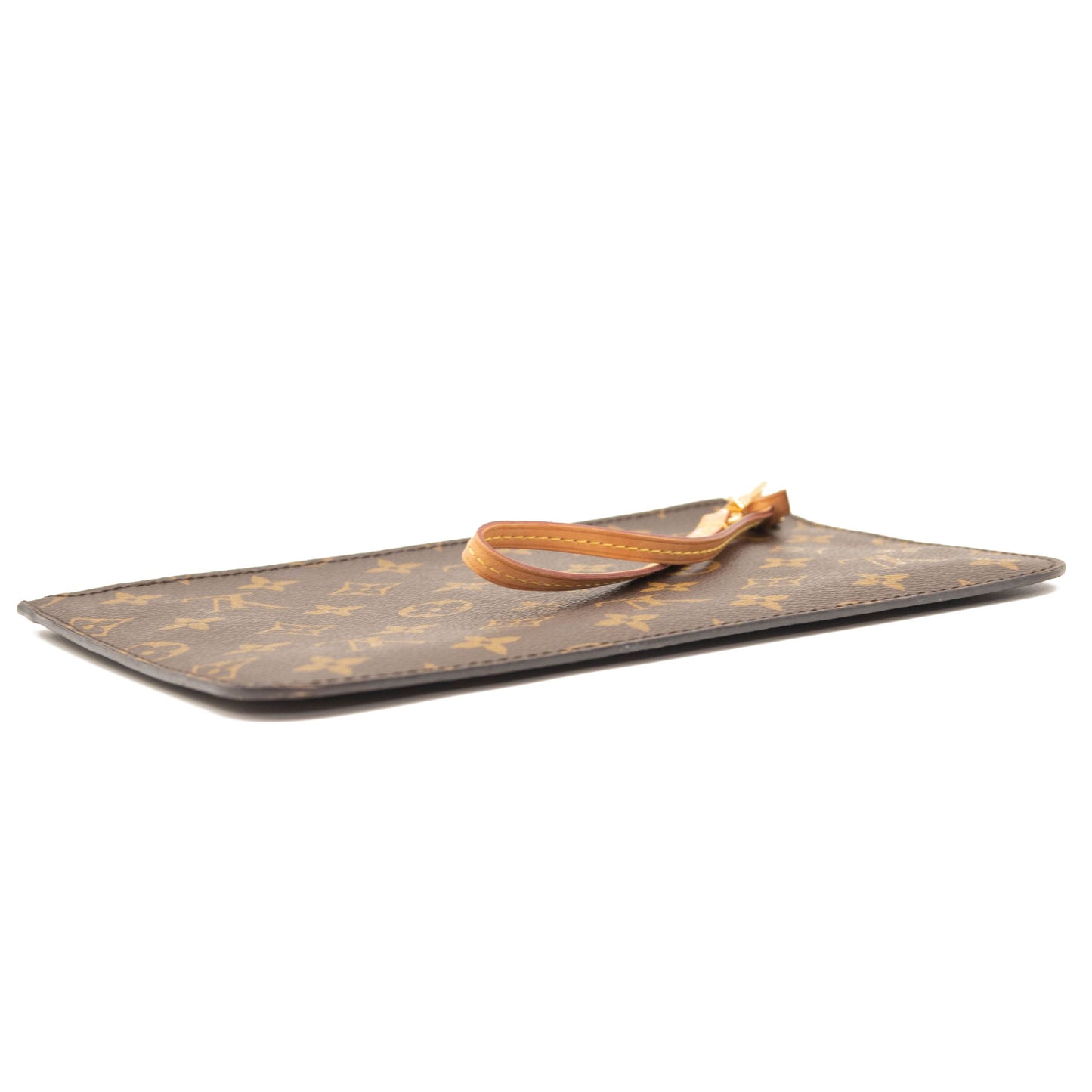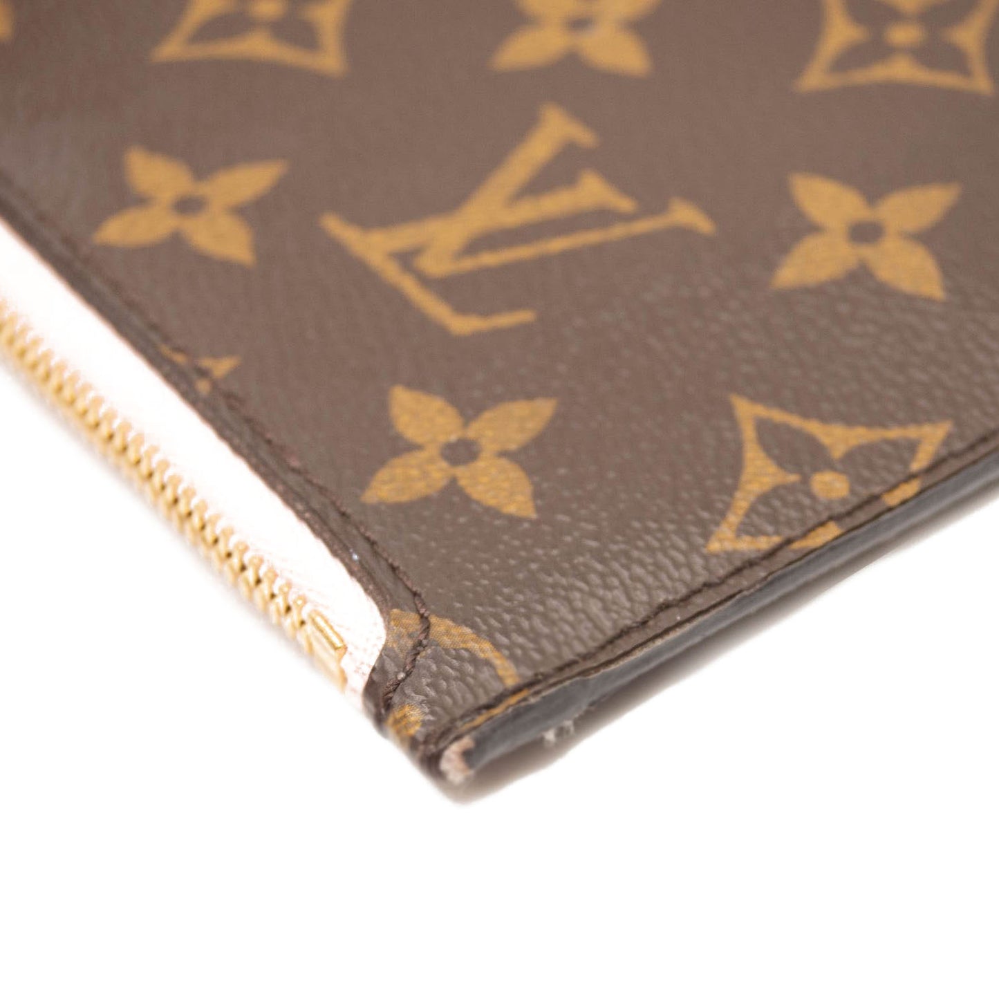 This is an authentic LOUIS VUITTON Monogram Neverfull MM GM Pochette in Rose Ballerine. This chic pouch is made of traditional Louis Vuitton monogram coated canvas. The pouch features polished gold hardware and a vachetta natural leather wrist strap. The top zipper opens to pink striped fabric interior with a pocket.