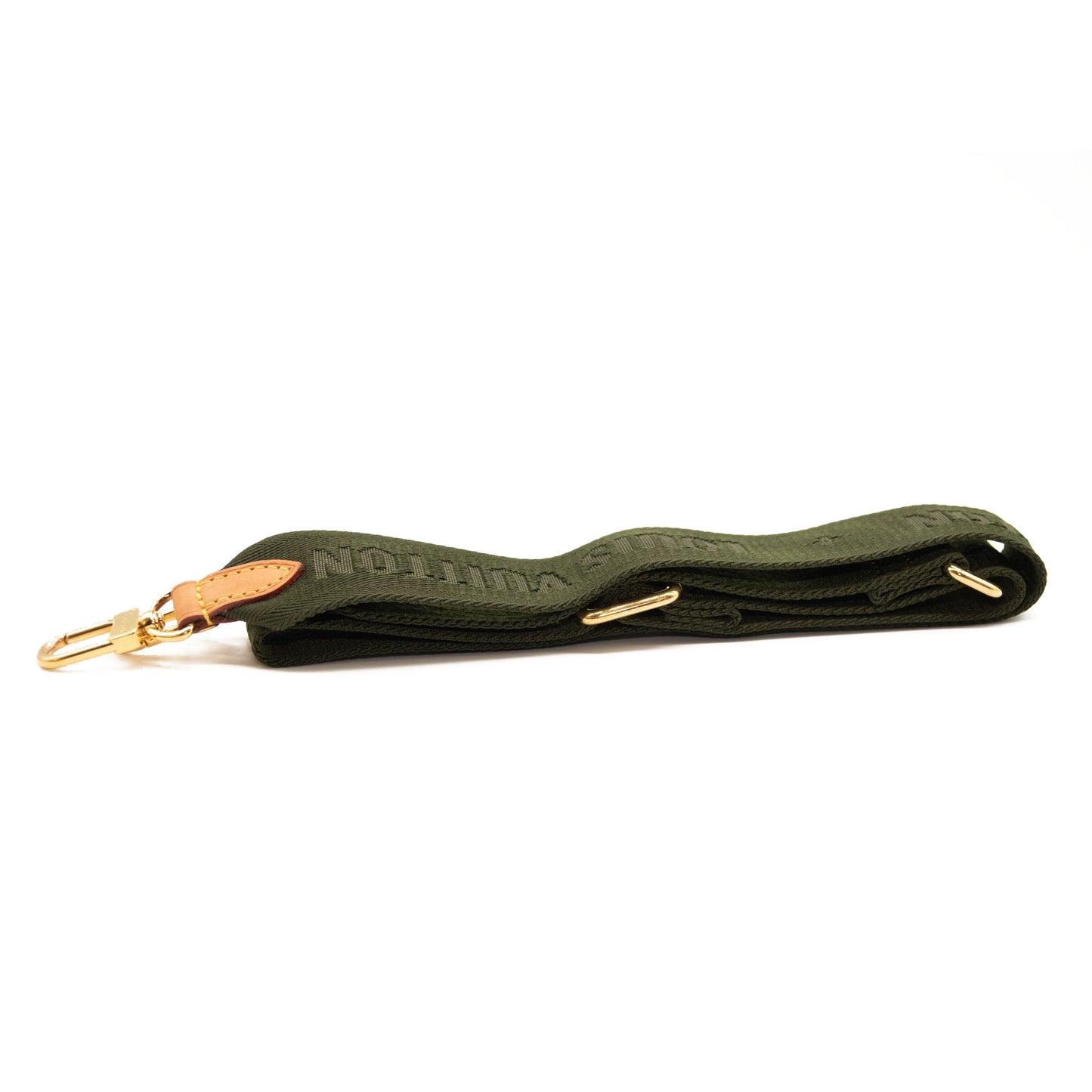 This is an authentic LOUIS VUITTON Monogram New Wave Multi Pochette Accessories Shoulder Strap in Khaki. This adjustable strap is crafted of olive green nylon with the Louis Vuitton Paris logo embroidered throughout. The strap has cowhide leather trim and aged brass metal D-ring clasps for your tote or other Louis Vuitton handbag with D-rings.
