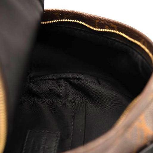 This is the authentic LOUIS VUITTON Monogram Palm Springs Backpack Mini. This petite backpack is crafted of classic monogram coated canvas, with black calfskin leather trim. The backpack features a padded black leather top handle, removable adjustable shoulder strap, and a front zipper pocket. The brass wrap-around zipper opens to a black fabric interior with a patch pocket.