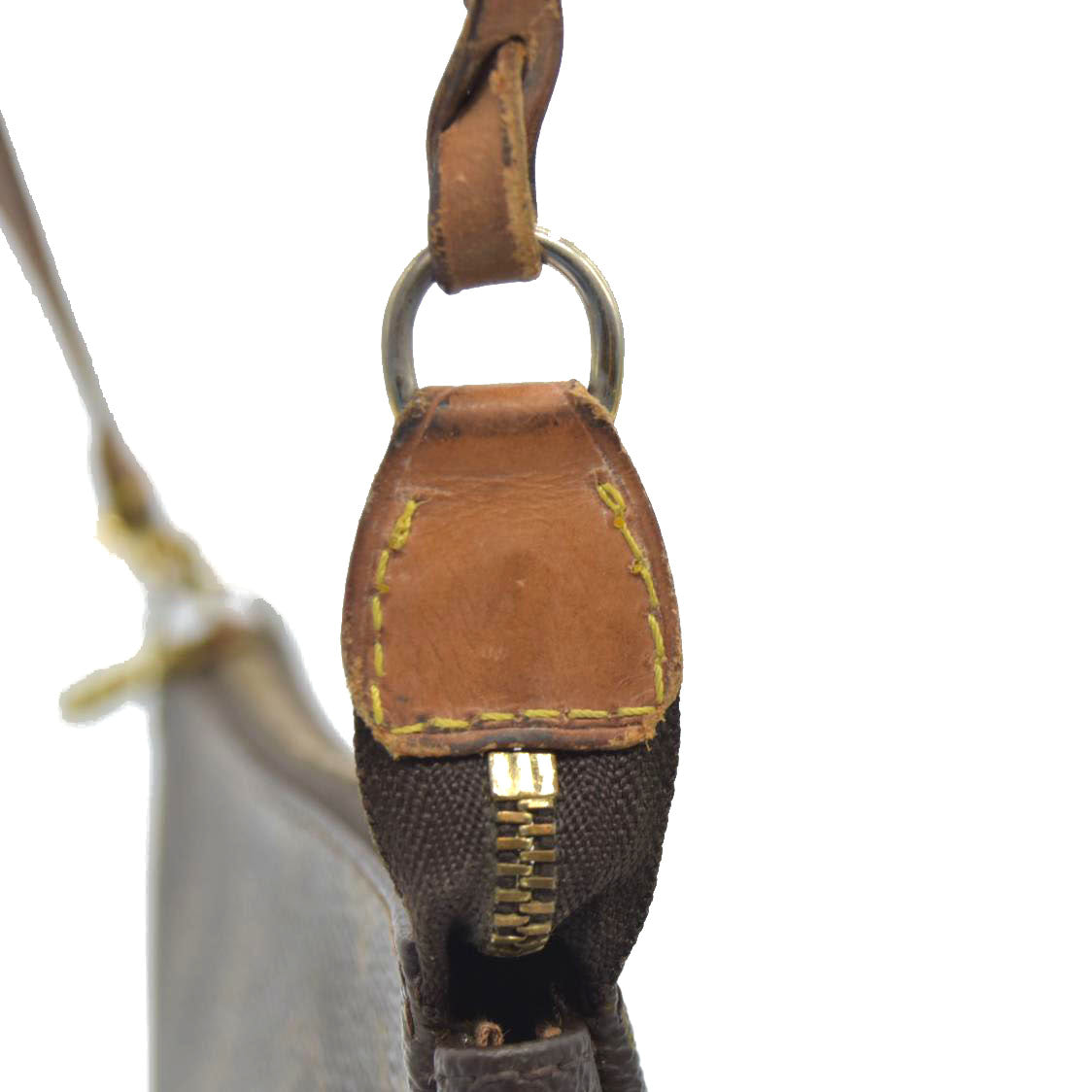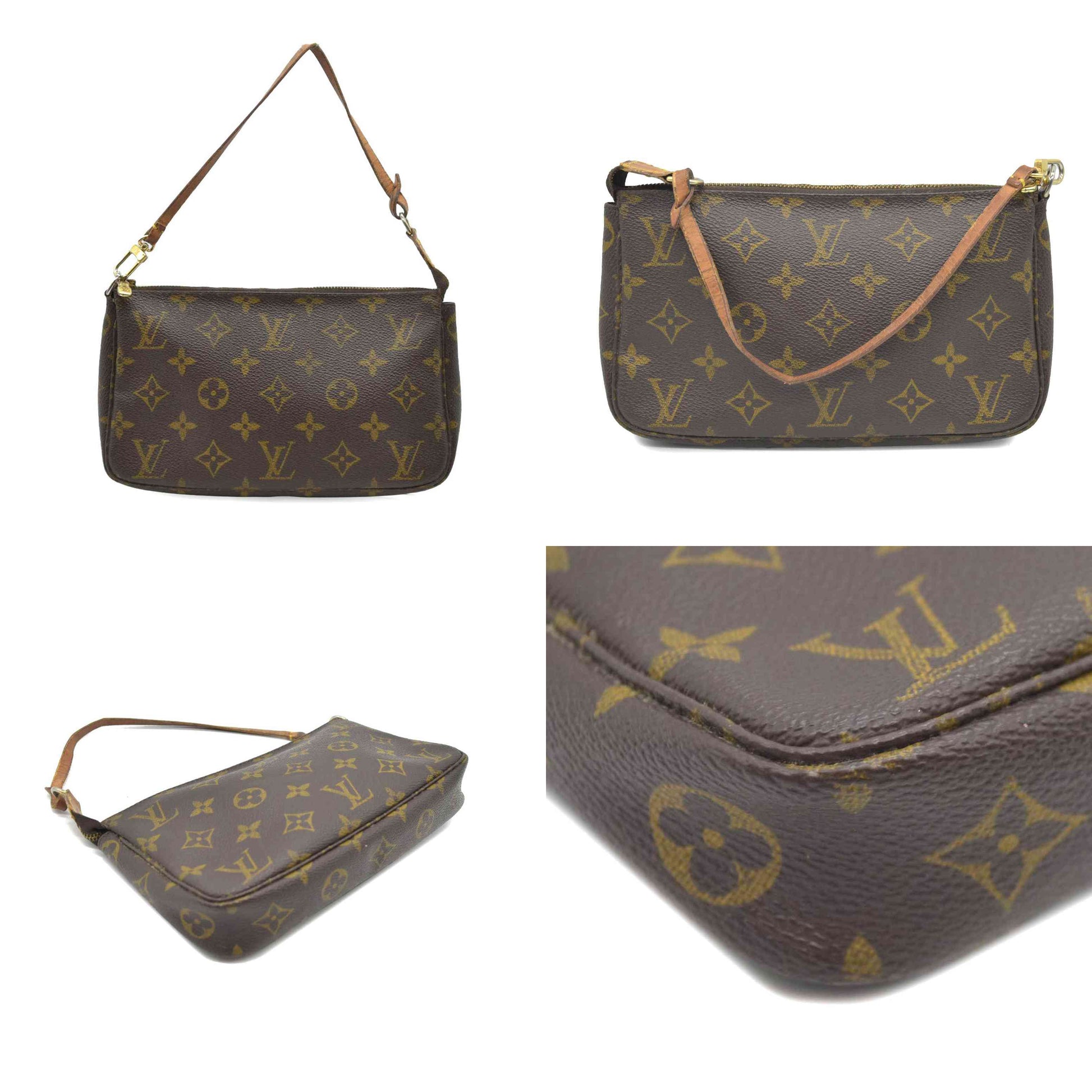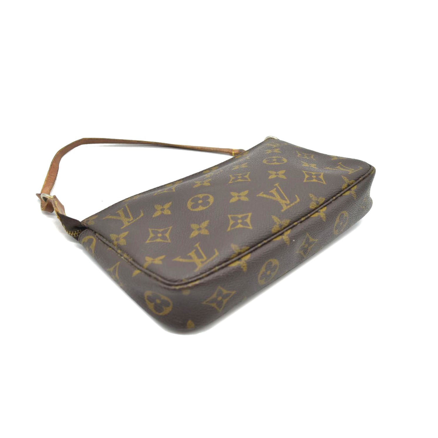This is an authentic LOUIS VUITTON Monogram Pochette Accessories. This pochette is crafted of signature Louis Vuitton monogram coated canvas. The bag features a vachetta strap and polished gold hardware. The gold top zipper opens to a brown fabric interior.