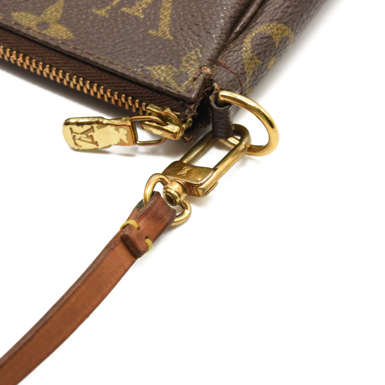 This is an authentic LOUIS VUITTON Monogram Pochette Accessories NM. This pochette is crafted of signature Louis Vuitton monogram coated canvas. The bag features a vachetta wristlet strap and polished gold-toned hardware. The top zipper opens to a cocoa brown fabric interior with a patch pocket.
