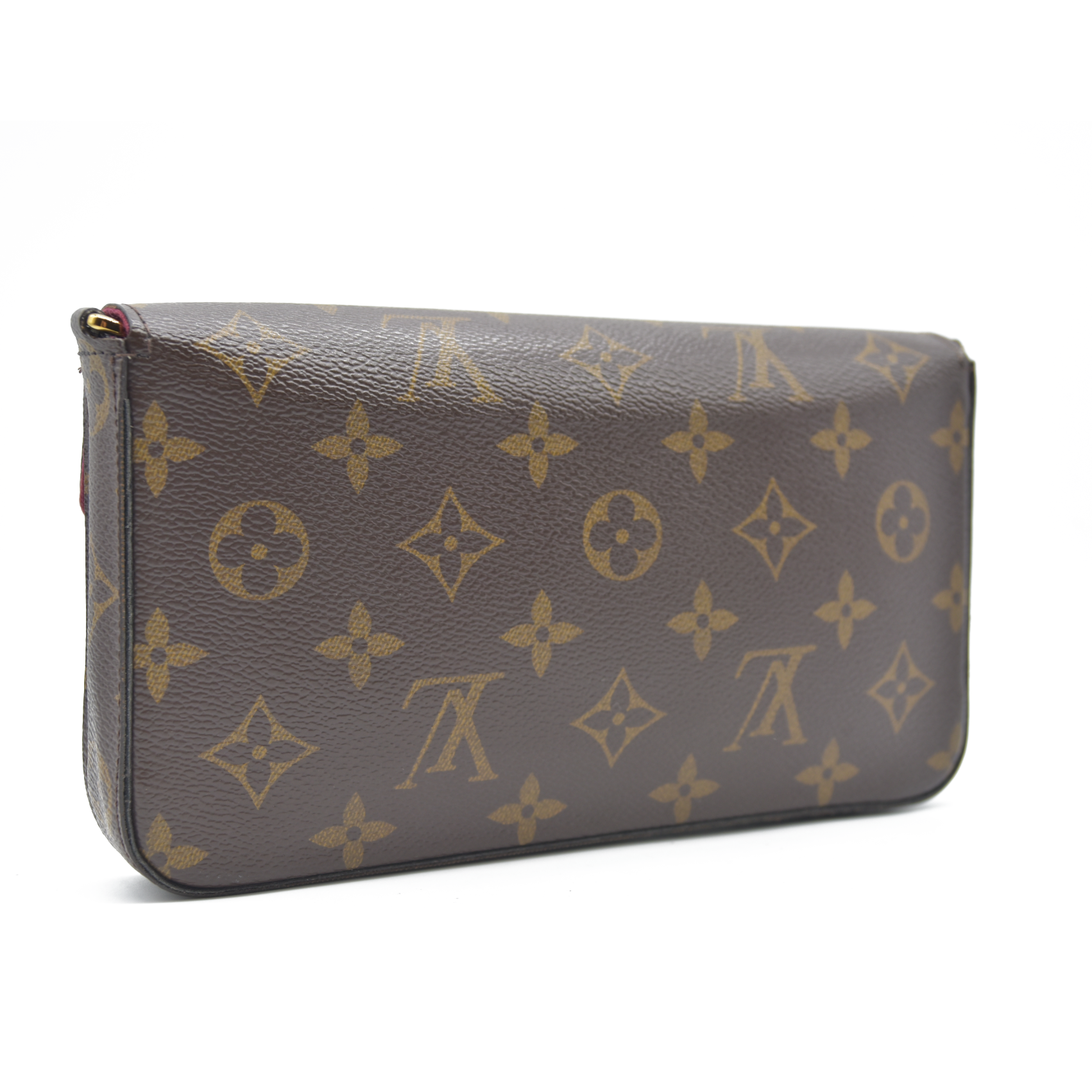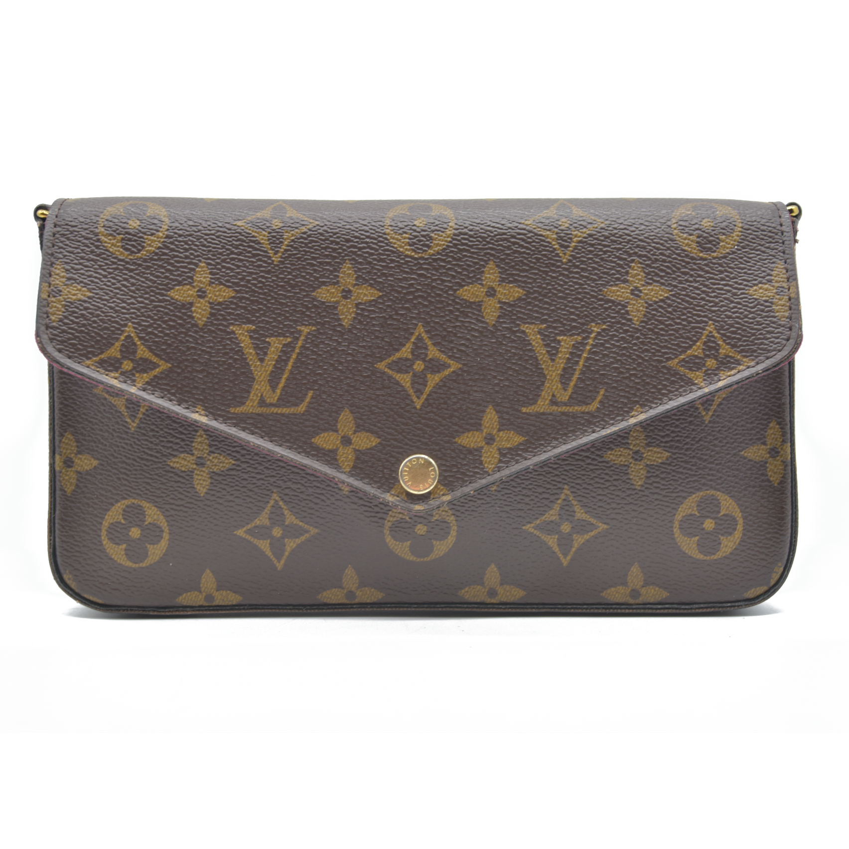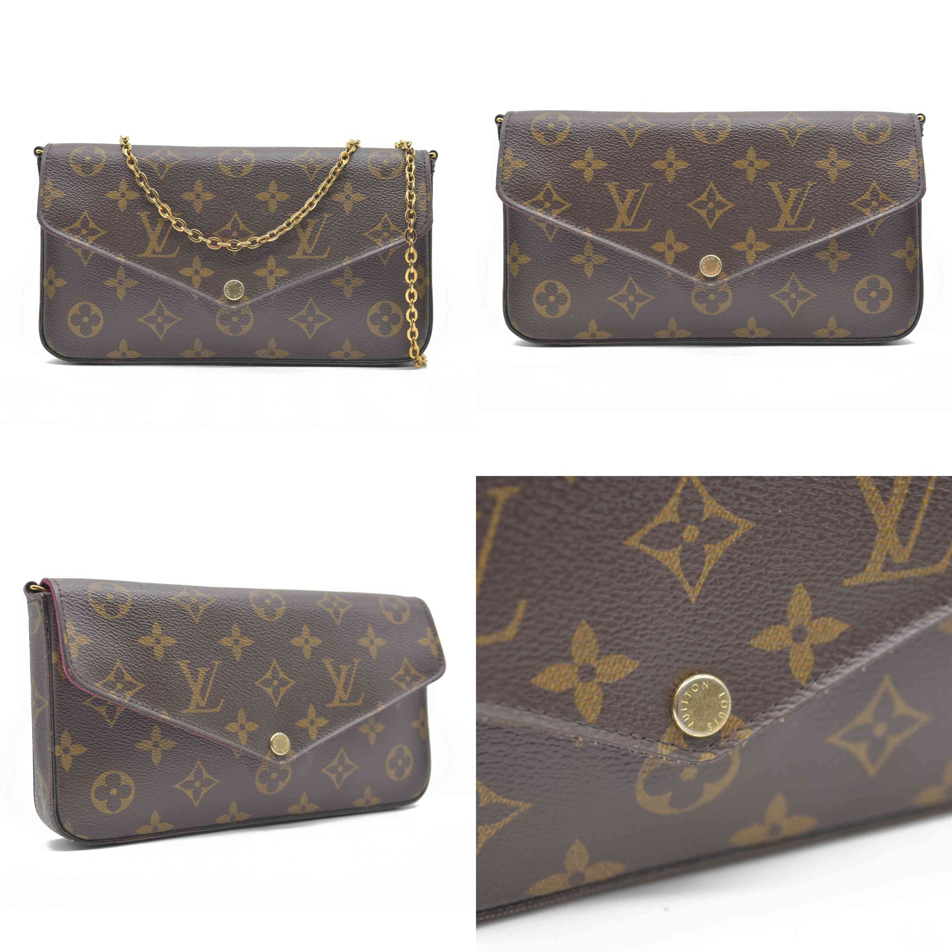 This is an authentic LOUIS VUITTON Monogram Pochette Felicie Chain Wallet in Fuchsia. This stylish wallet is crafted of classic Louis Vuitton monogram coated canvas. The shoulder bag features an optional polished brass chain link shoulder strap, and a matching brass snap on the envelope-style crossover flap. This opens the bag to a dark fuchsia fabric interior with a patch pocket. This is a fabulous bag that is practical for day or evening use, with the luxury and style of Louis Vuitton!