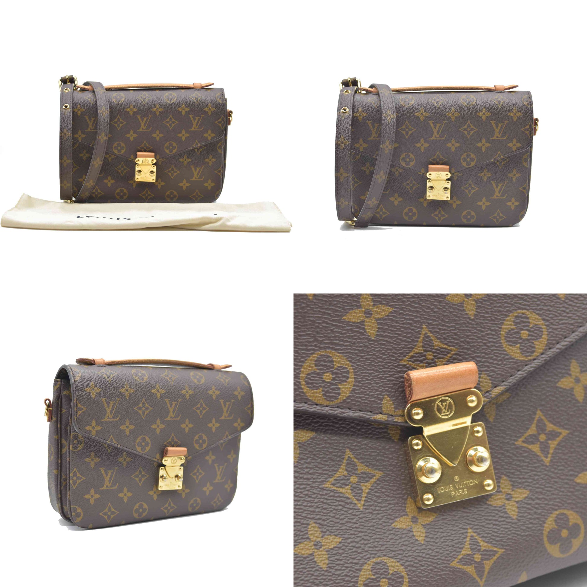 This is an authentic LOUIS VUITTON Monogram Pochette Metis. This chic handbag is finely crafted of classic Louis Vuitton monogram toile canvas. The shoulder bag features a vachetta cowhide leather handle, an optional adjustable monogram canvas shoulder strap, a rear exterior zipper pocket, and a V-shaped front flap with a polished brass S-lock. The flap opens to a partitioned brown microfiber interior with a patch pocket.