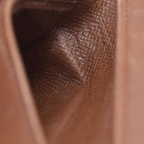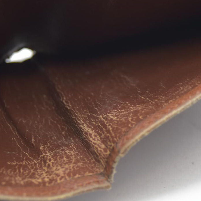 The exterior is rubbed with scratches. There are loose stitches around the folding area. The date code/serial number is rubbed off and unable to be read. The inside of cash compartment is peeled. The corners are rubbed.