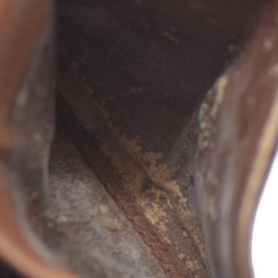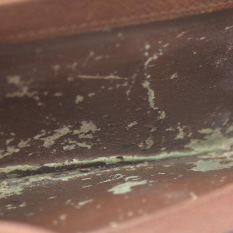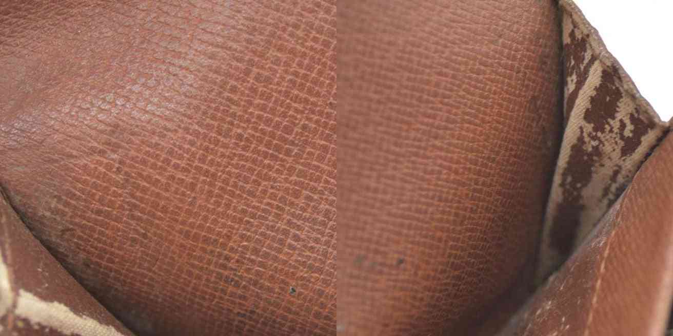 The exterior is rubbed with scratches. There are loose stitches around the folding area. There are rubbed marks on the inside. The inside of Coin purse is peeled. The date code/serial number is rubbed off and unable to be read.