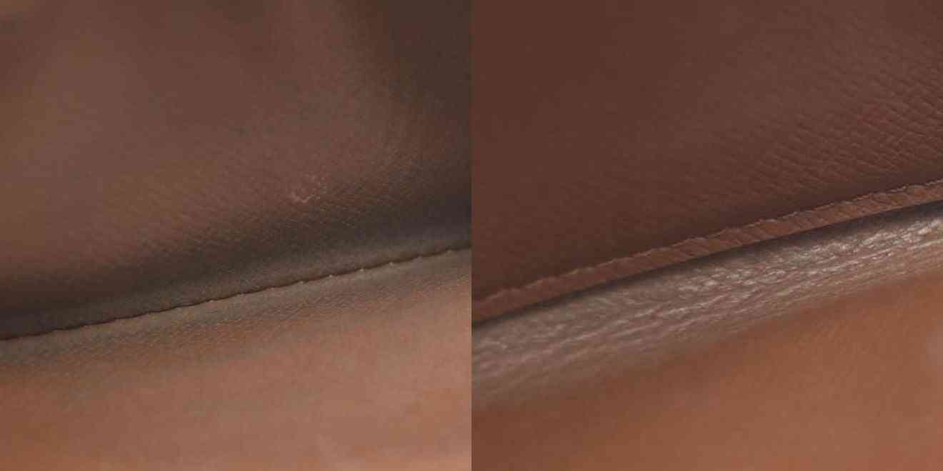 The exterior is rubbed with scratches. There are loose stitches around the folding area. There are rubbed marks on the inside.