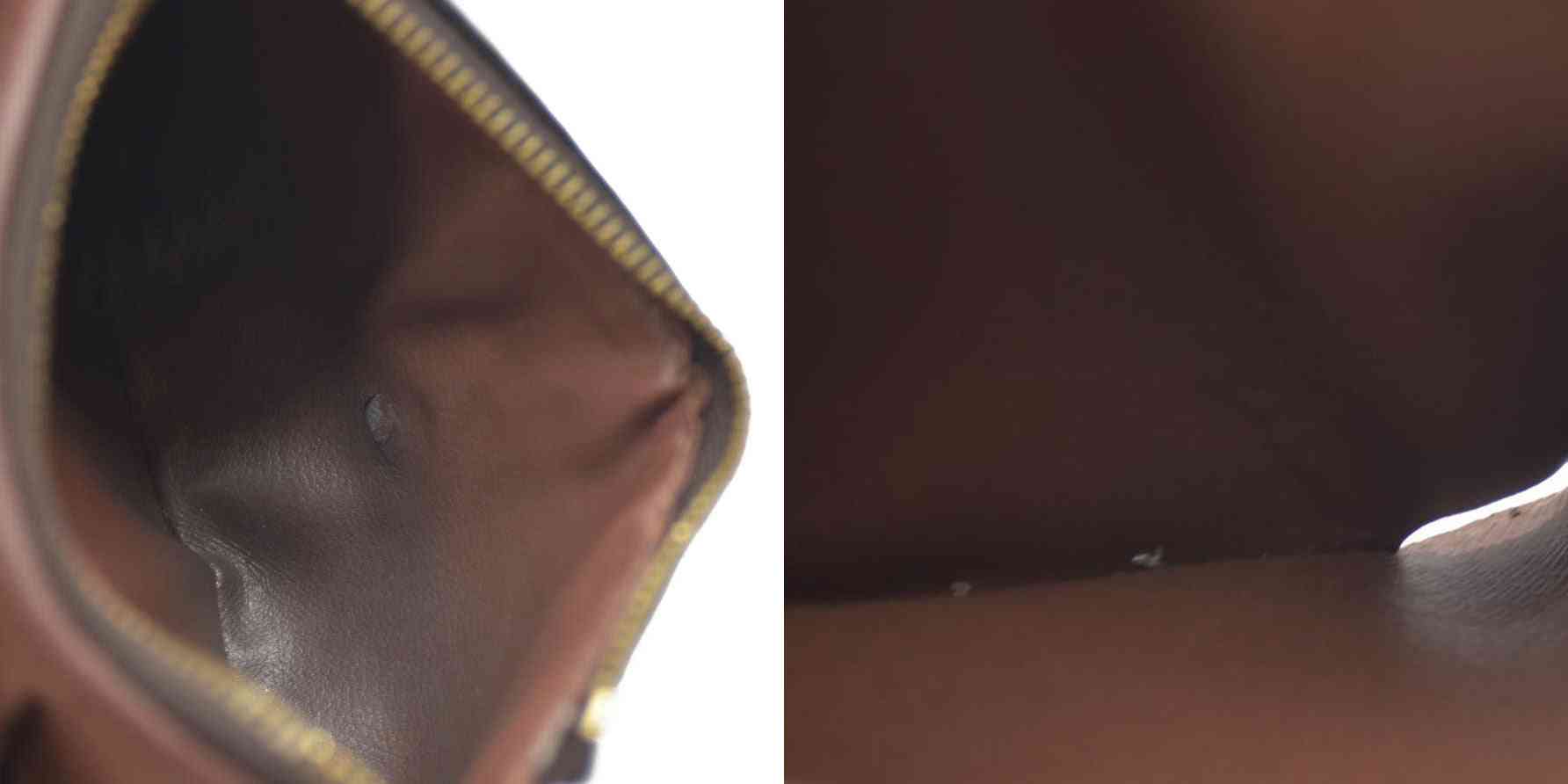The exterior is rubbed with scratches. There are loose stitches around the folding area. There are rubbed marks on the inside. This product has a built-in NFC tag. The leather part has cracks.