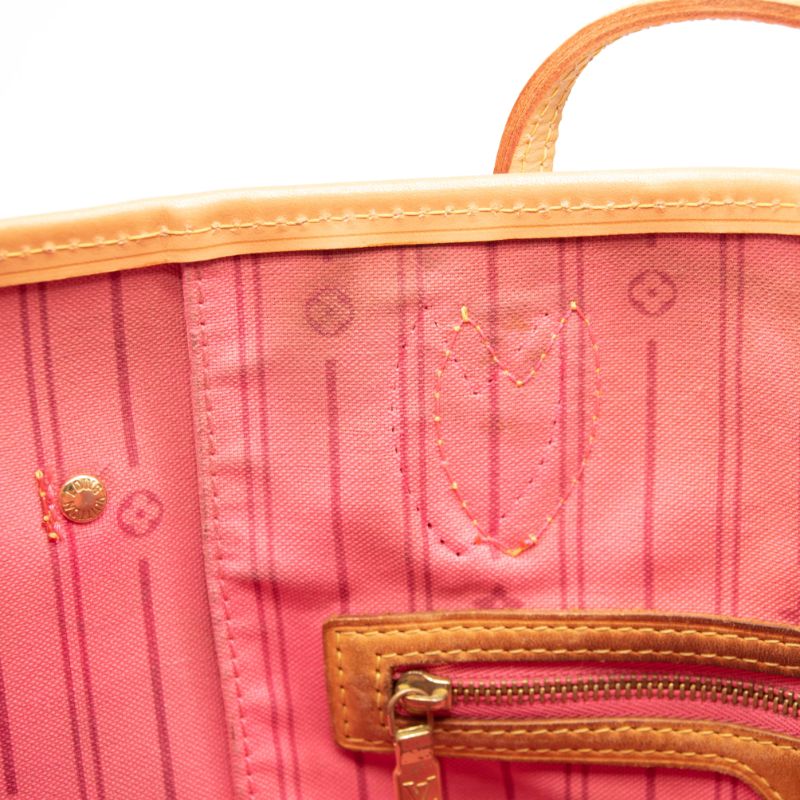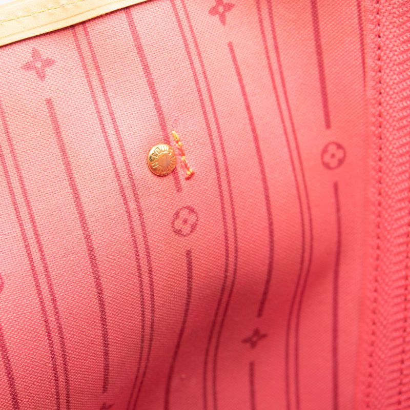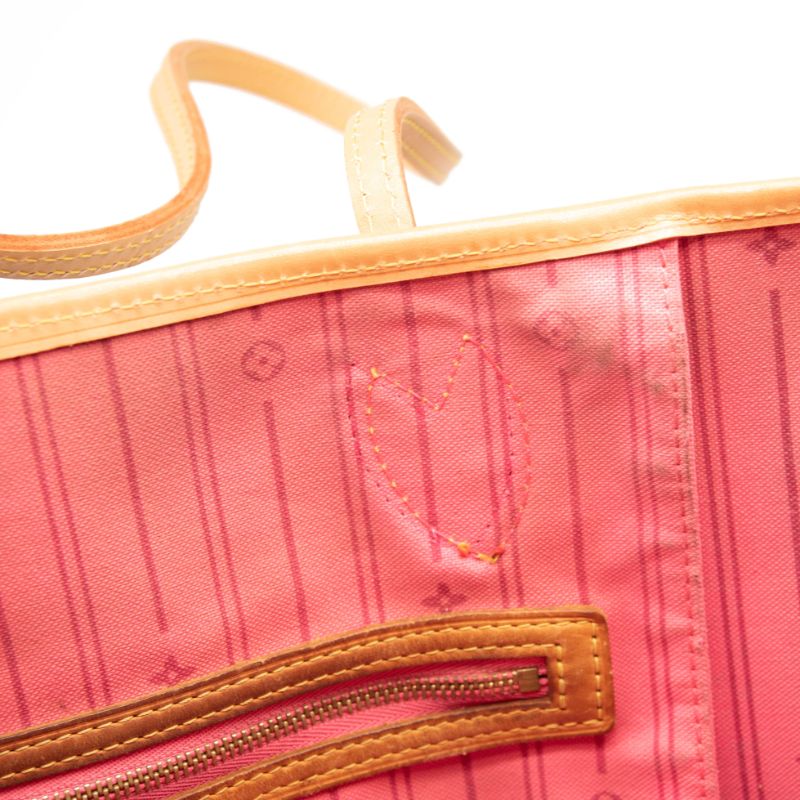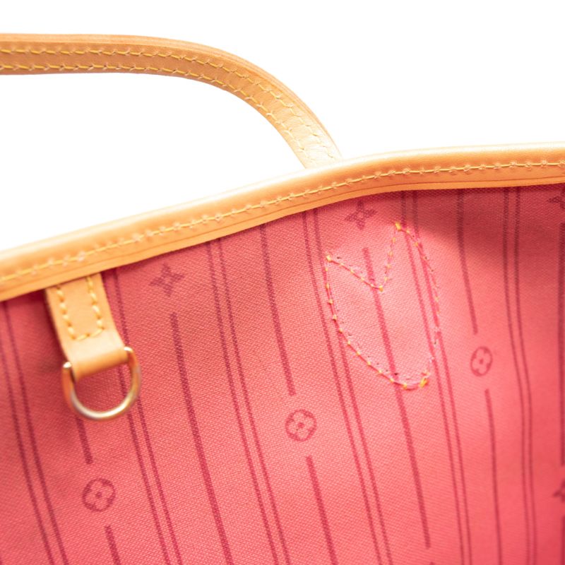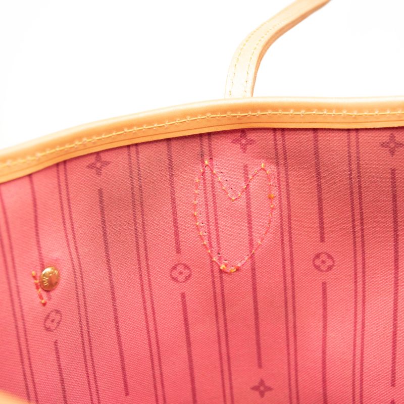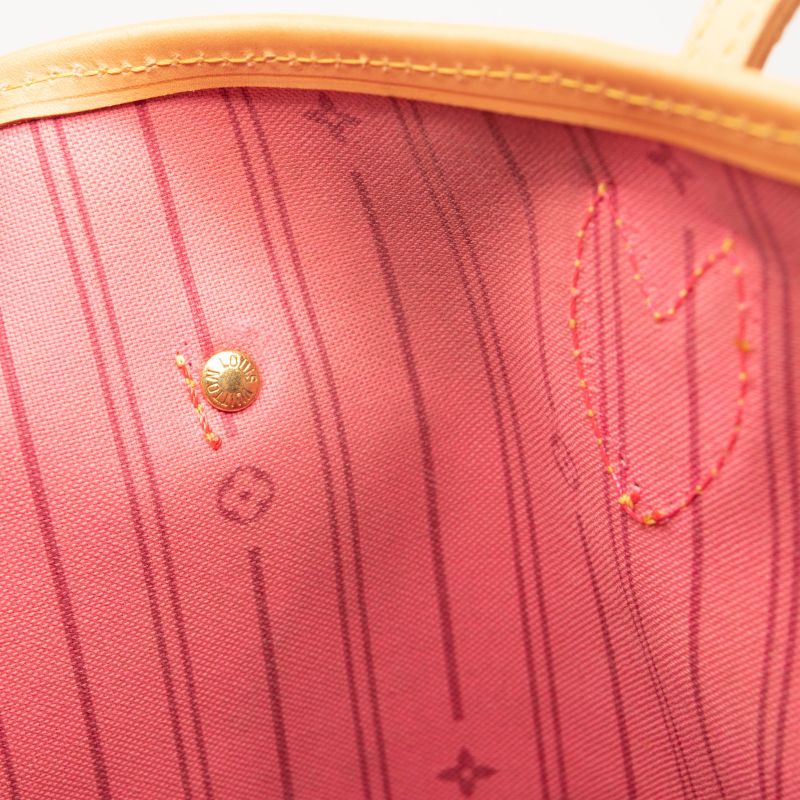This is an authentic LOUIS VUITTON Monogram Roses Neverfull MM. This beautiful tote is crafted of classic Louis Vuitton monogram coated canvas, with a painted bright pink and orange, rose print overlay. The bag features vachetta cowhide leather trim, handles, and side cinch cords with polished brass hardware. The top is open to a striped vibrant pink fabric interior with a zipper pocket.