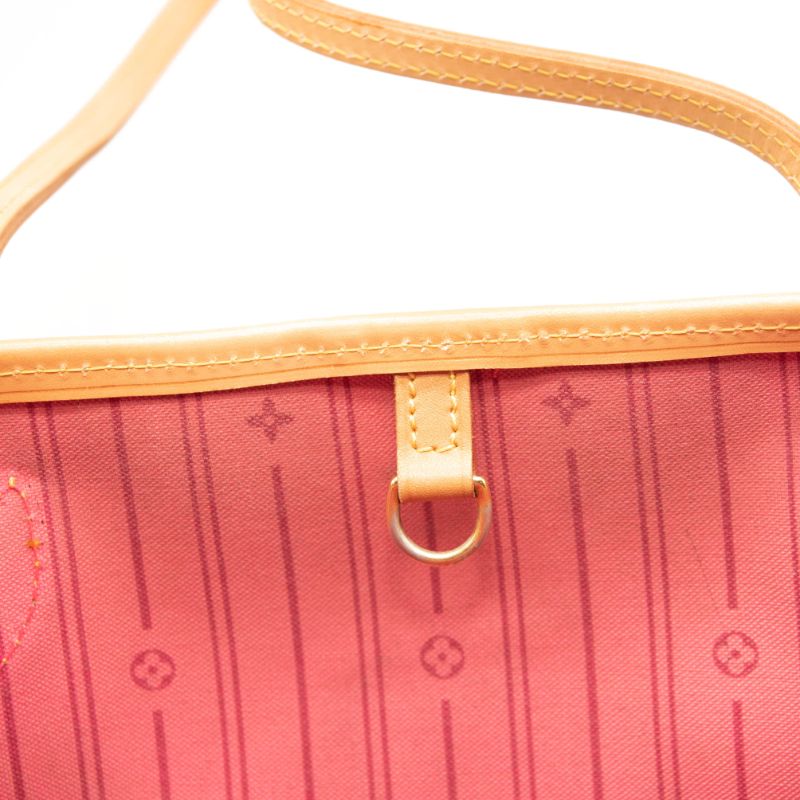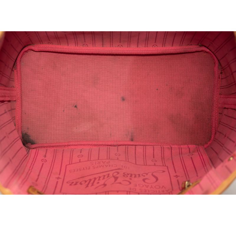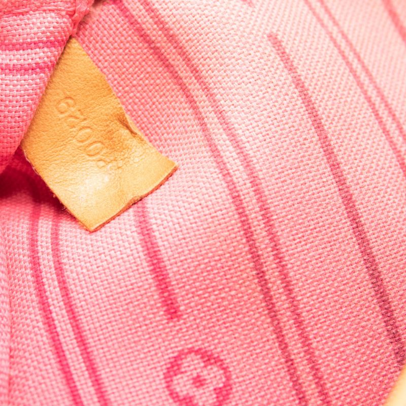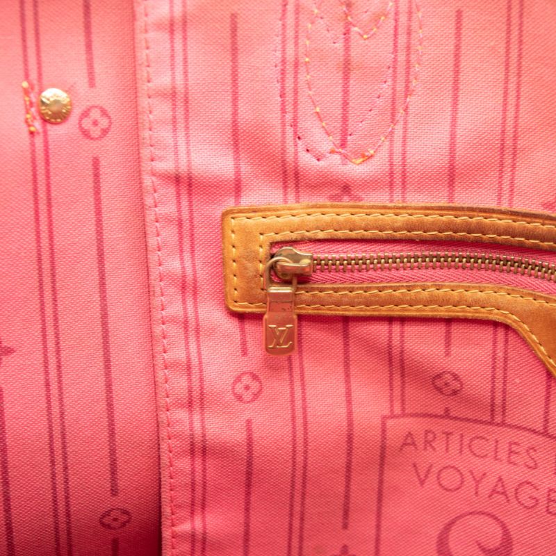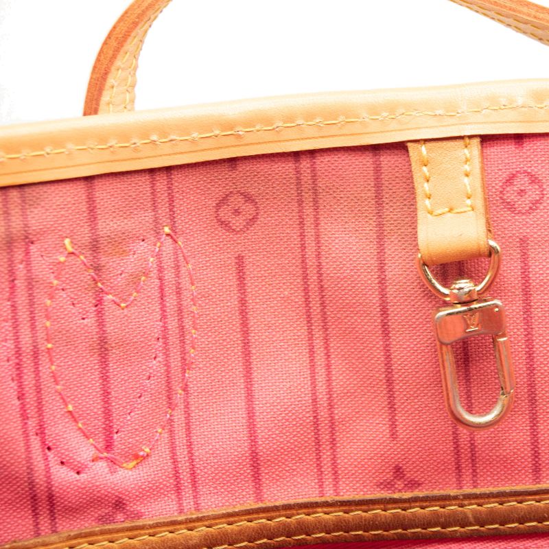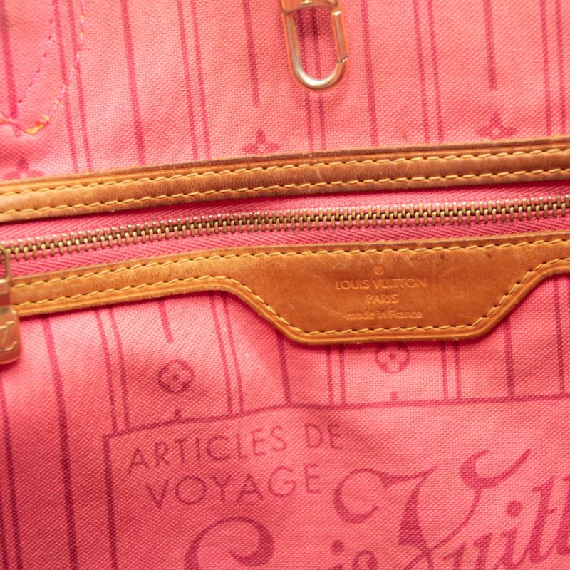 This is an authentic LOUIS VUITTON Monogram Roses Neverfull MM. This beautiful tote is crafted of classic Louis Vuitton monogram coated canvas, with a painted bright pink and orange, rose print overlay. The bag features vachetta cowhide leather trim, handles, and side cinch cords with polished brass hardware. The top is open to a striped vibrant pink fabric interior with a zipper pocket.