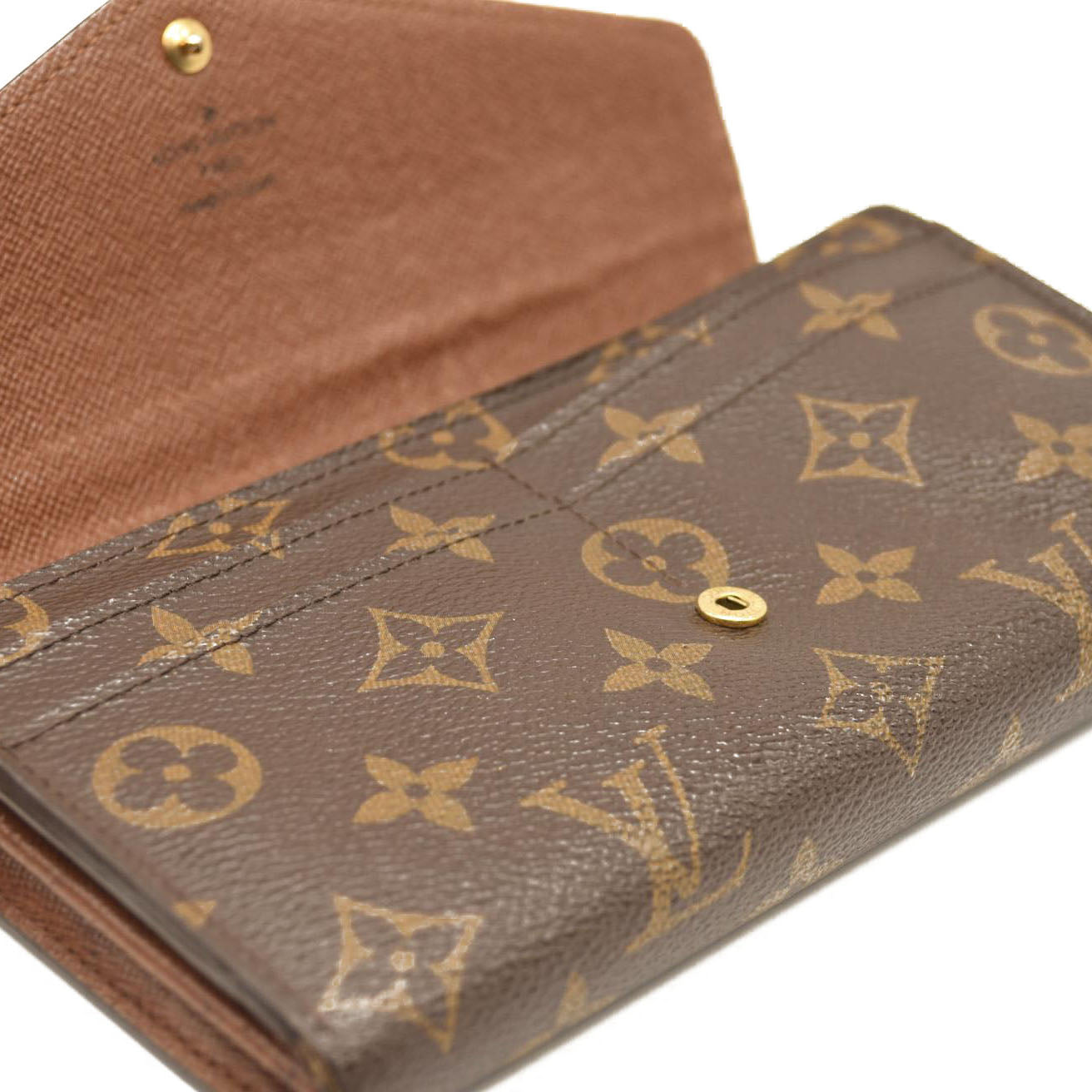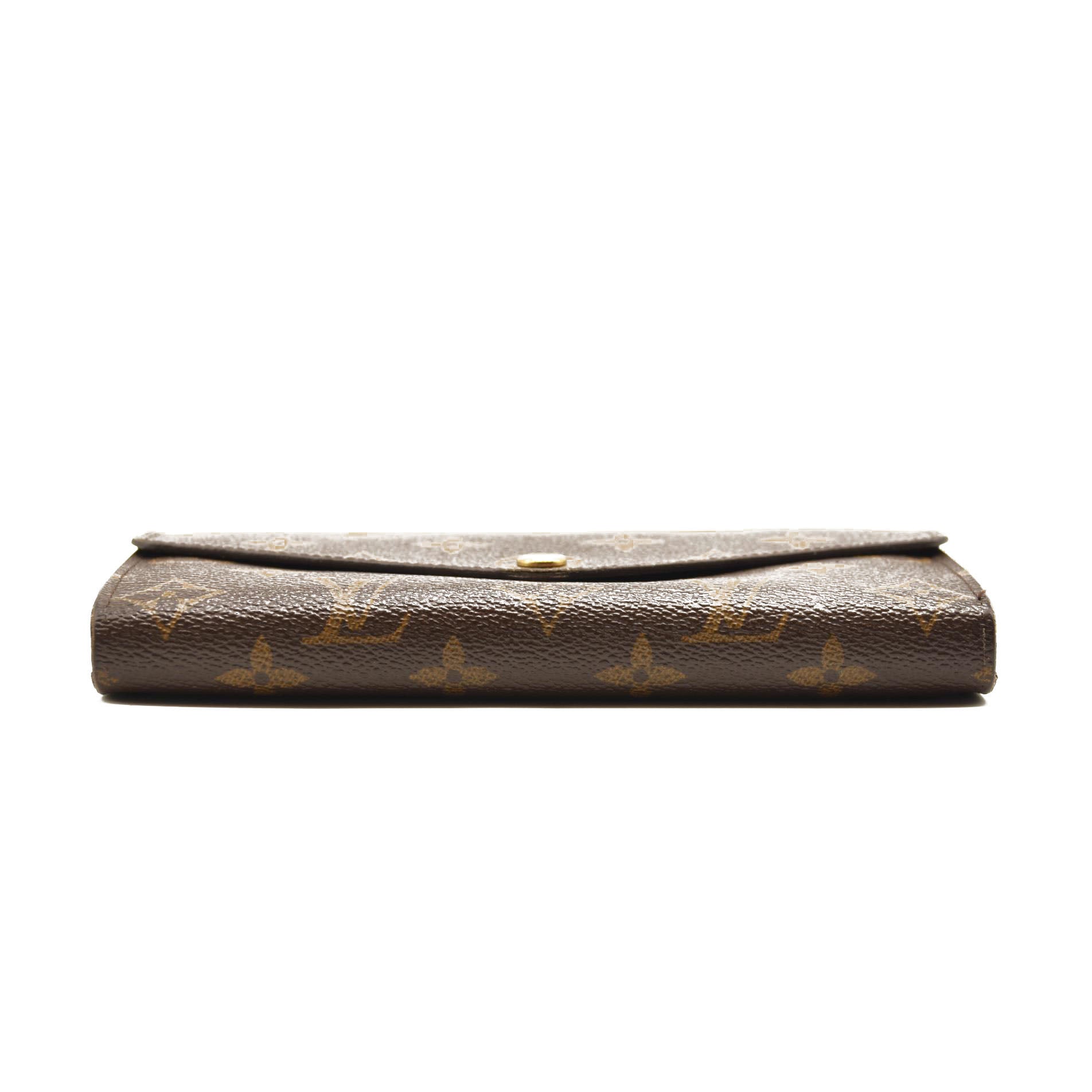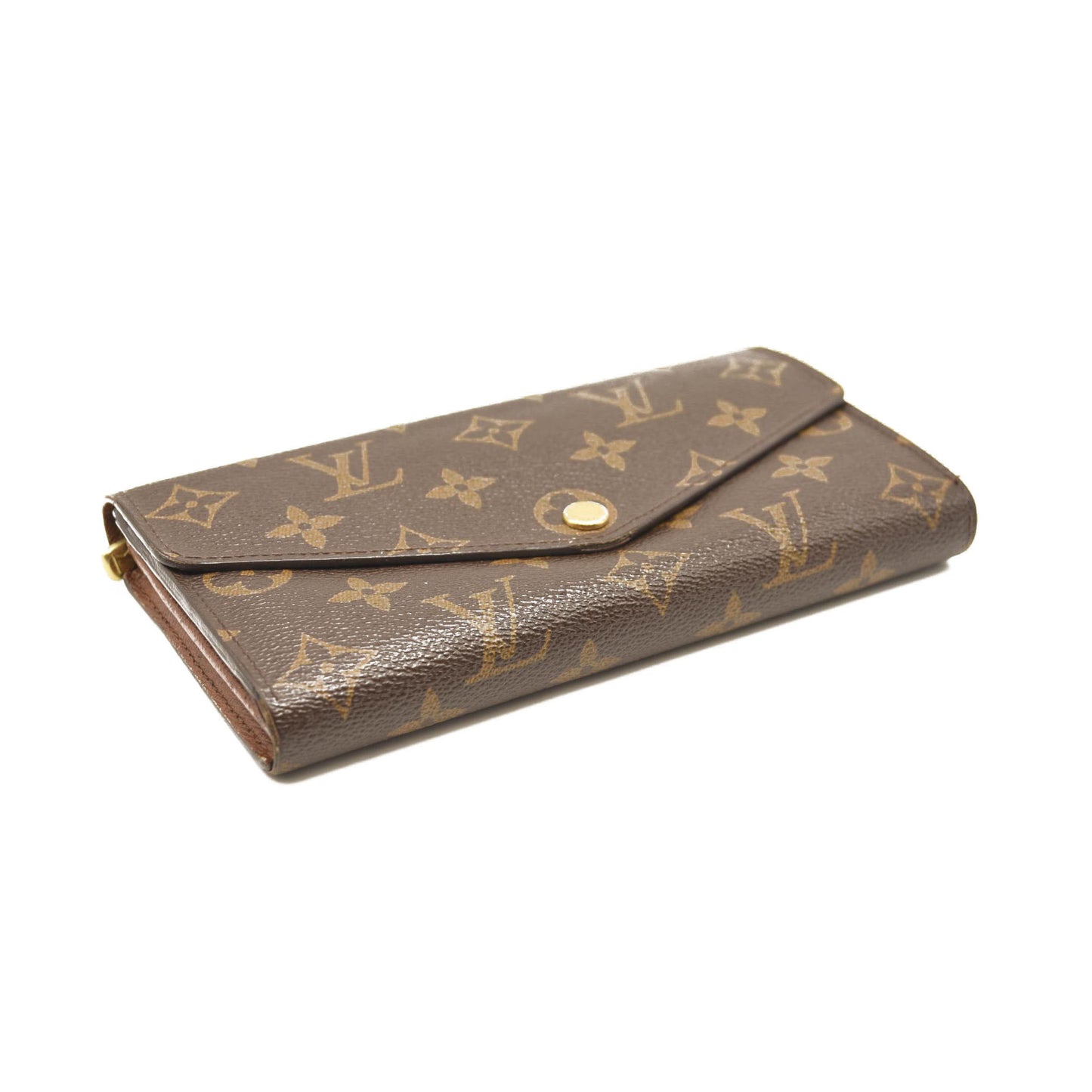 This is an authentic LOUIS VUITTON Monogram Sarah Wallet NM. This wallet is crafted of traditional Louis Vuitton monogram toile canvas. The envelope-style crossover flap opens with a polished brass snap to a partitioned terra cotta cross-grain leather interior with card slots, patch pockets, a central zippered compartment.