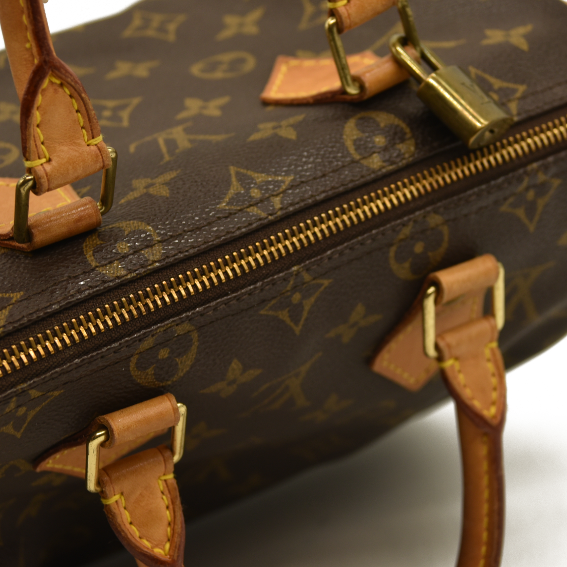 This is an authentic LOUIS VUITTON Monogram Speedy 25. This iconic small tote is crafted of signature Louis Vuitton monogram on toile canvas. This bag features vachetta cowhide leather top handles and trim with polished brass hardware. The top zipper opens to a complimentary cocoa brown fabric interior with a patch pocket. This is an excellent classic handbag that is ideal for everyday with the luxury and style of Louis Vuitton!