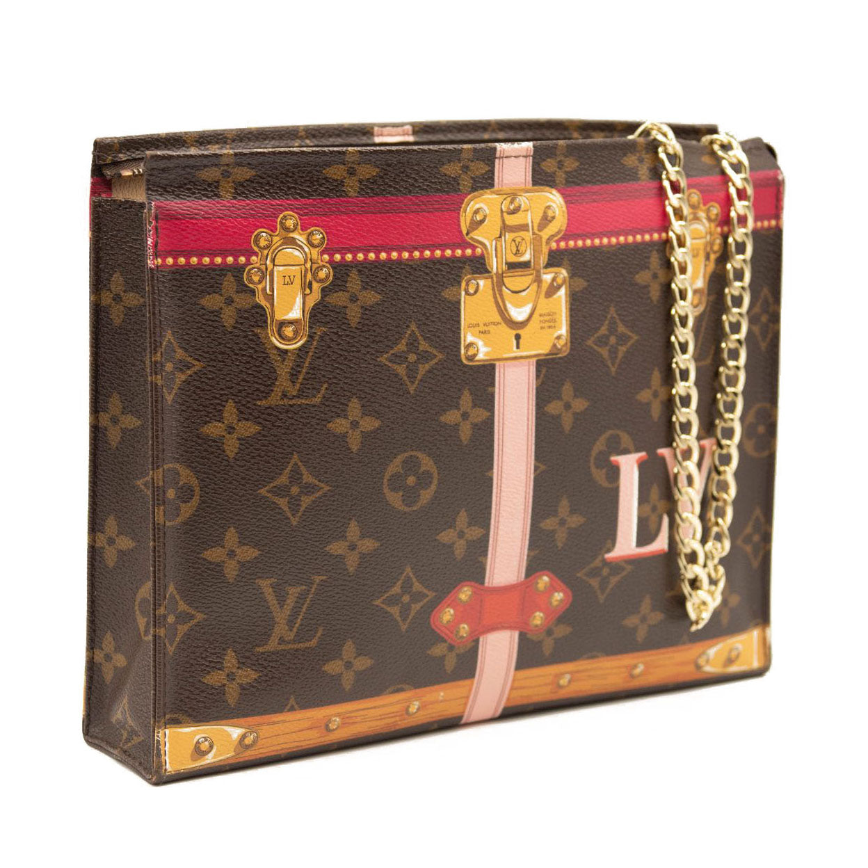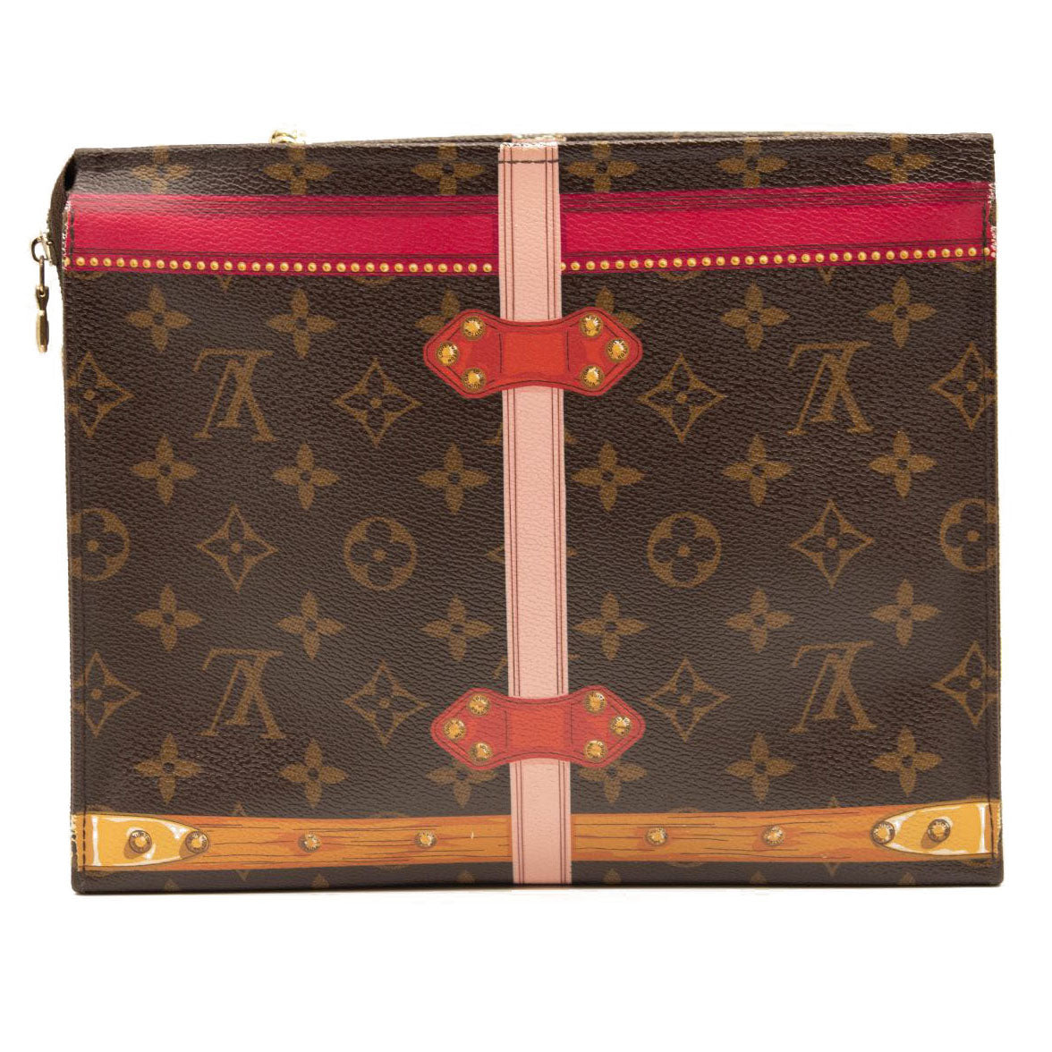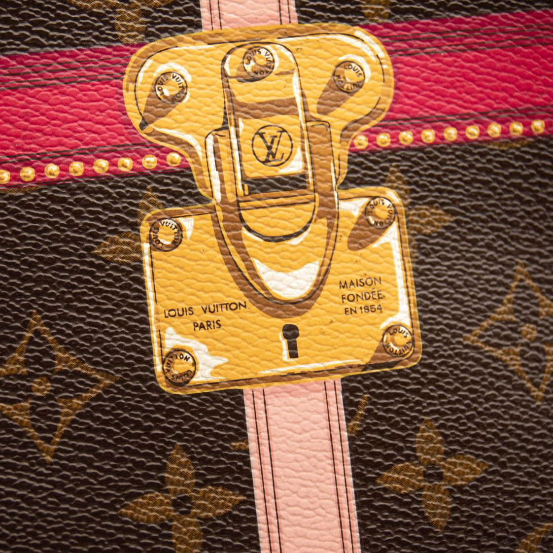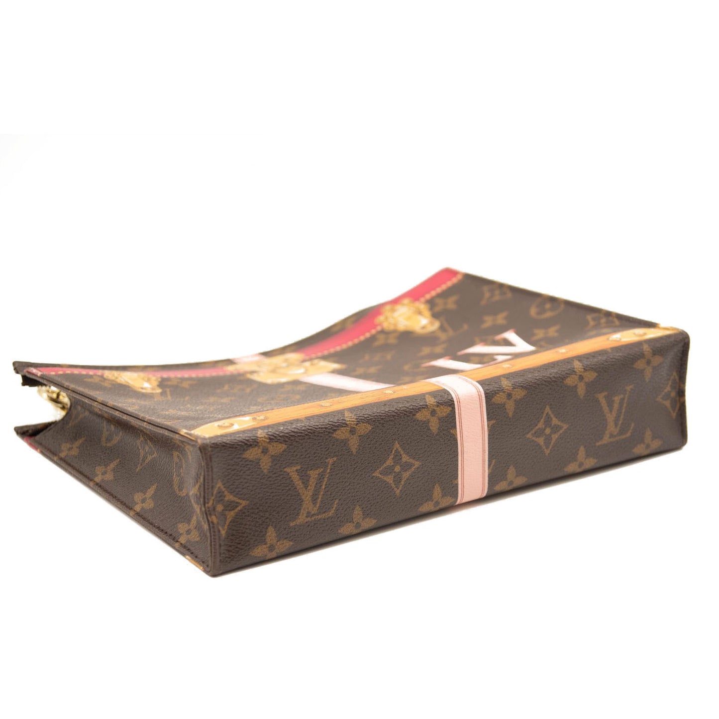 This is an authentic LOUIS VUITTON Monogram Summer Trunks Toiletry Pouch 26. This large accessory travel case is constructed of signature monogram toile coated canvas with a limited edition print of brightly colored trompe-l'oeil details inspired by Louis Vuitton's historic trunks. The top brass zipper opens to a beige interior. This chic case is ideal for all your travel needs, with the luxury and style by Louis Vuitton!