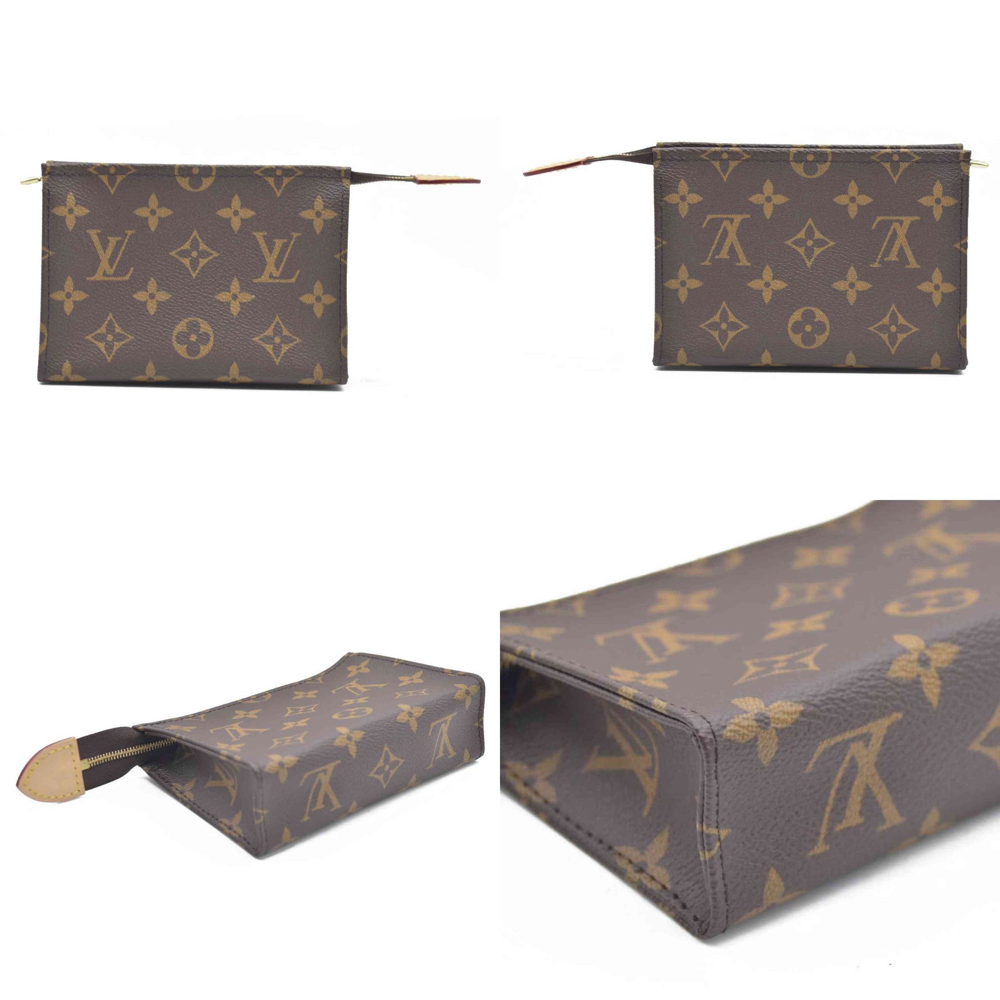 This is an authentic LOUIS VUITTON Monogram Toiletry Pouch 15. This cosmetics pouch is crafted of classic Louis Vuitton monogram coated canvas in brown. The pouch features a gold plated top zipper that opens to a fuchsia leather-like interior.