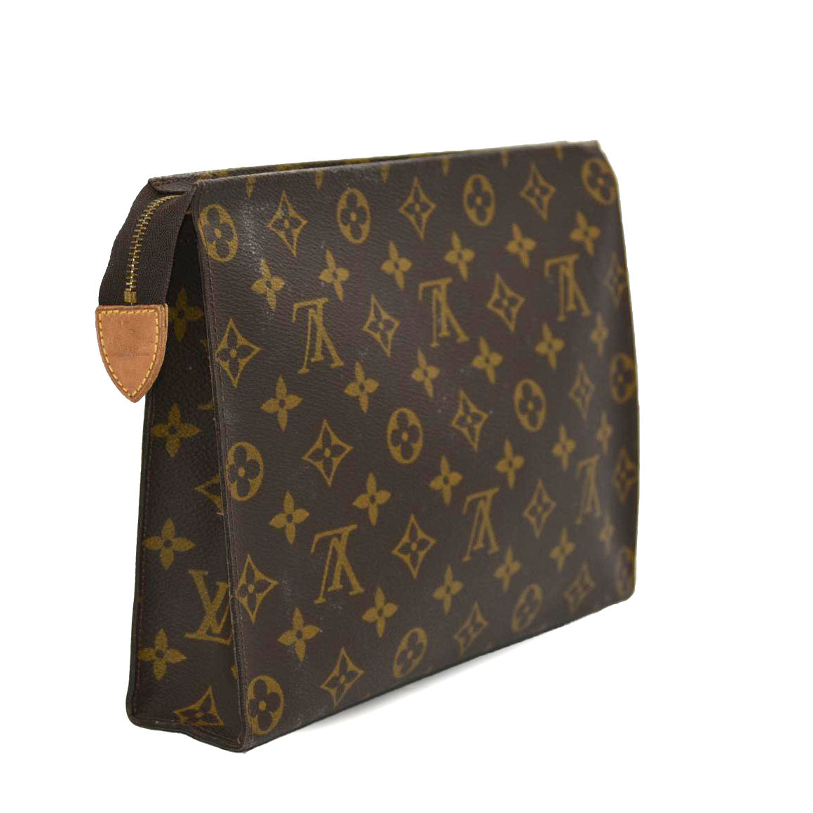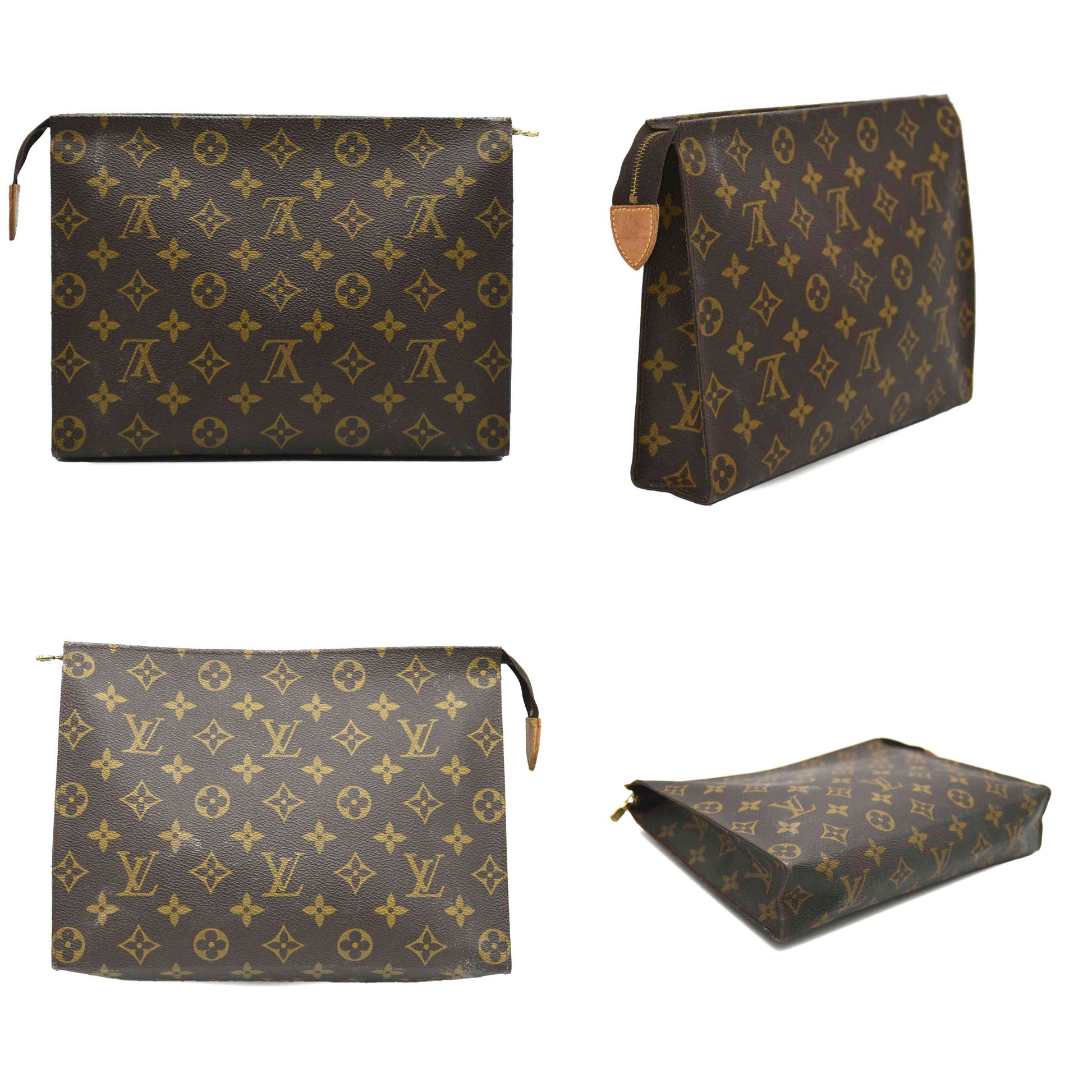 This is an authentic LOUIS VUITTON Monogram Toiletry Pouch 26. This handy travel accessory is crafted of traditional Louis Vuitton monogram on toile coated canvas. The pouch features a top overextended zipper that opens to a spacious vintage brown interior.
